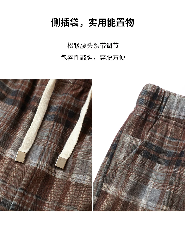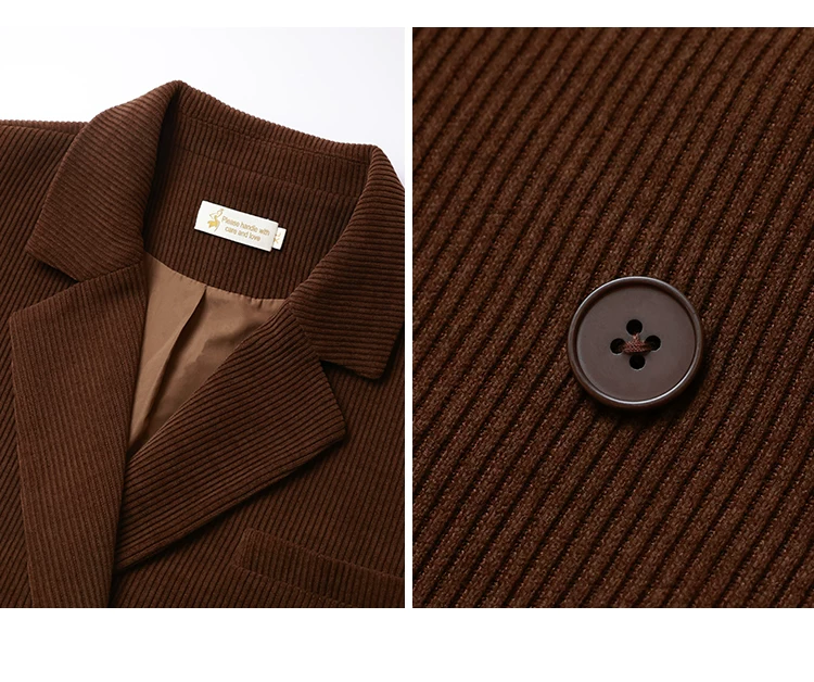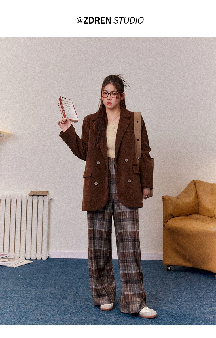 - Bộ đồ nữ cỡ lớn kiểu retro, quần ống rộng kẻ ca rô màu nâu, áo khoác blazer chất liệu corduroy dành cho nữ