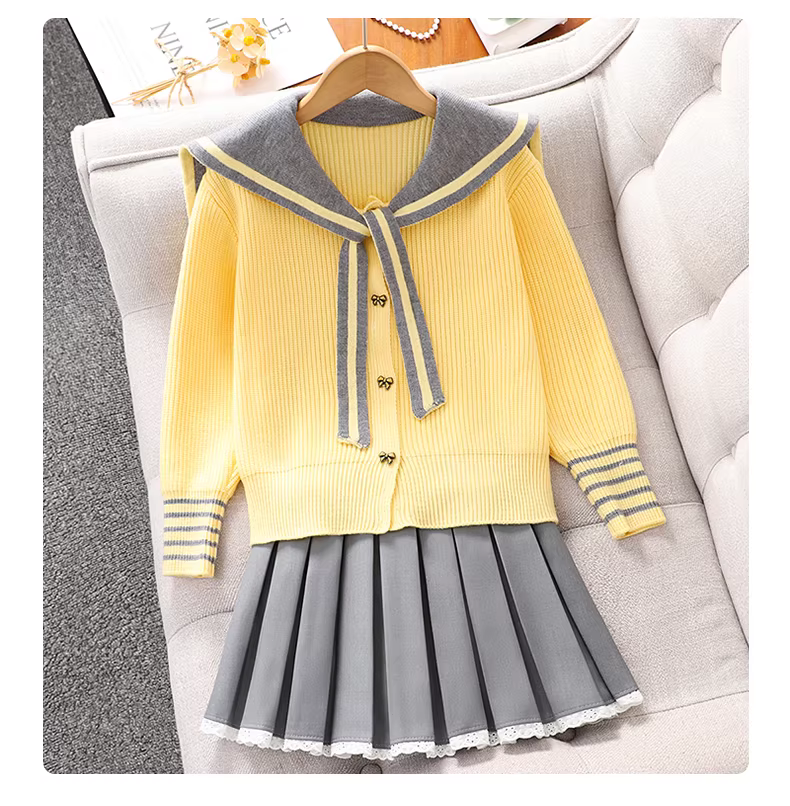 - Bộ đồ nữ sinh phong cách preppy xuân thu 2025, áo len dệt kim phối chân váy xếp ly, bộ hai mảnh kiểu JK, chân váy nữ sinh