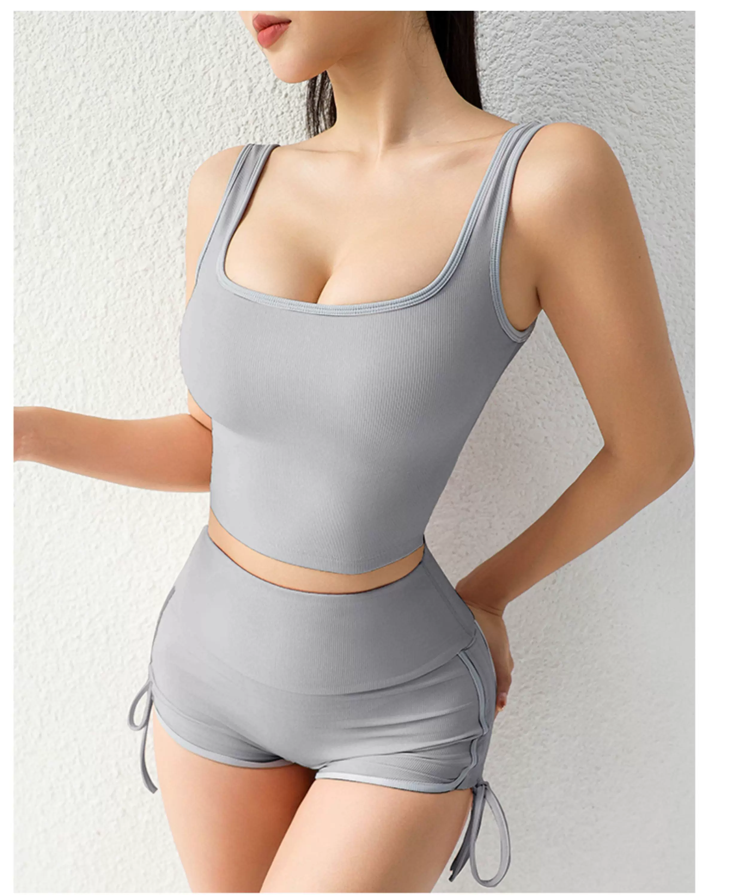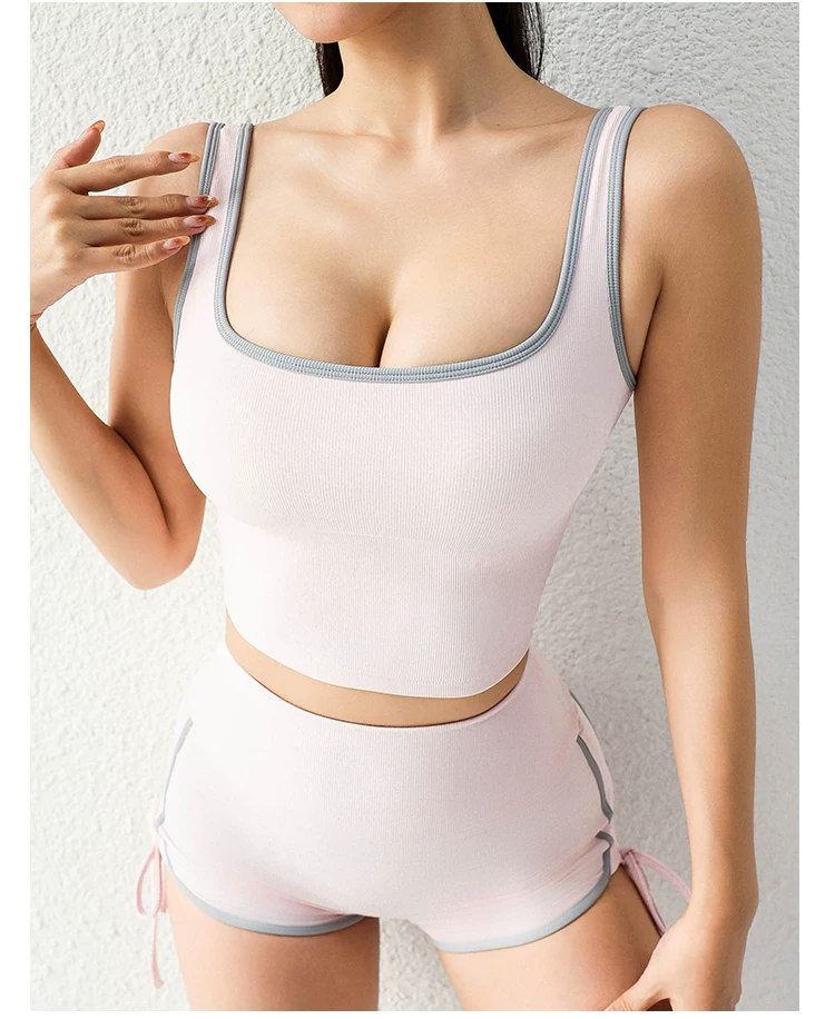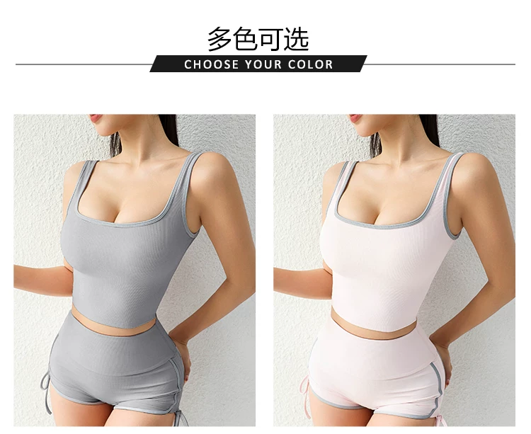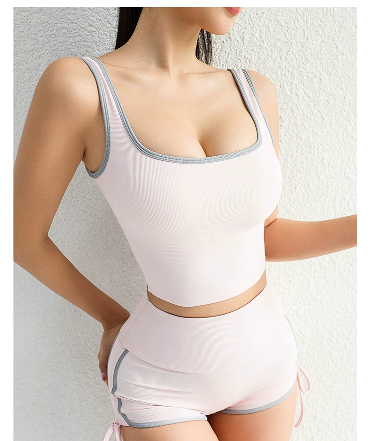 - Bộ đồ thể thao nữ mùa hè mới của cô gái dễ thương, quần short cạp cao có dây rút, bộ đồ tập yoga Pilates, chạy bộ.