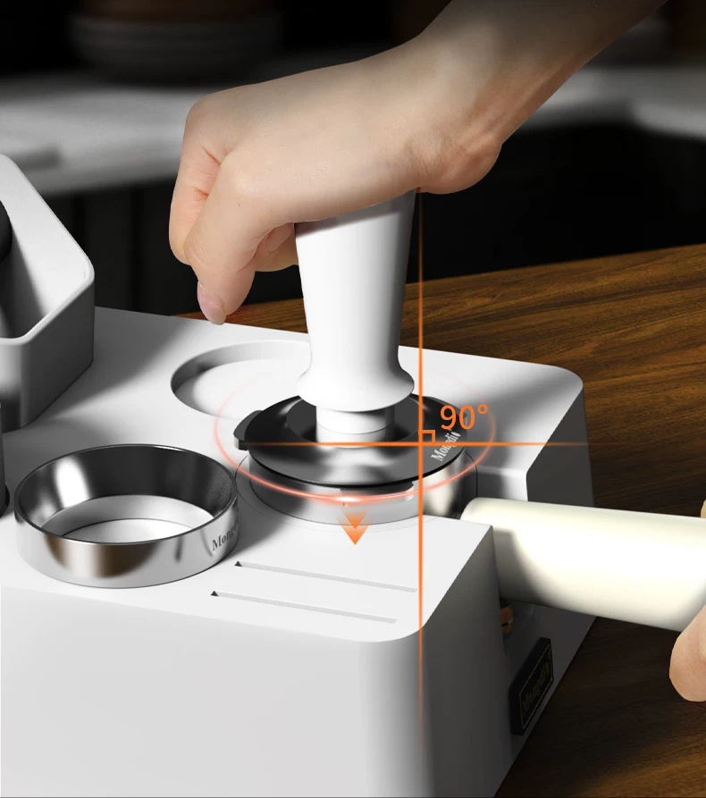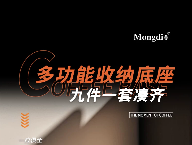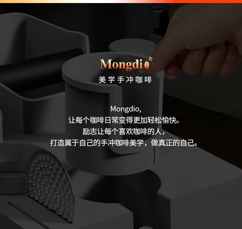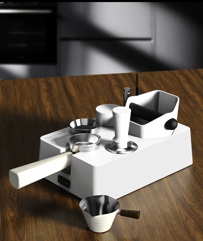 - Bộ dụng cụ pha cà phê Mongdio: đế ép cà phê, hộp đựng bã cà phê, bộ phân phối bột cà phê tích hợp, dụng cụ ép cà phê, hộp đựng dụng cụ đầy đủ.