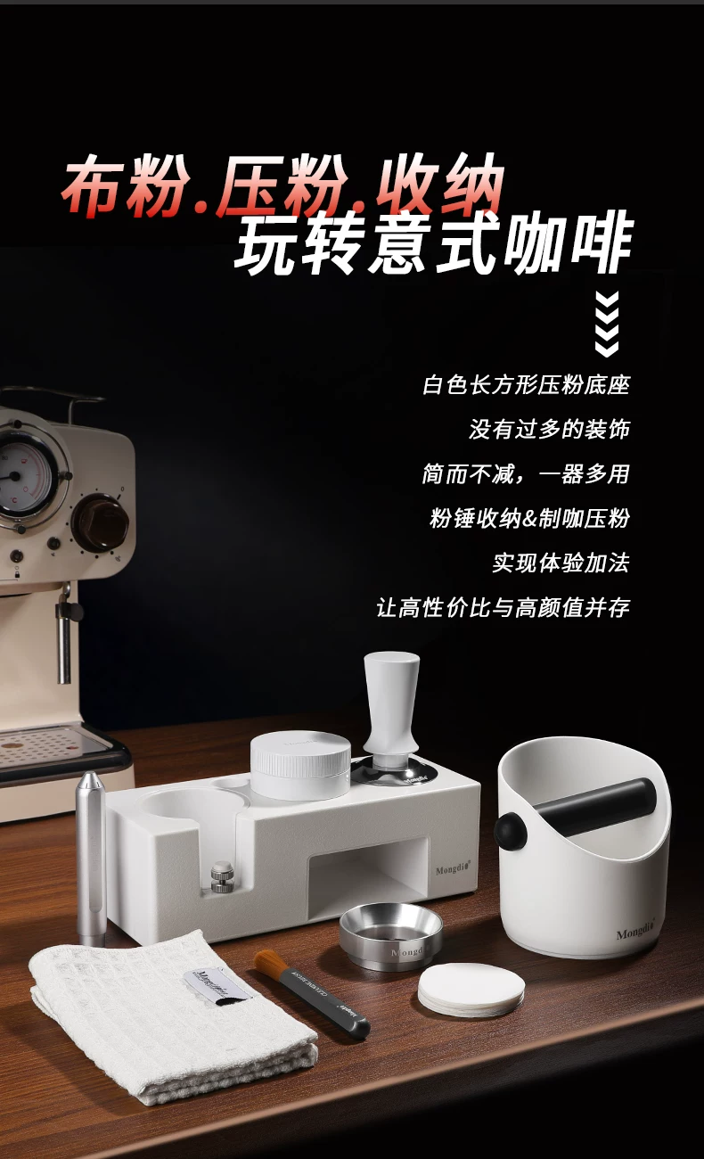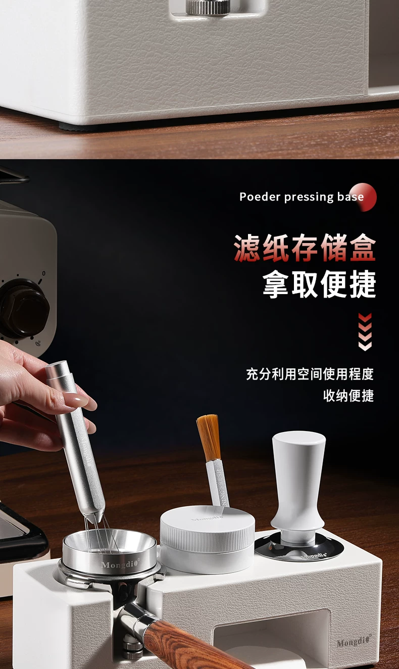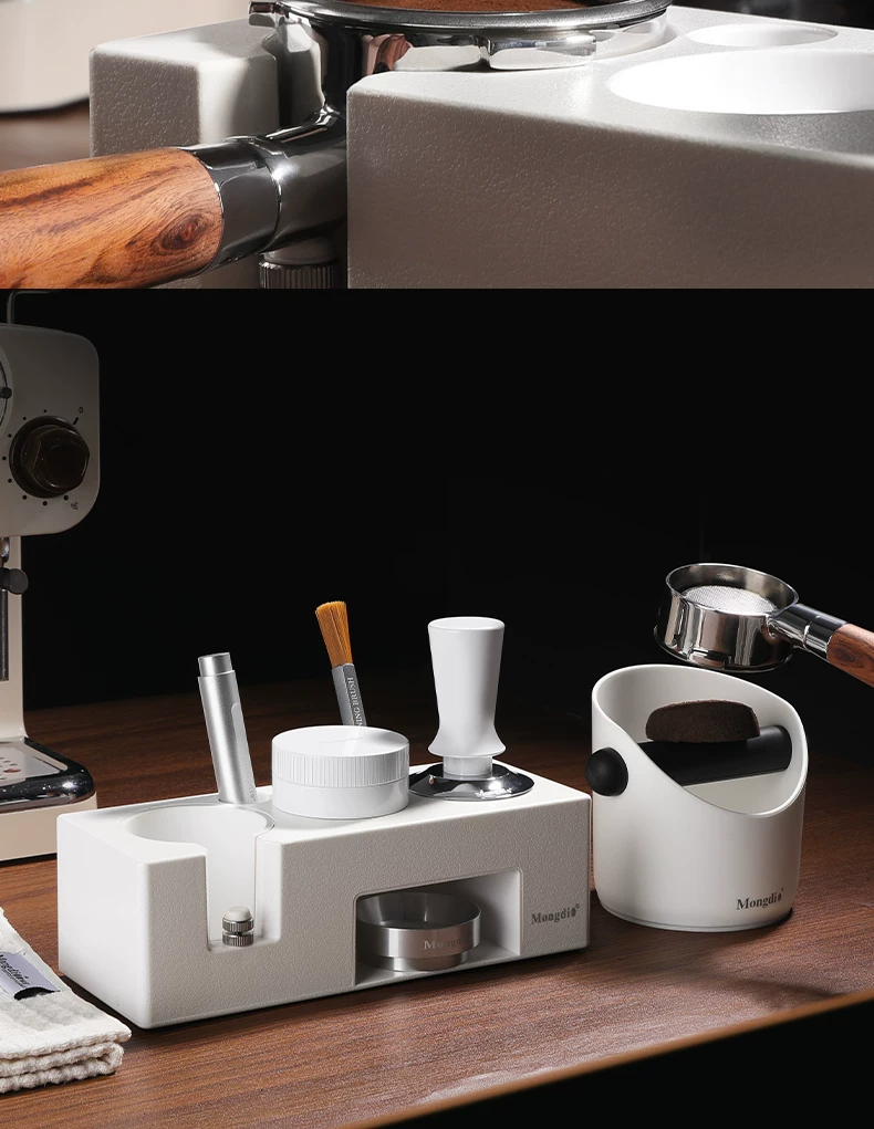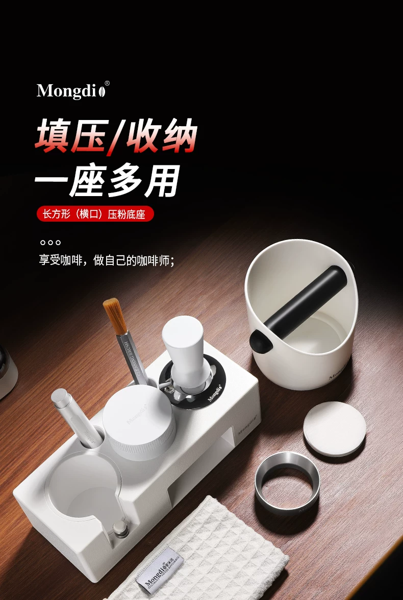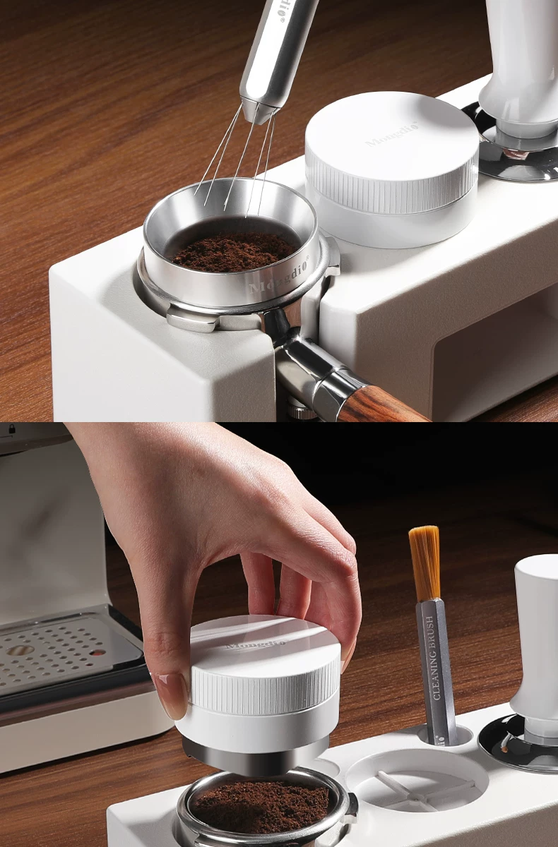- Bộ dụng cụ pha cà phê Mongdio: đế ép cà phê tự cân bằng, dụng cụ phân phối bột cà phê, búa ép cà phê, tay cầm espresso, bộ dụng cụ lưu trữ