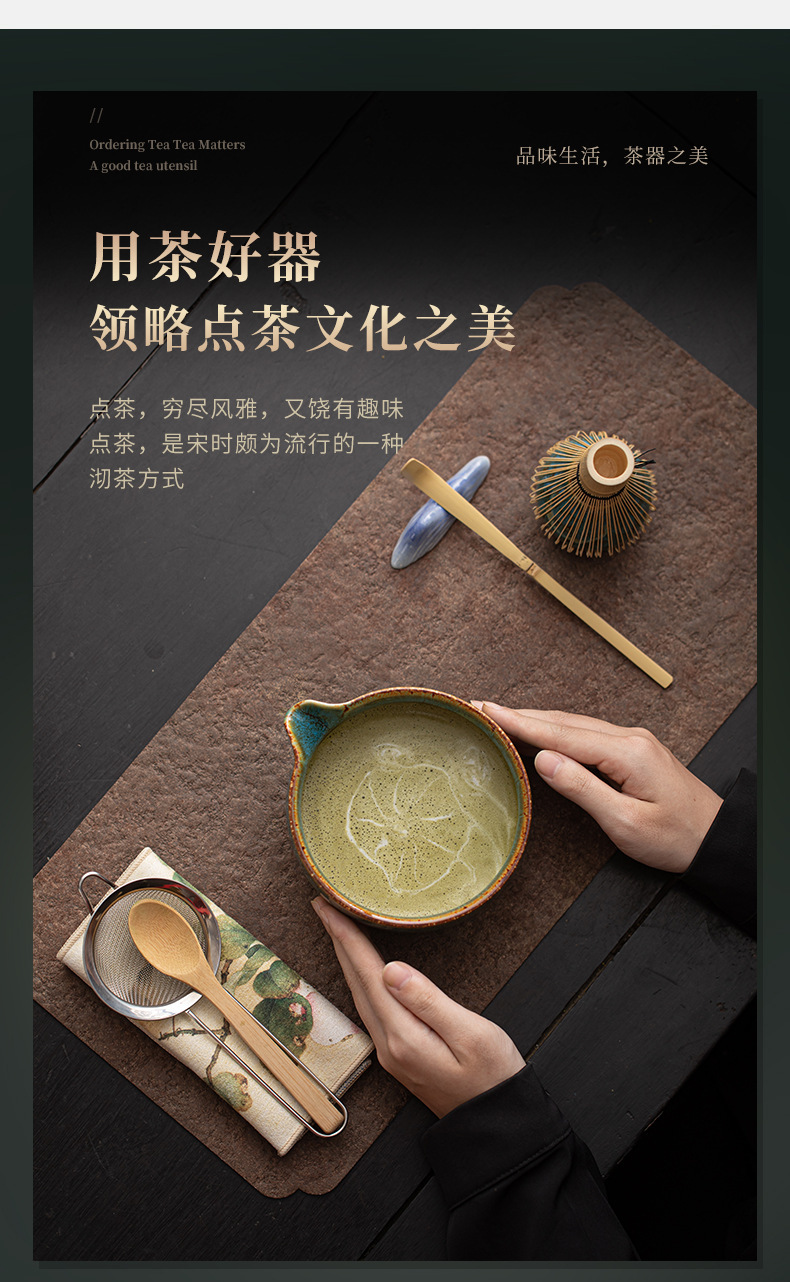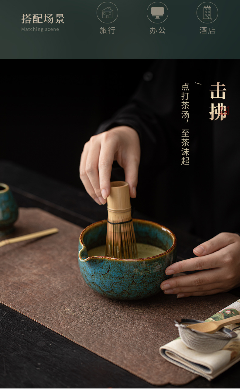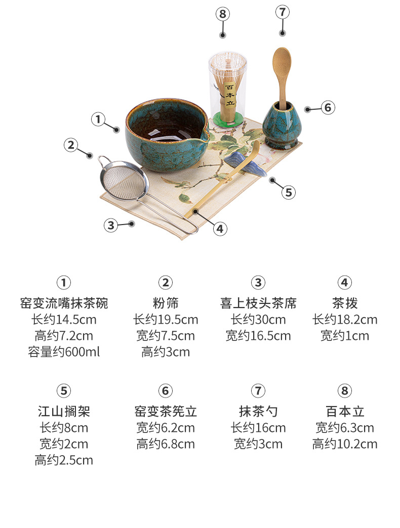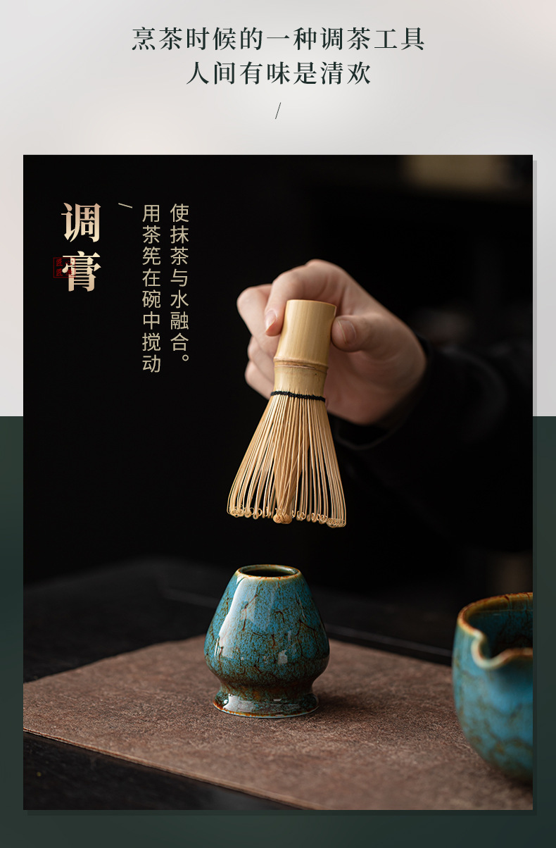 - Bộ dụng cụ pha trà matcha gốm sứ 4 món gồm vòi rót chảy, bát matcha kiểu Nhật, giá đỡ chổi đánh trà và giá đỡ.
