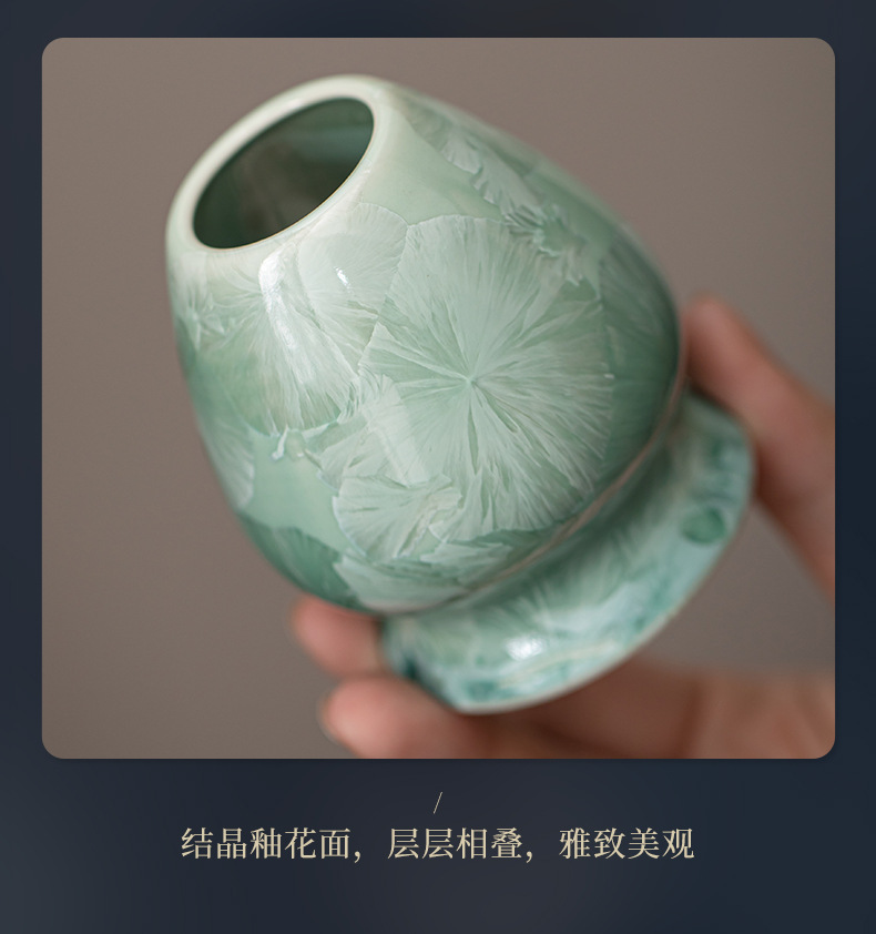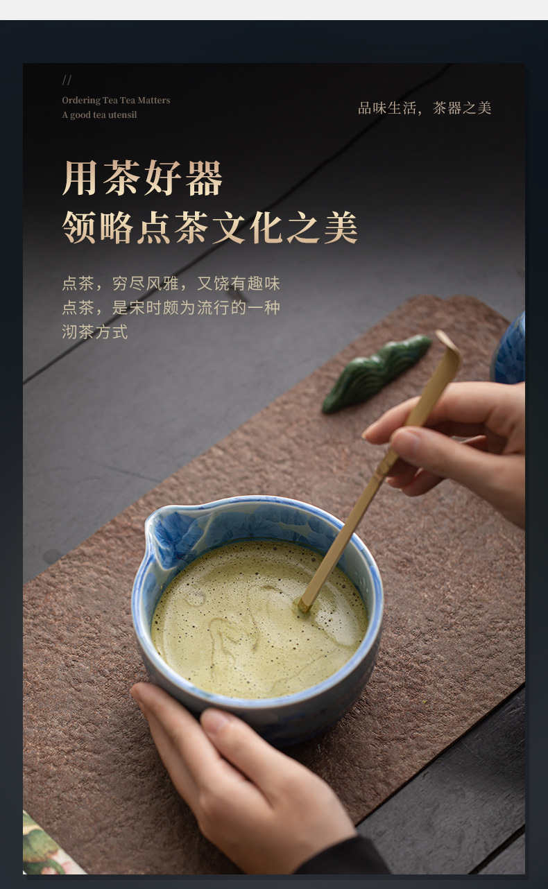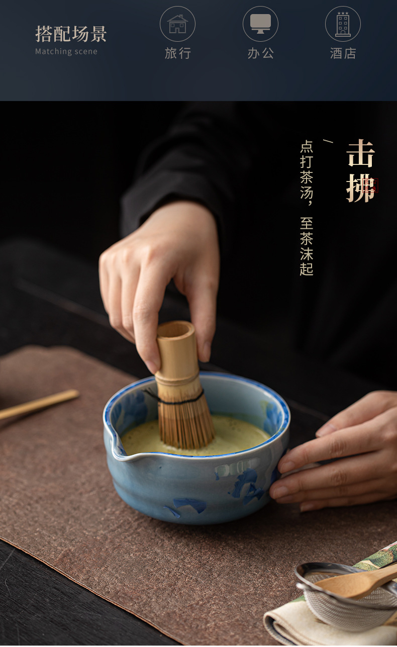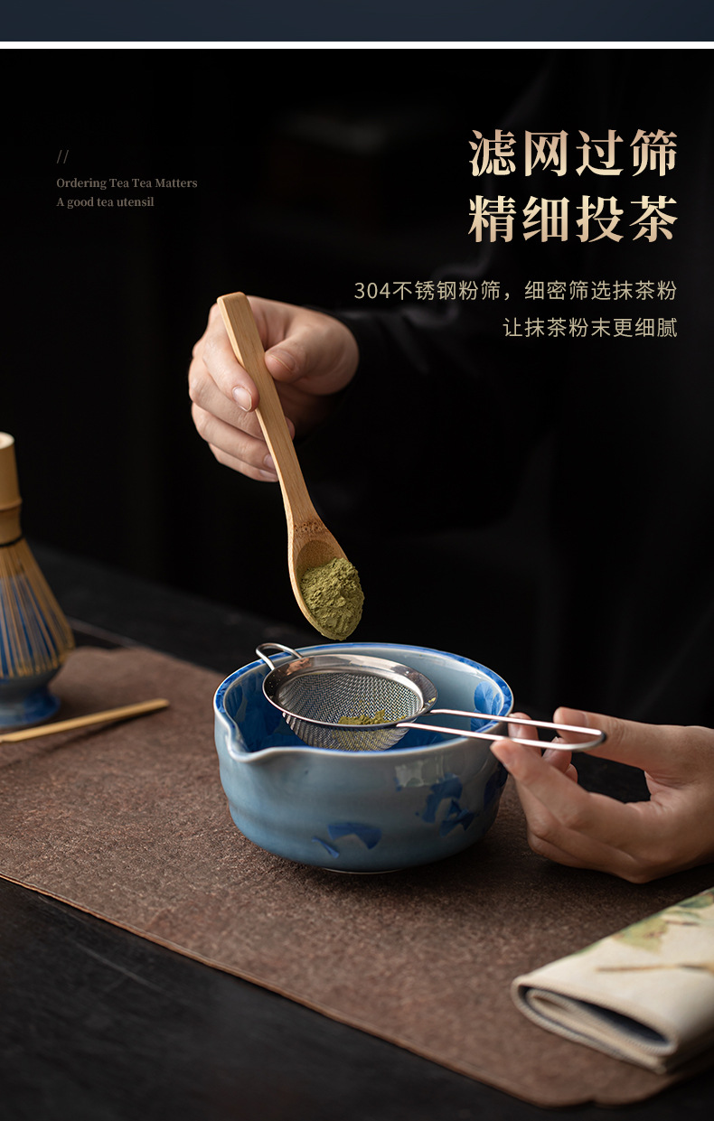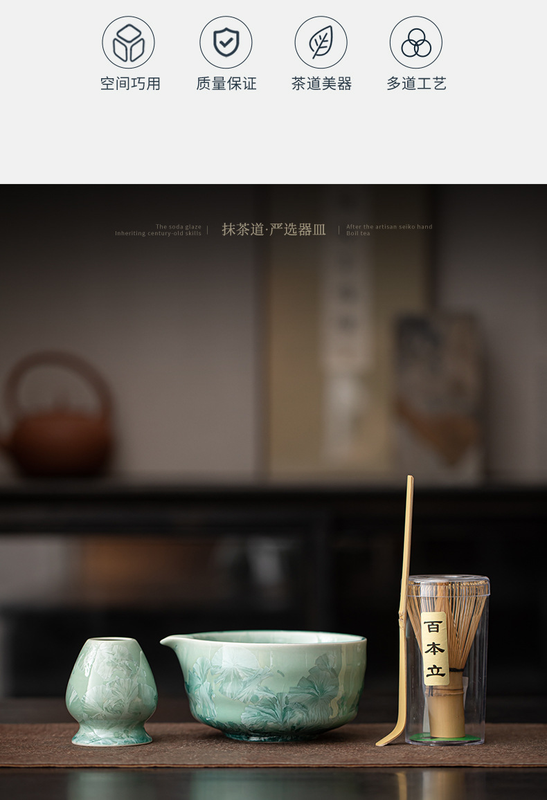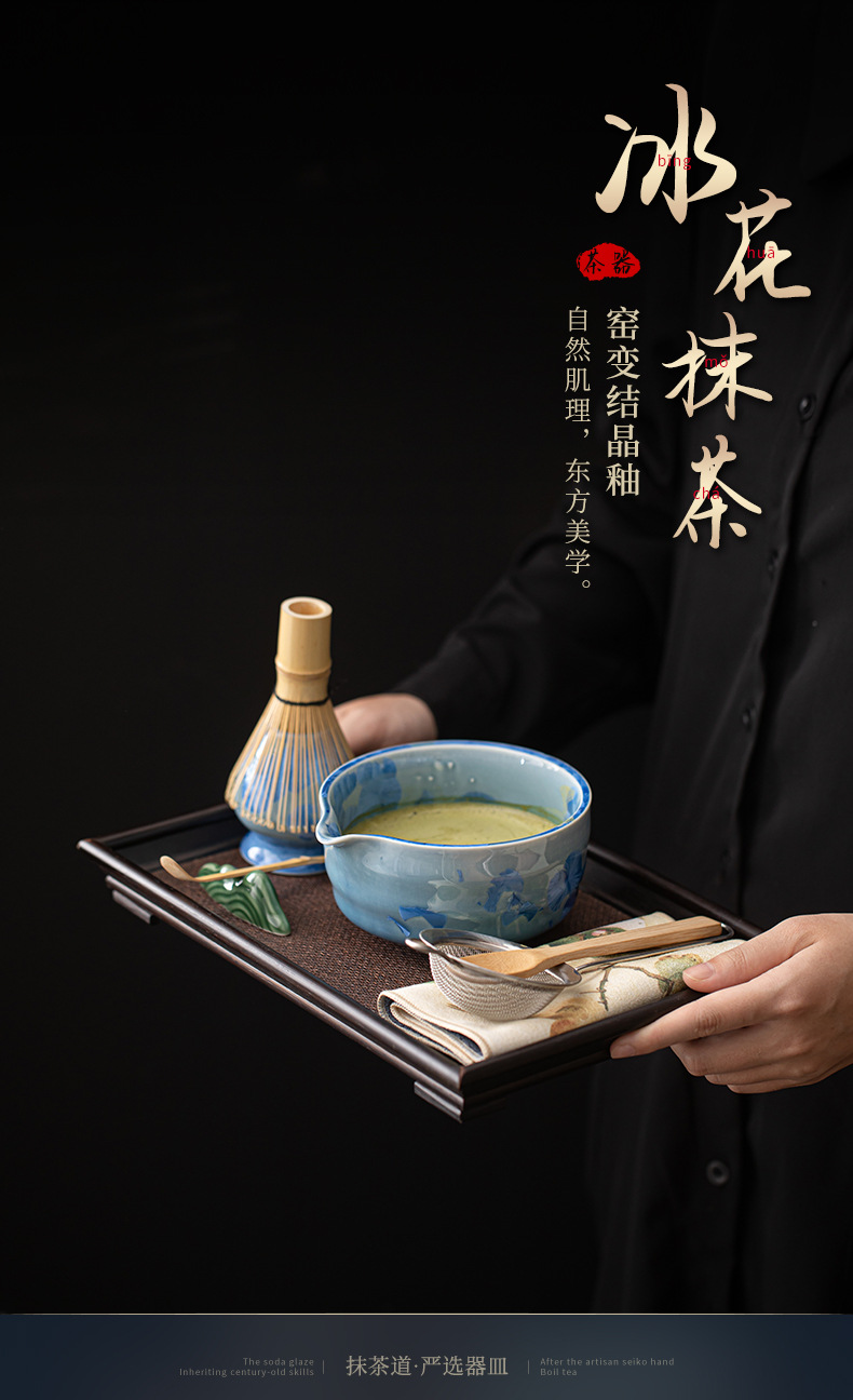 Bộ dụng cụ pha trà Nhật Bản gồm 8 món: chén trà, dụng cụ đánh trà, rây trà, men gốm nung kết tinh thể hình bán xoắn hoa băng matcha.