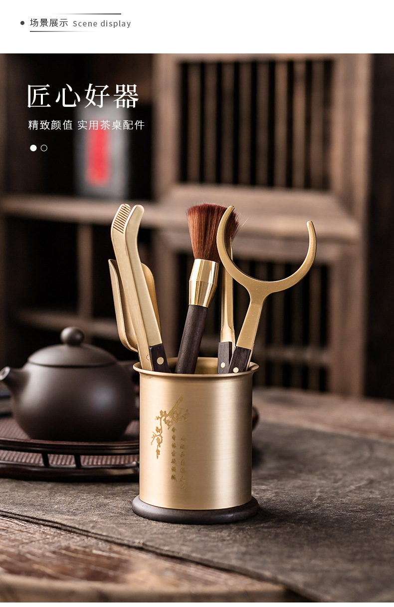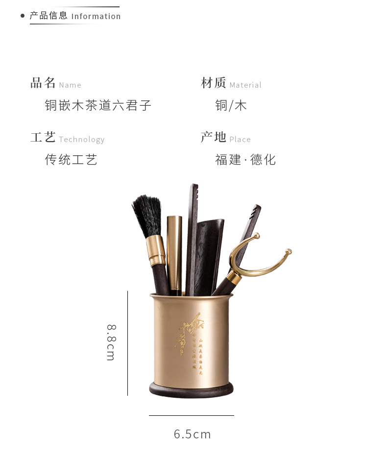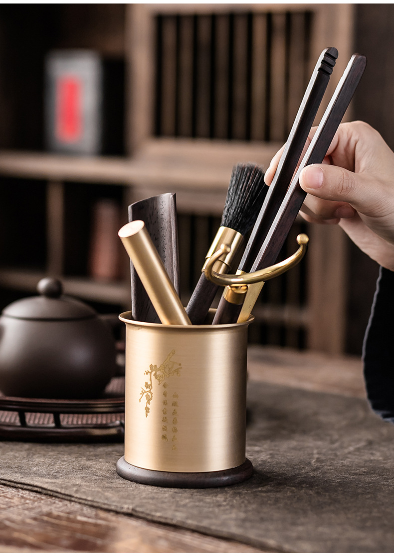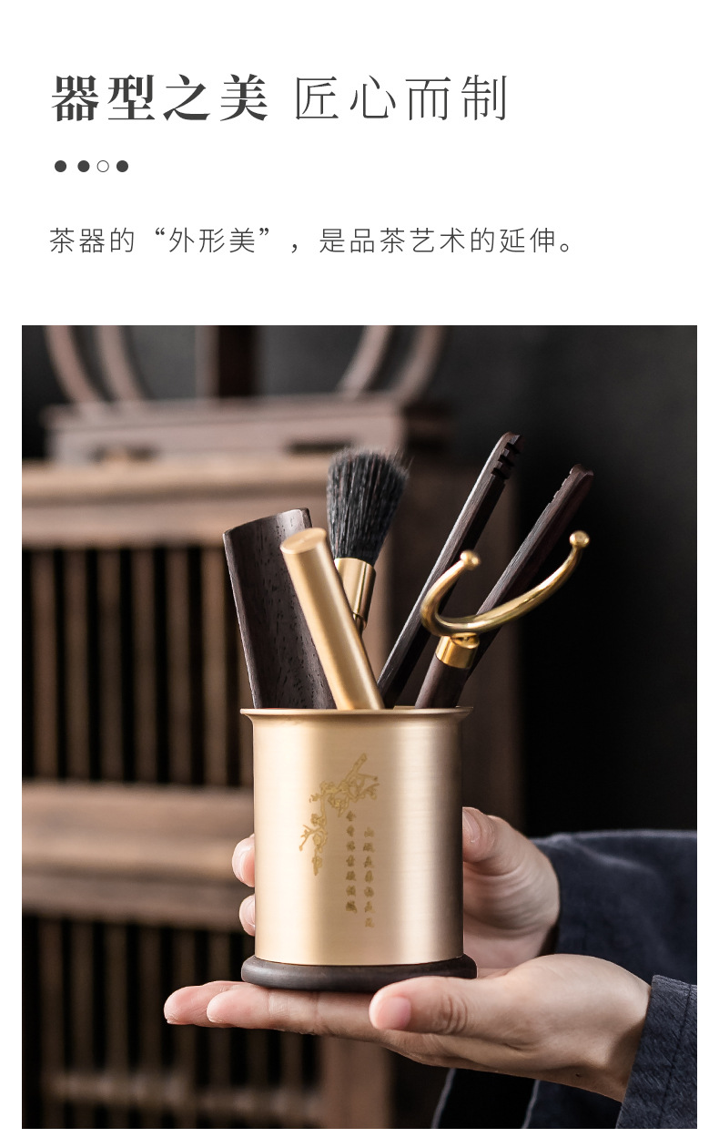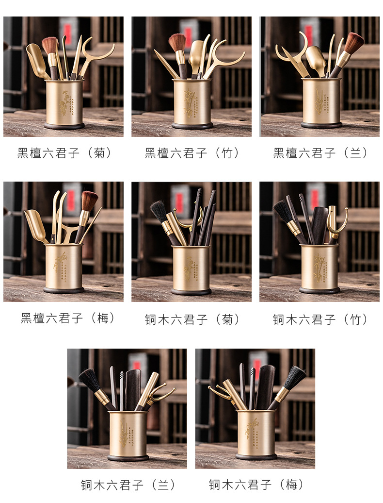 - Bộ dụng cụ trà đạo bằng đồng và gỗ gồm sáu món: kẹp trà, muỗng trà, phụ kiện bằng gỗ mun, bộ trà kung fu nghệ thuật pha trà, bút bảo dưỡng ấm trà, phụ kiện trà.