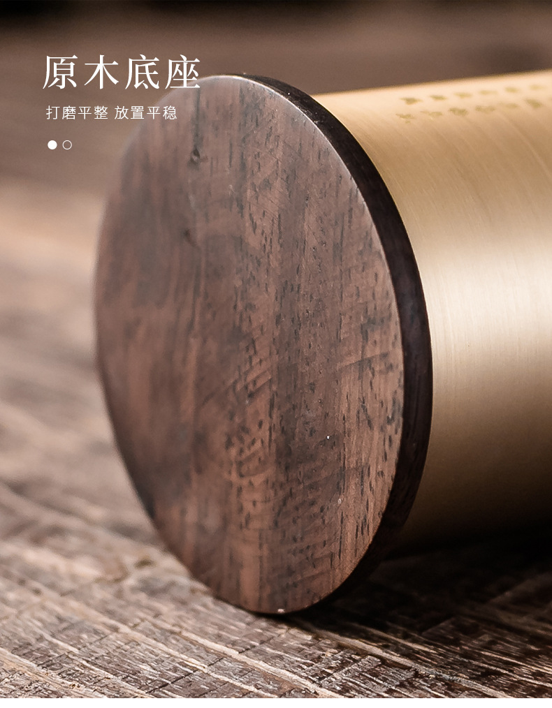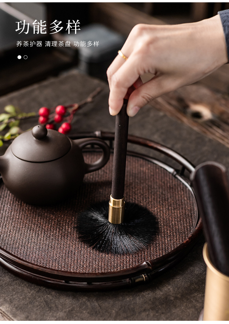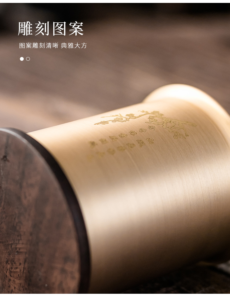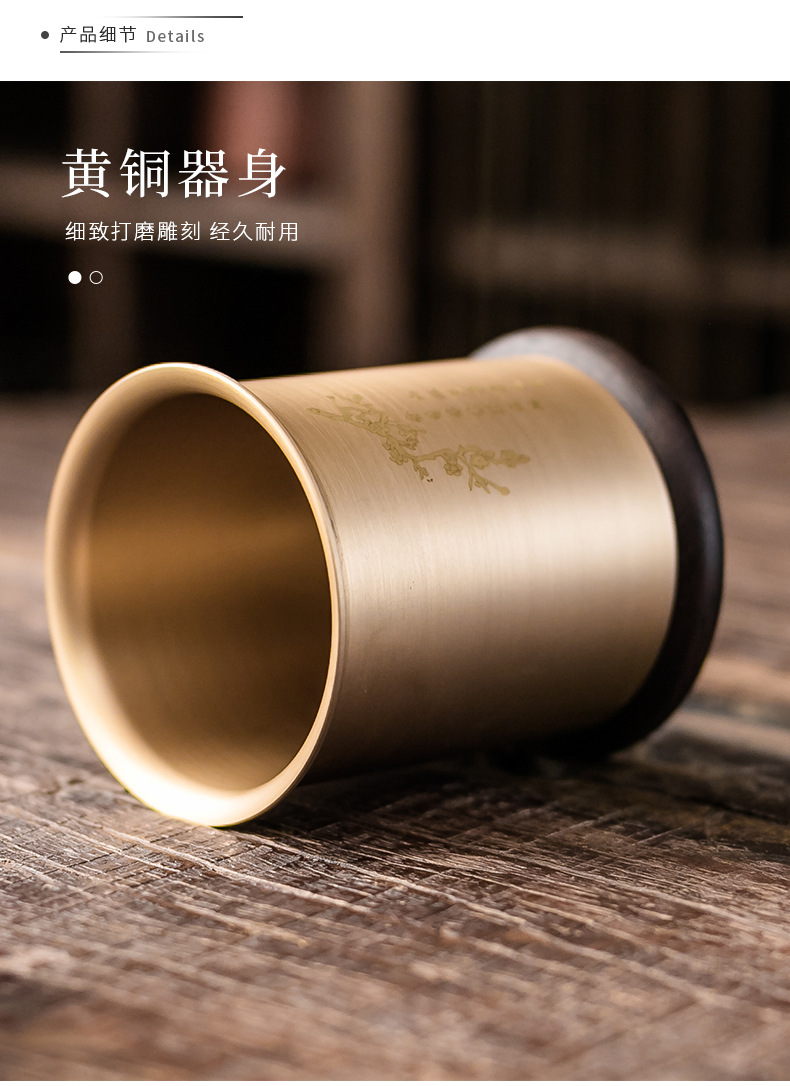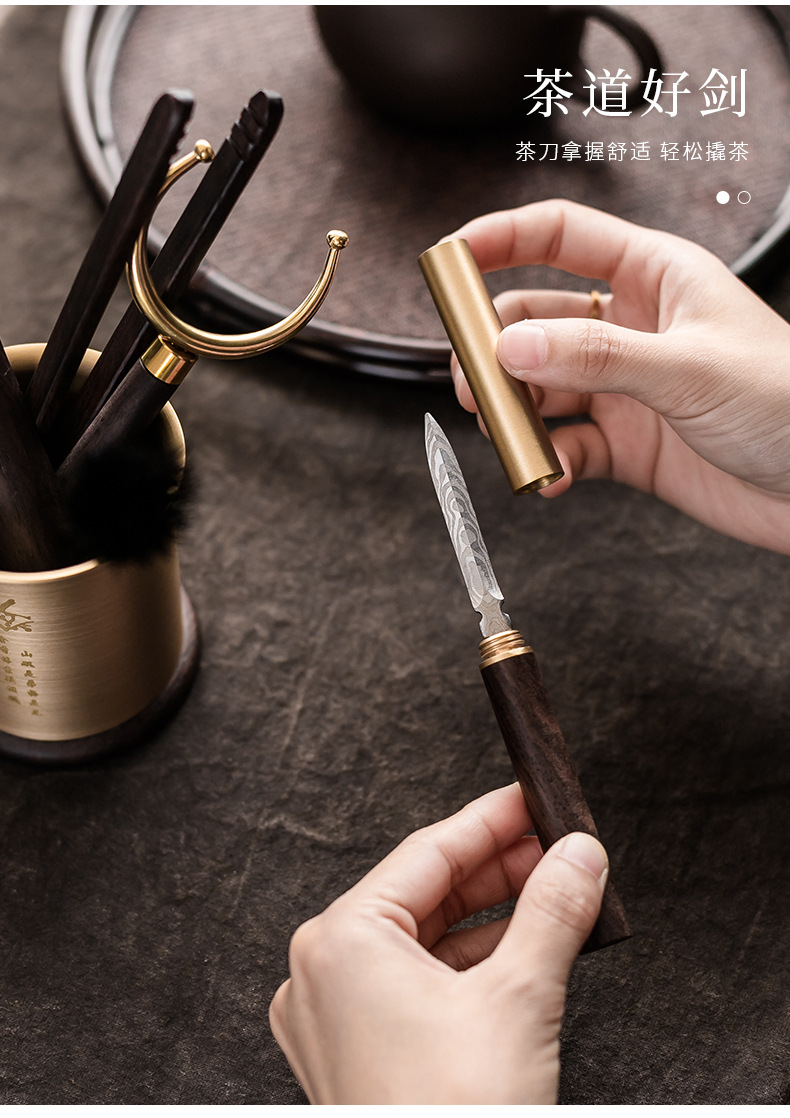 - Bộ dụng cụ trà đạo bằng đồng và gỗ gồm sáu món: kẹp trà, muỗng trà, phụ kiện bằng gỗ mun, bộ trà kung fu nghệ thuật pha trà, bút bảo dưỡng ấm trà, phụ kiện trà.