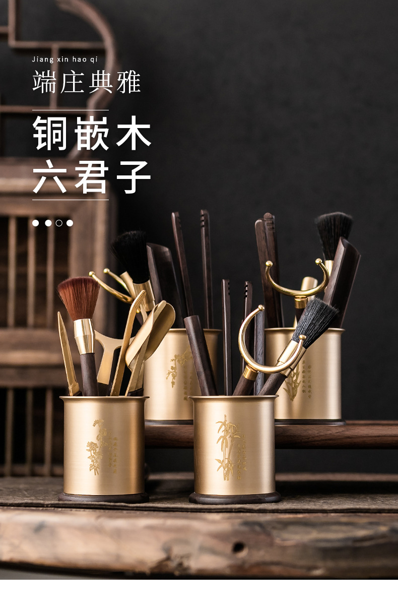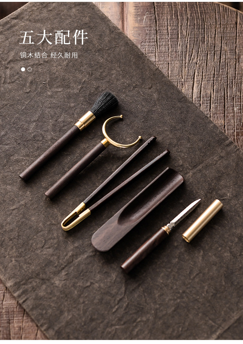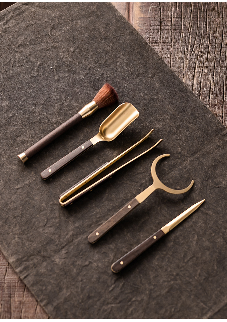 Bộ dụng cụ trà đạo bằng đồng và gỗ gồm sáu món: kẹp trà, muỗng trà, phụ kiện bằng gỗ mun, bộ trà kung fu nghệ thuật pha trà, bút bảo dưỡng ấm trà, phụ kiện trà.