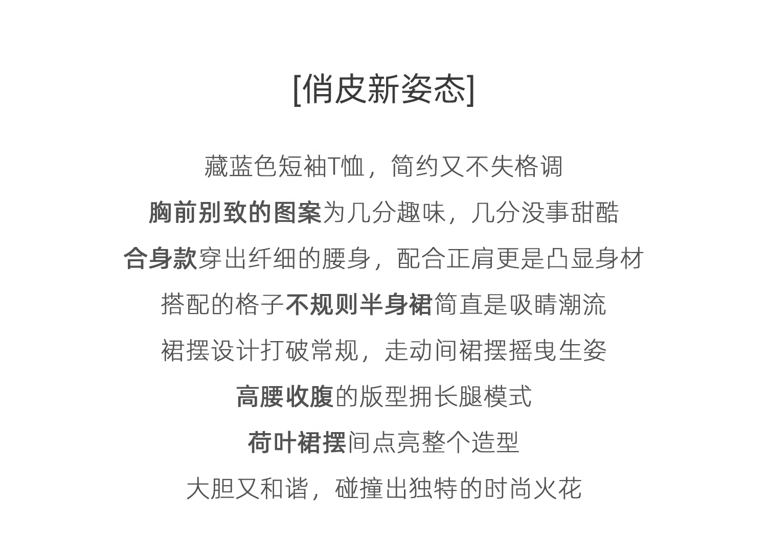Bộ quần áo nữ cỡ lớn dành cho người lớn, áo thun ngắn tay cổ tròn ôm dáng mùa hè với chân váy kẻ caro bất đối xứng.