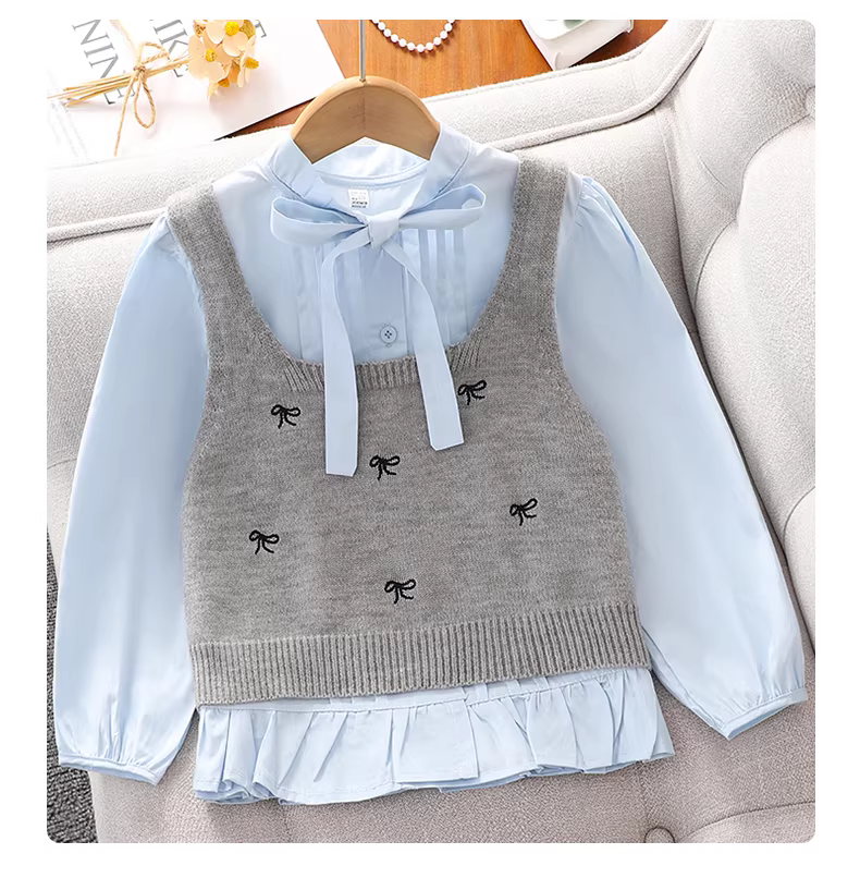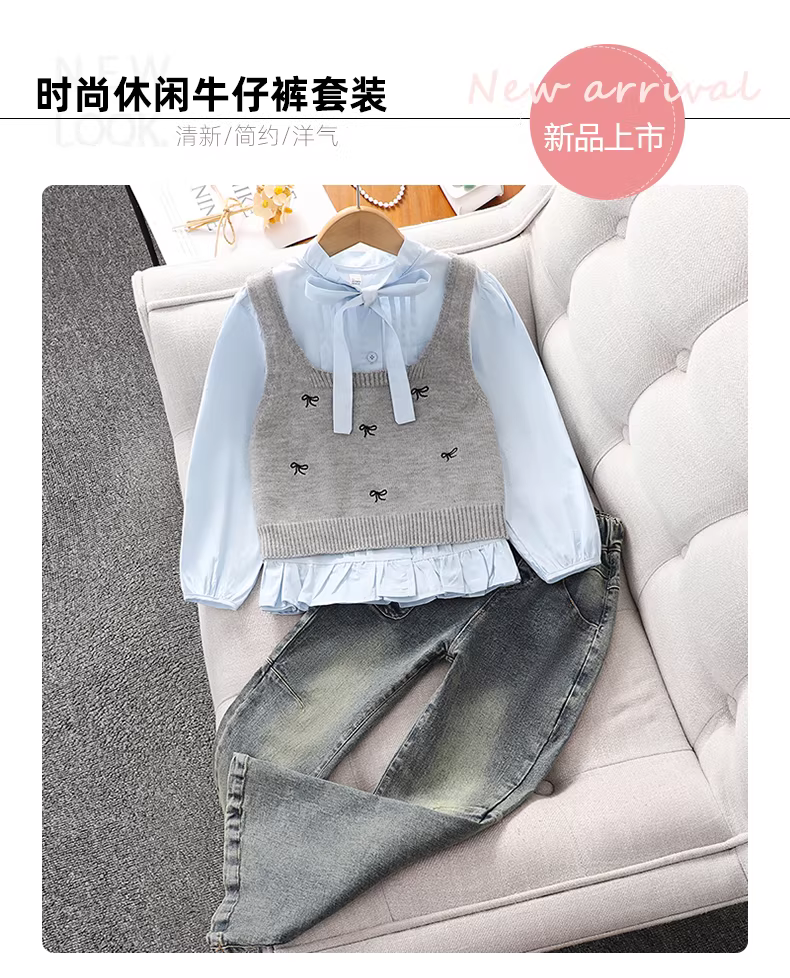 - Bộ quần áo xuân thu bé gái 2025, áo sơ mi, áo gile, quần bò, phong cách preppy, bộ ba món