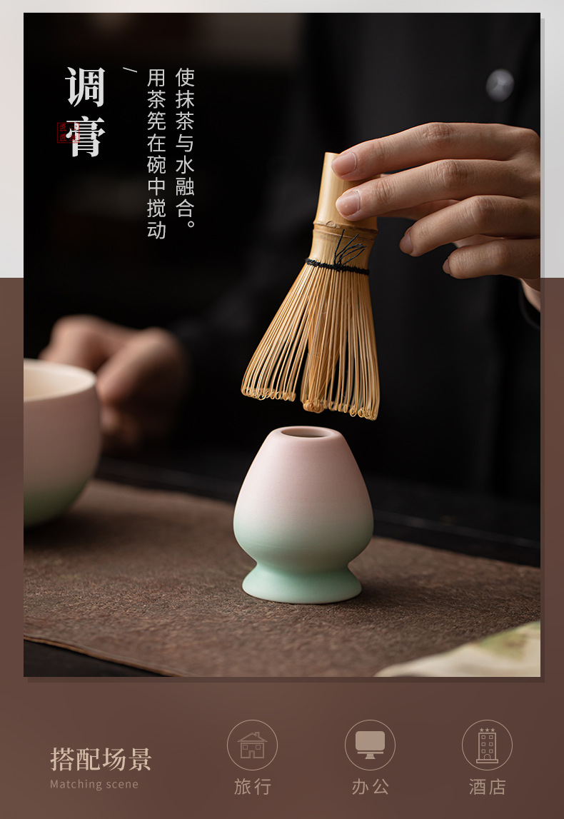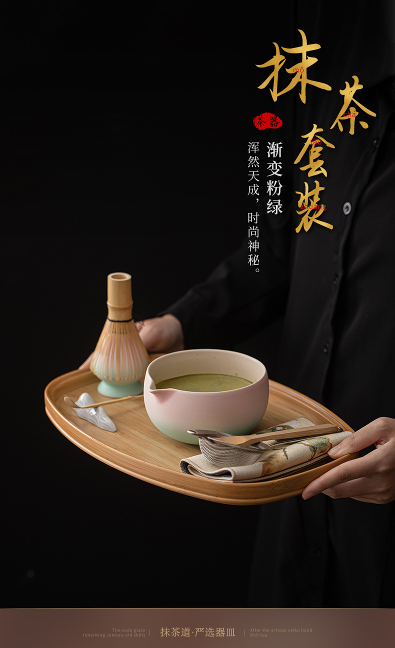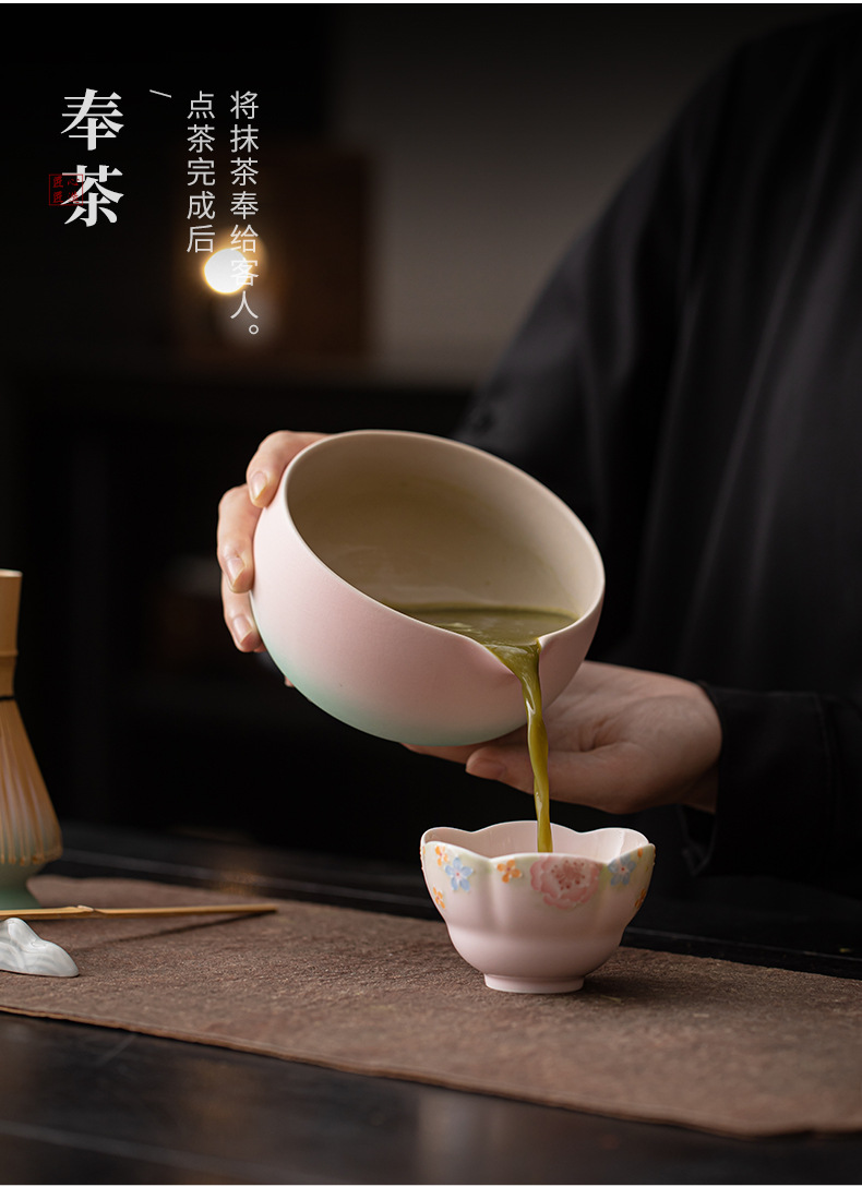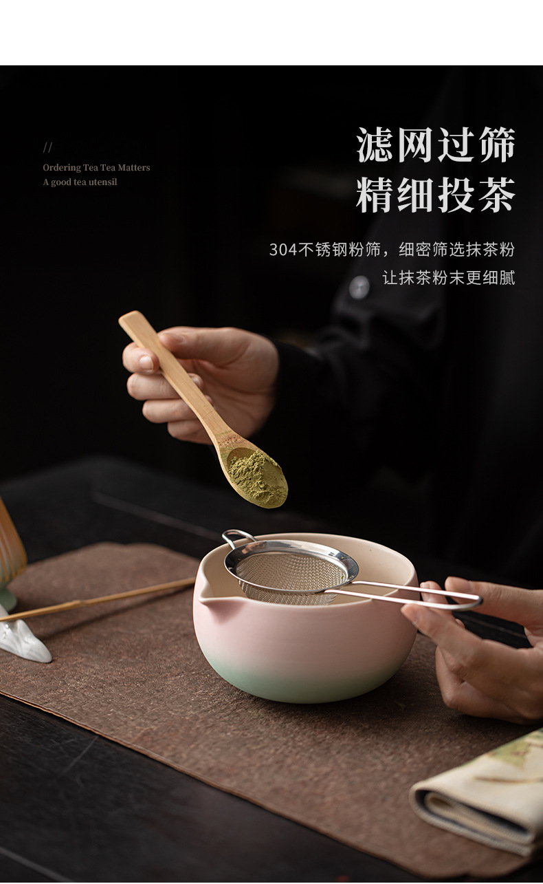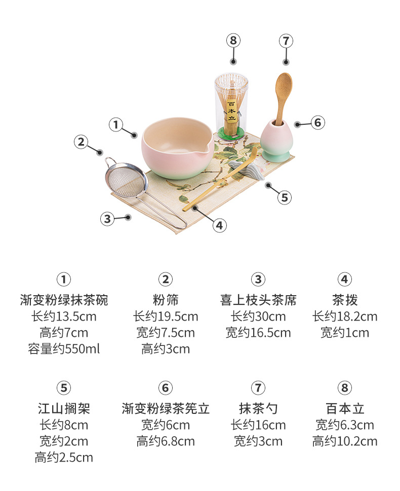 - Bộ tám món matcha màu hồng và xanh lá cây gradient, bát matcha, bát matcha, dụng cụ pha trà thời nhà Tống, máy đánh trà bằng gốm, sàng bột 100 mảnh
