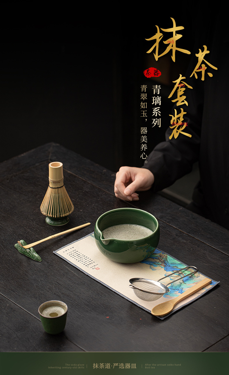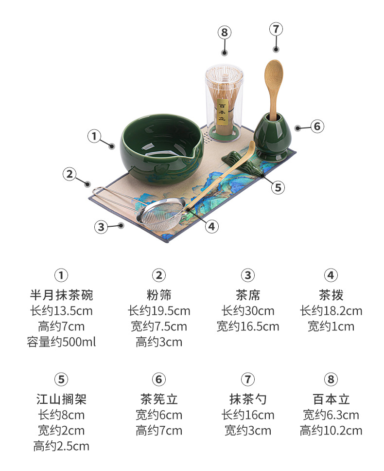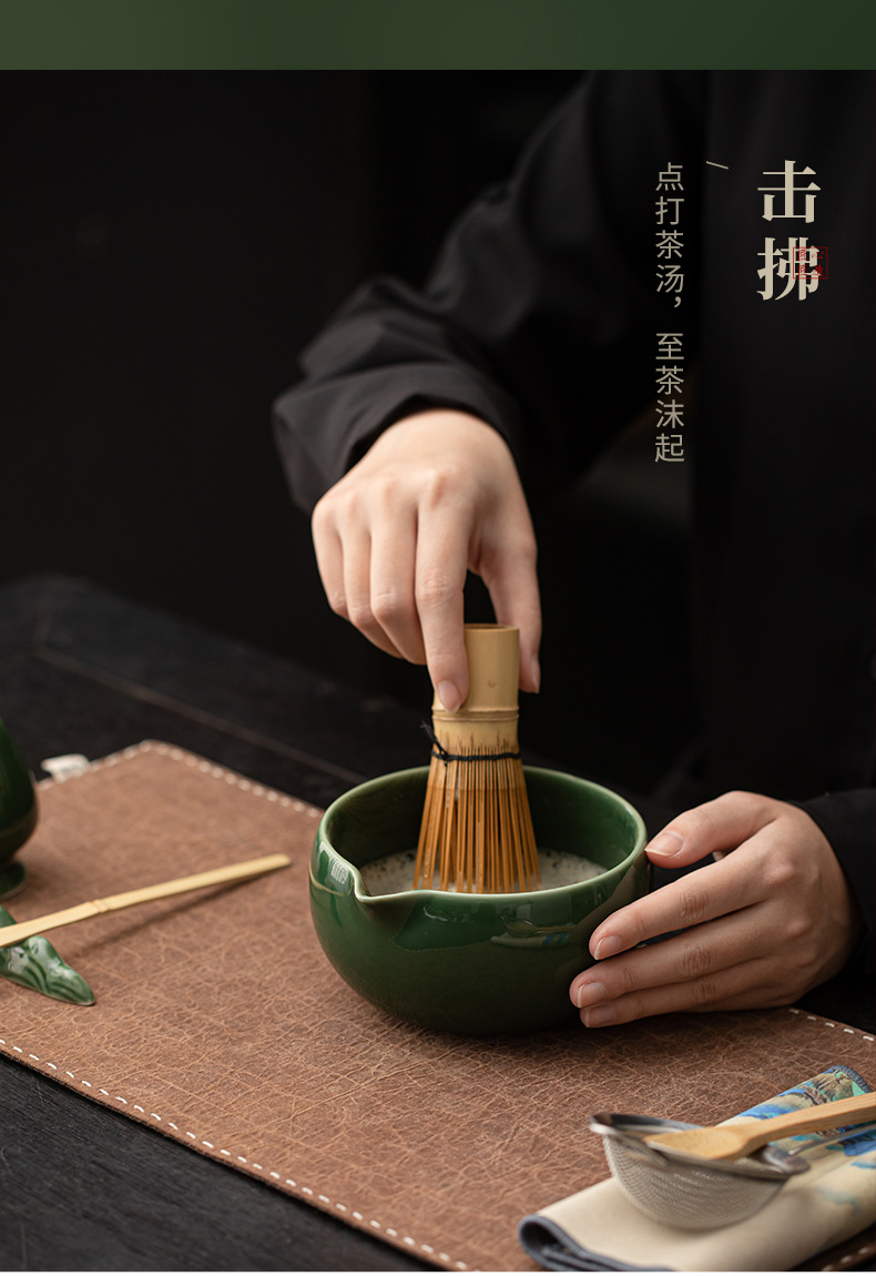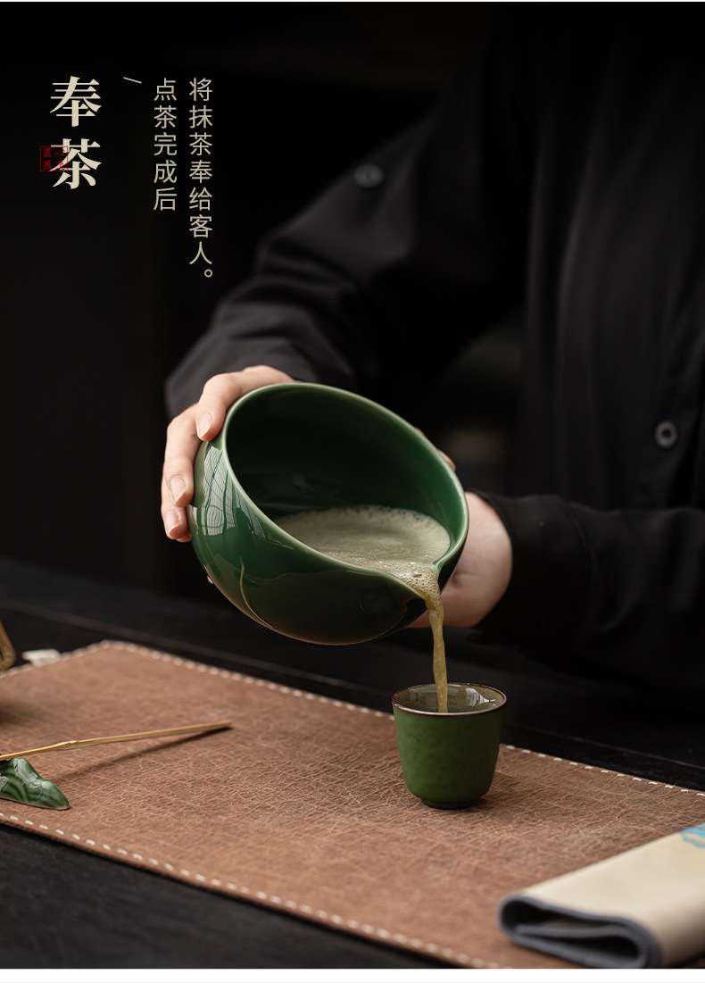 - Bộ tám món matcha màu xanh lá cây mô phỏng đồ uống trà gốm sứ nhà Tống, bát trà Baixi matcha, bình trà, bộ lọc đứng, phụ kiện bộ trà