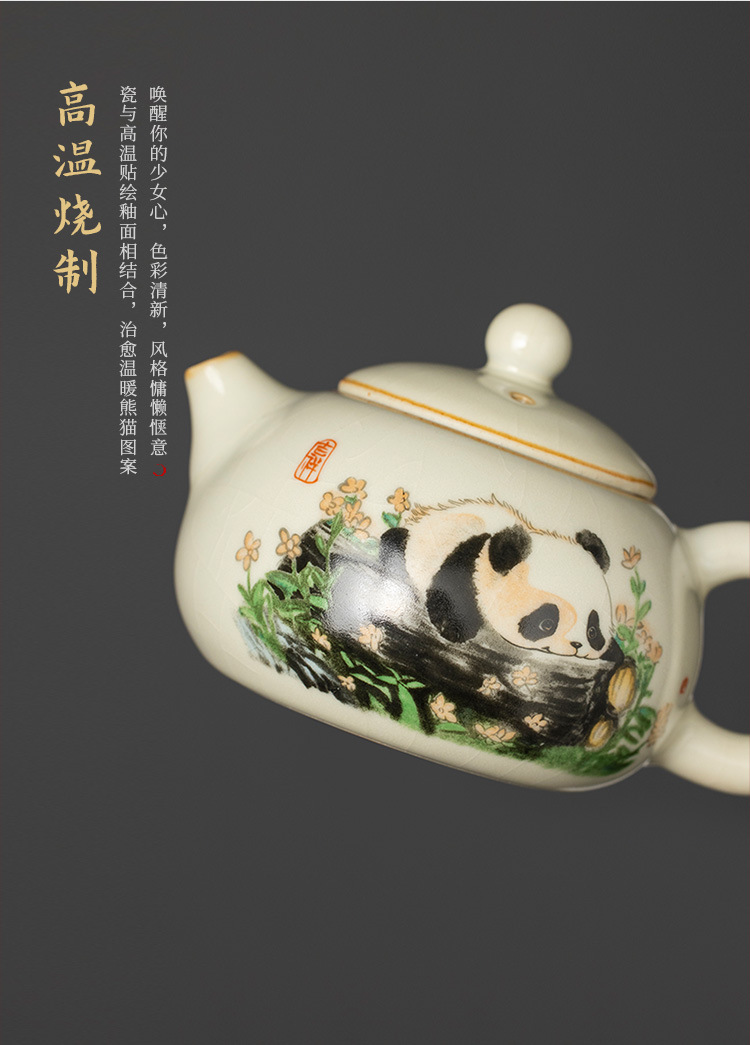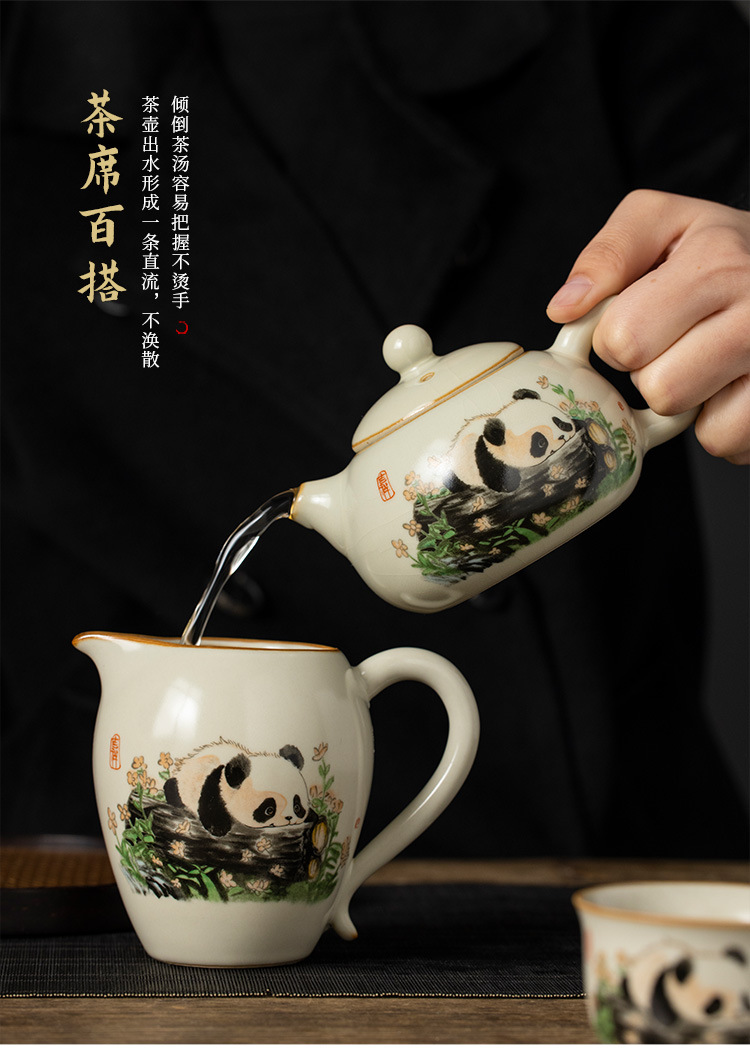 Bộ trà bát có nắp 3 tài gốm sứ Ru Kiln Panda Bộ trà Kung Fu một ấm sáu chén cao cấp cho phòng khách gia dụng