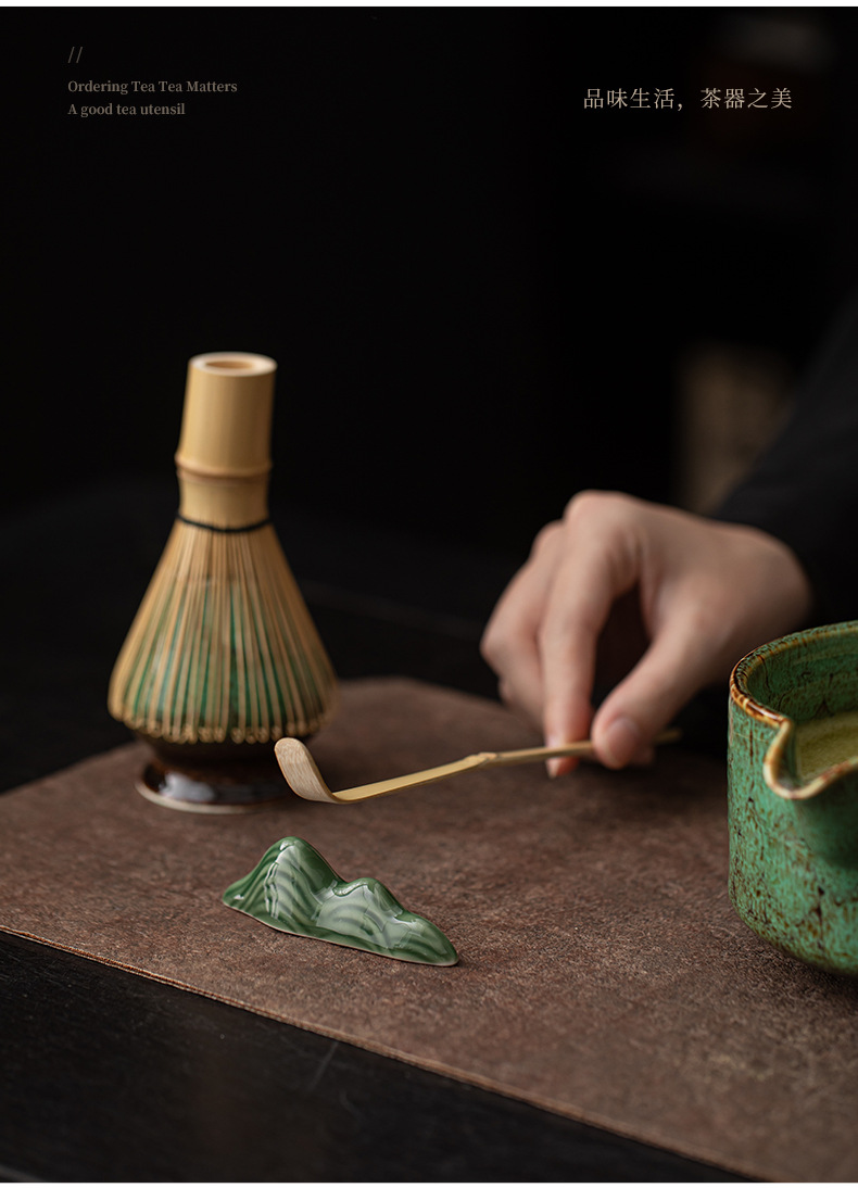 Bộ trà đạo gốm sứ kiểu Nhật bốn món với dụng cụ matcha miệng thông minh nung trong lò, bát trà, dụng cụ đánh trà, giá đựng bàn chải trà và thìa trà.