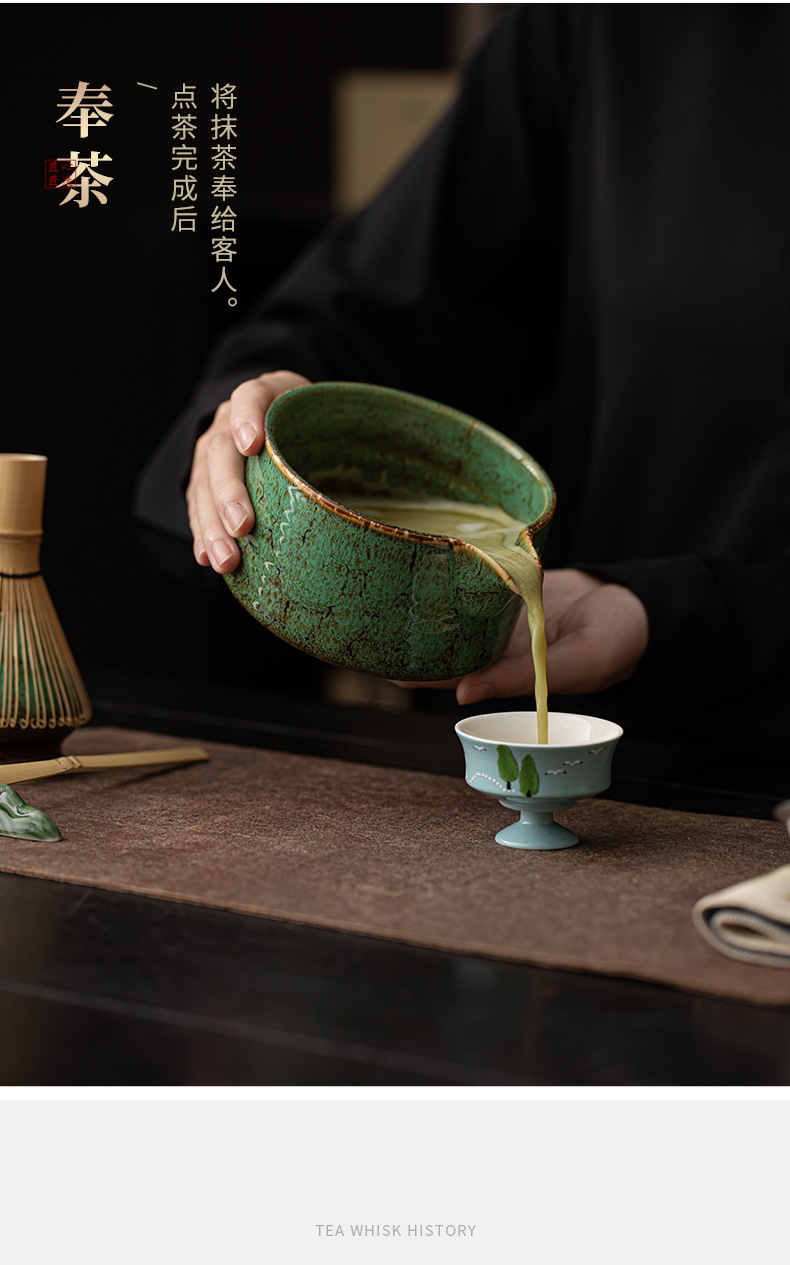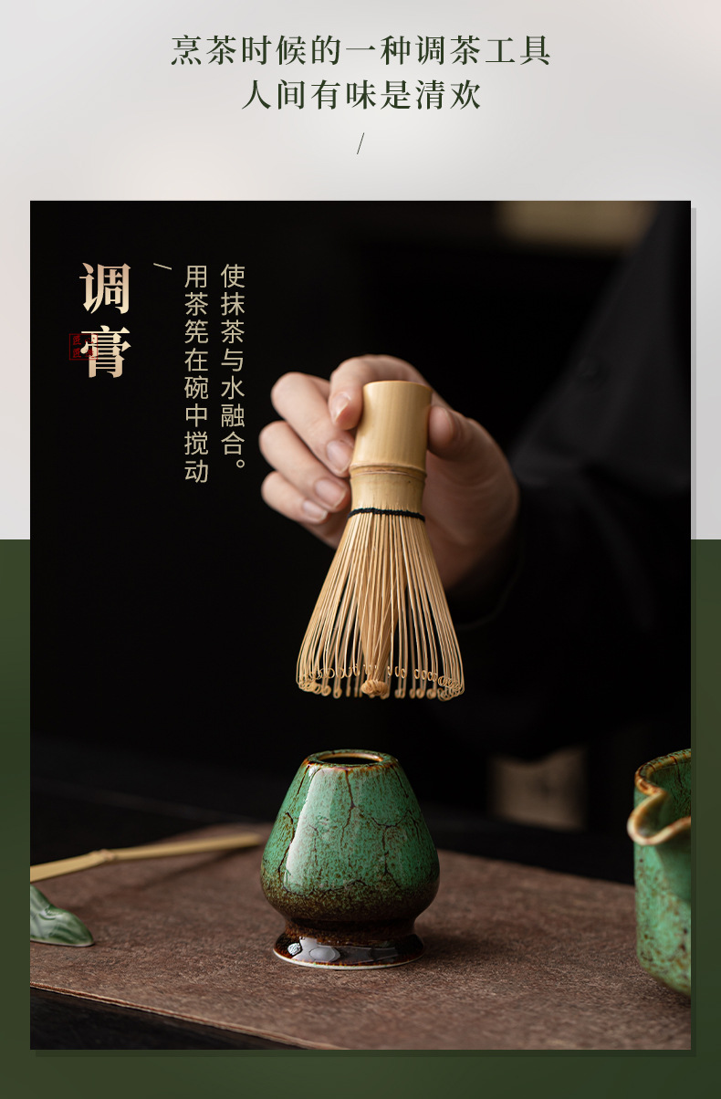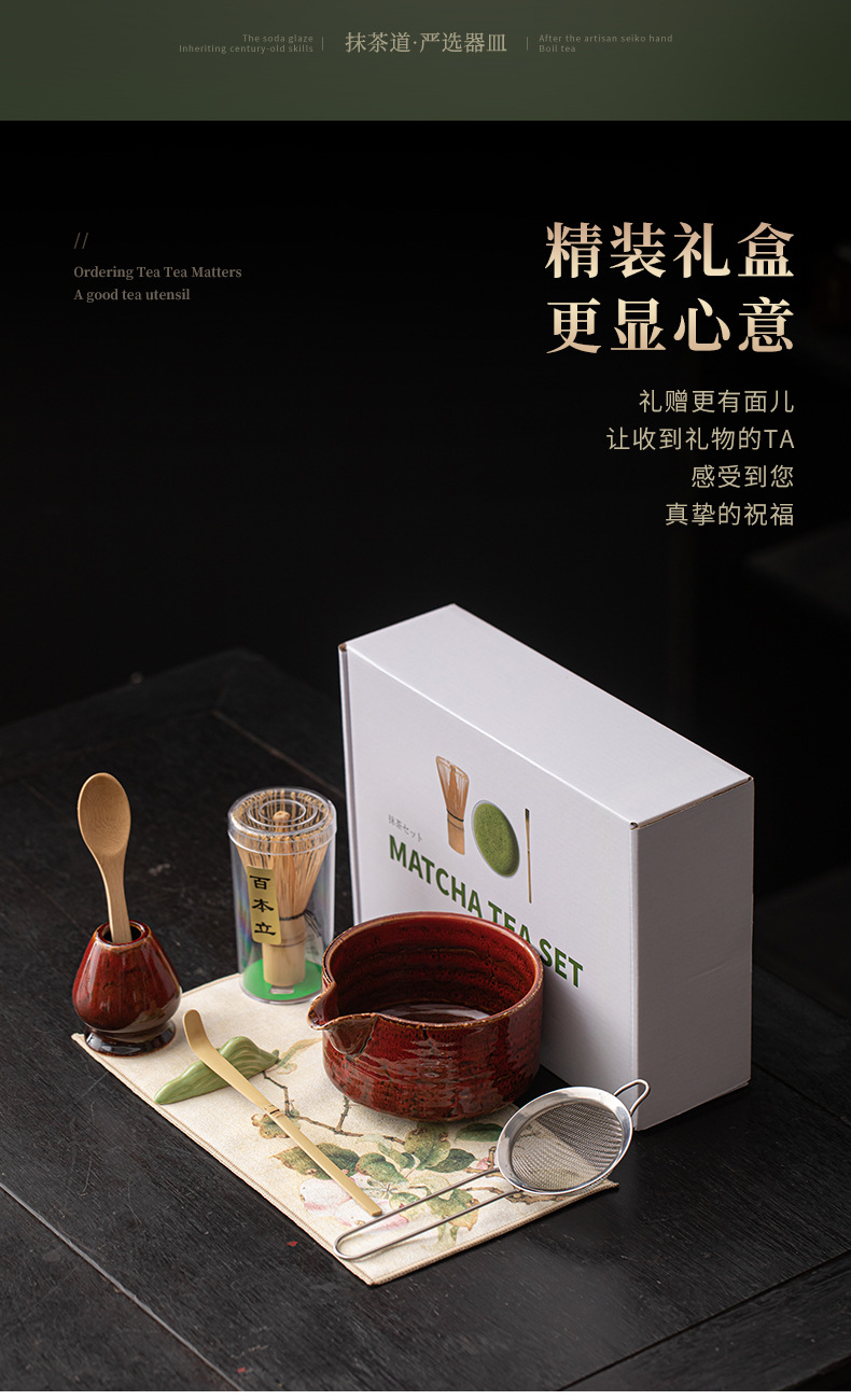- Bộ trà đạo gốm sứ kiểu Nhật bốn món với dụng cụ matcha miệng thông minh nung trong lò, bát trà, dụng cụ đánh trà, giá đựng bàn chải trà và thìa trà.
