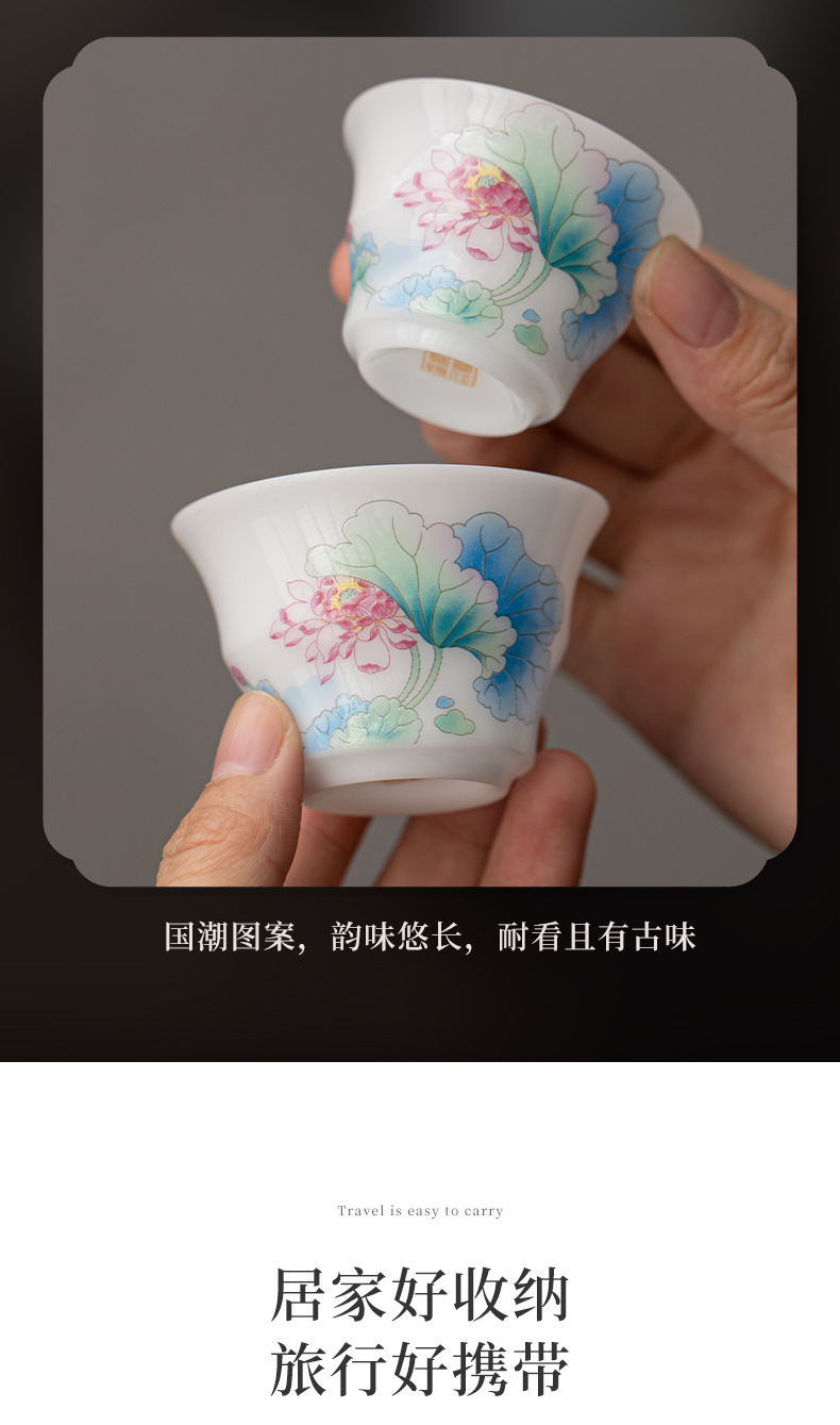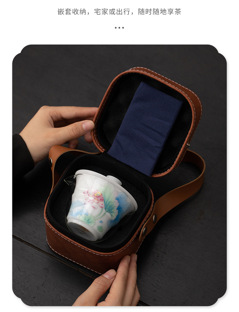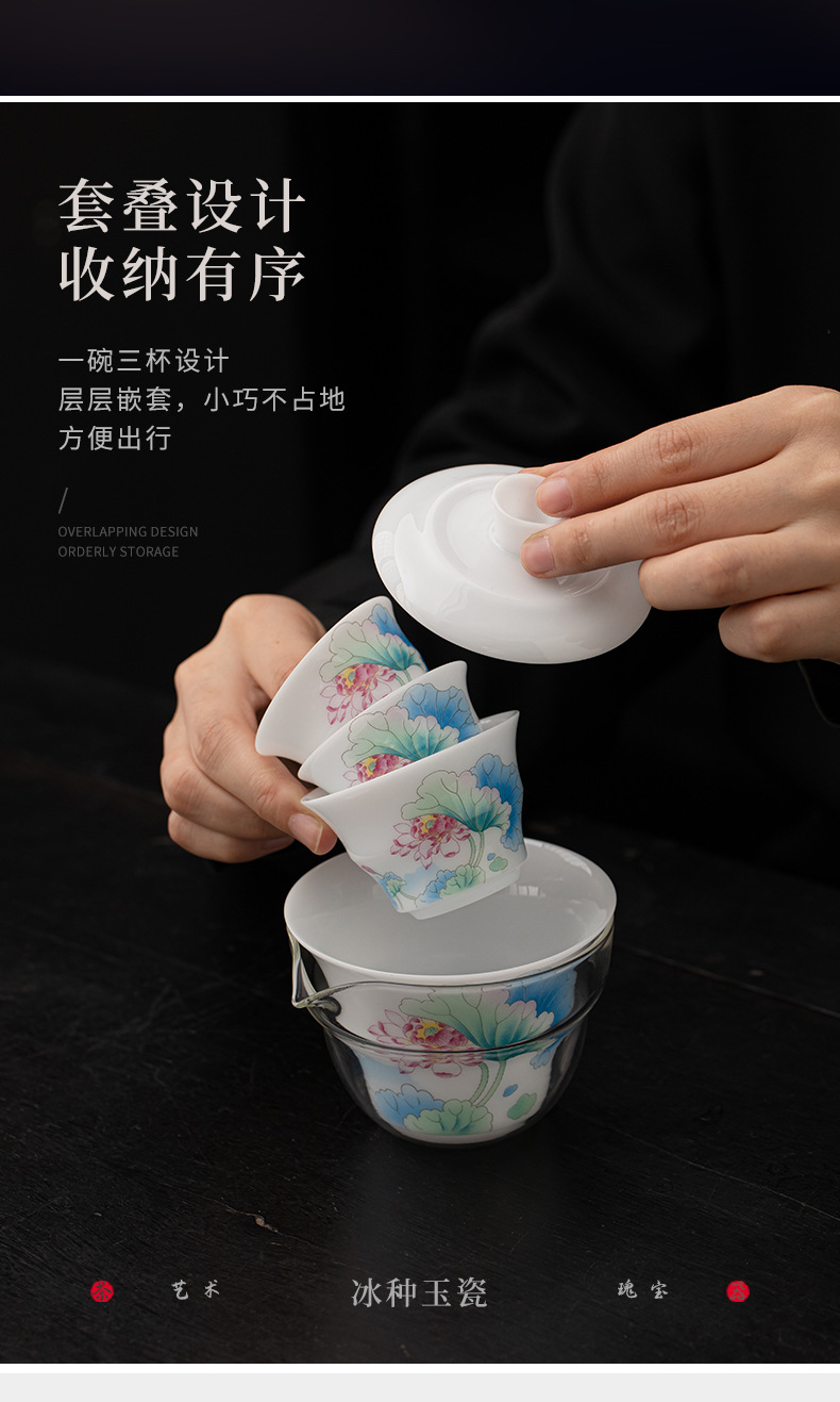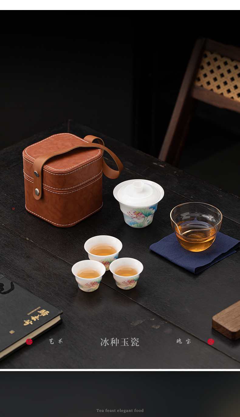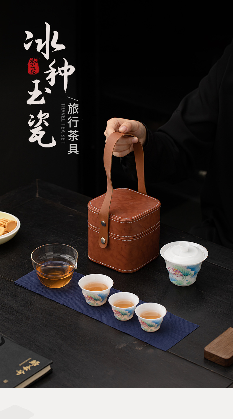 Bộ trà du lịch hoa sen bằng sứ ngọc bích phong cách Trung Quốc mới ngoài trời di động nhanh cốc gốm sứ một bát ba cốc trà