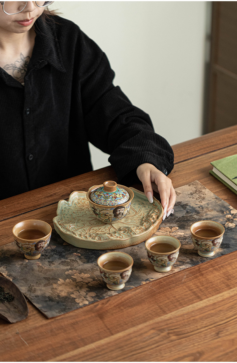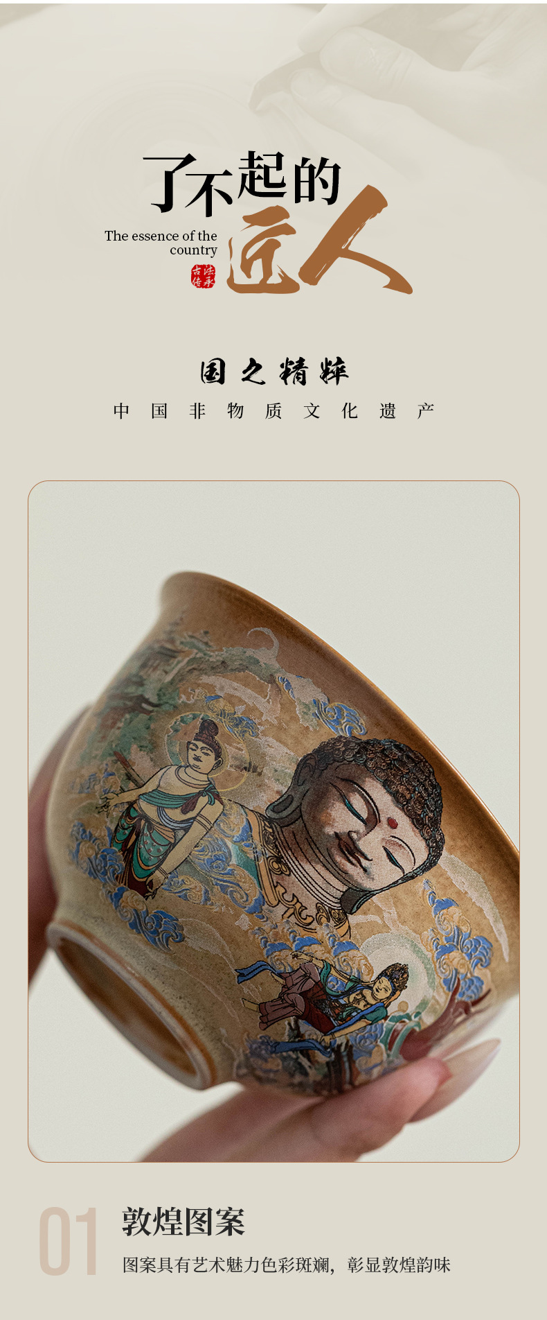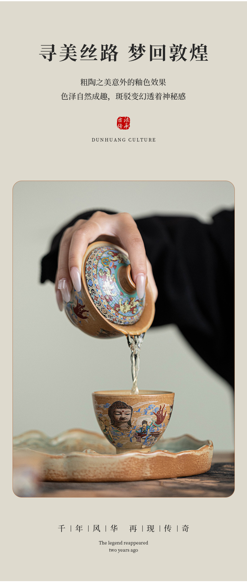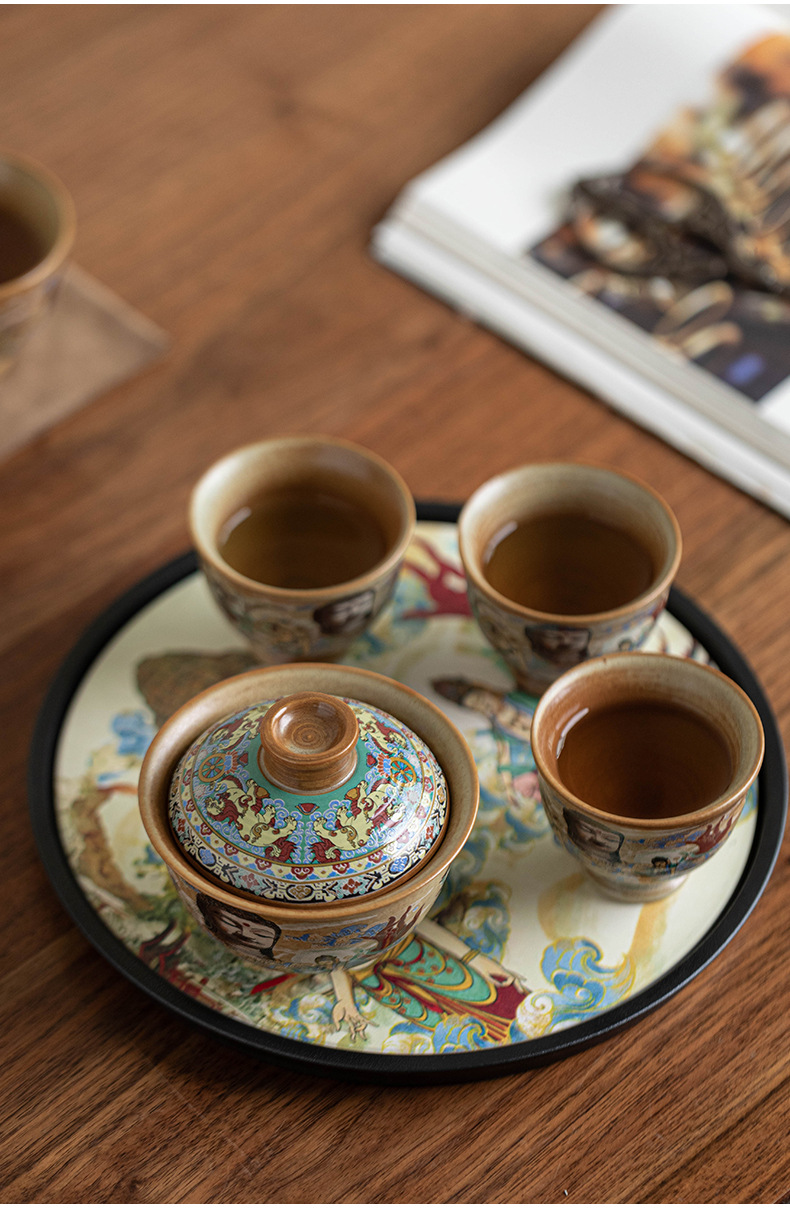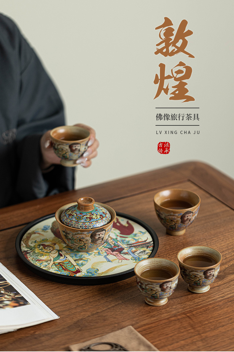 - Bộ trà du lịch tượng Phật Đôn Hoàng một ấm bốn cốc du lịch ngoài trời di động Bộ trà Kung Fu gốm sứ gia dụng