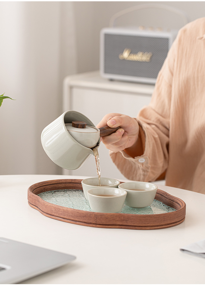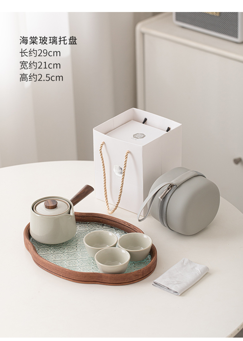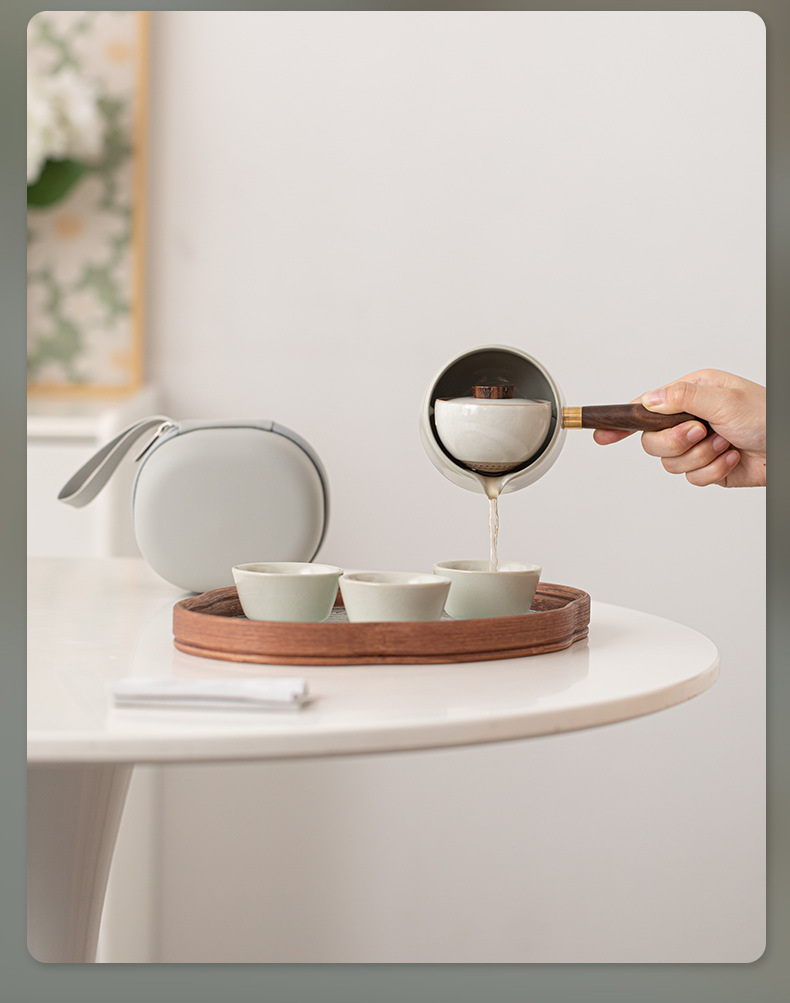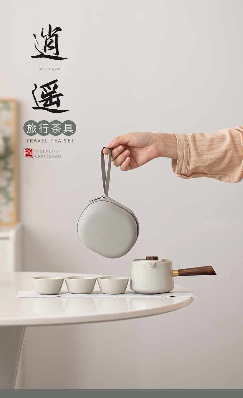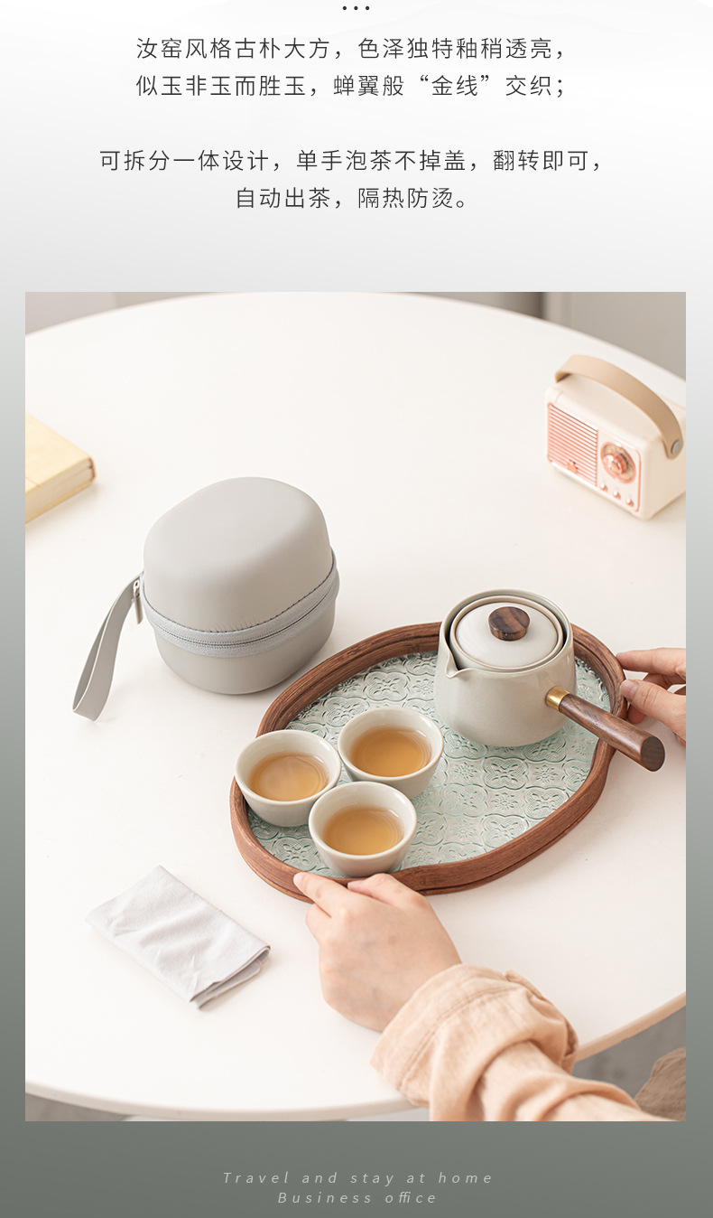 - Bộ trà du lịch Xiaoyao Bộ trà gốm sứ Ru Kiln một ấm ba cốc cốc chở khách di động Bộ trà xe hơi ngoài trời có khay trà
