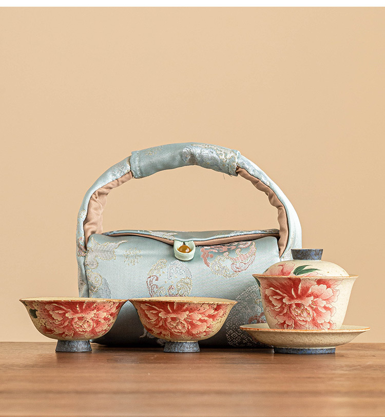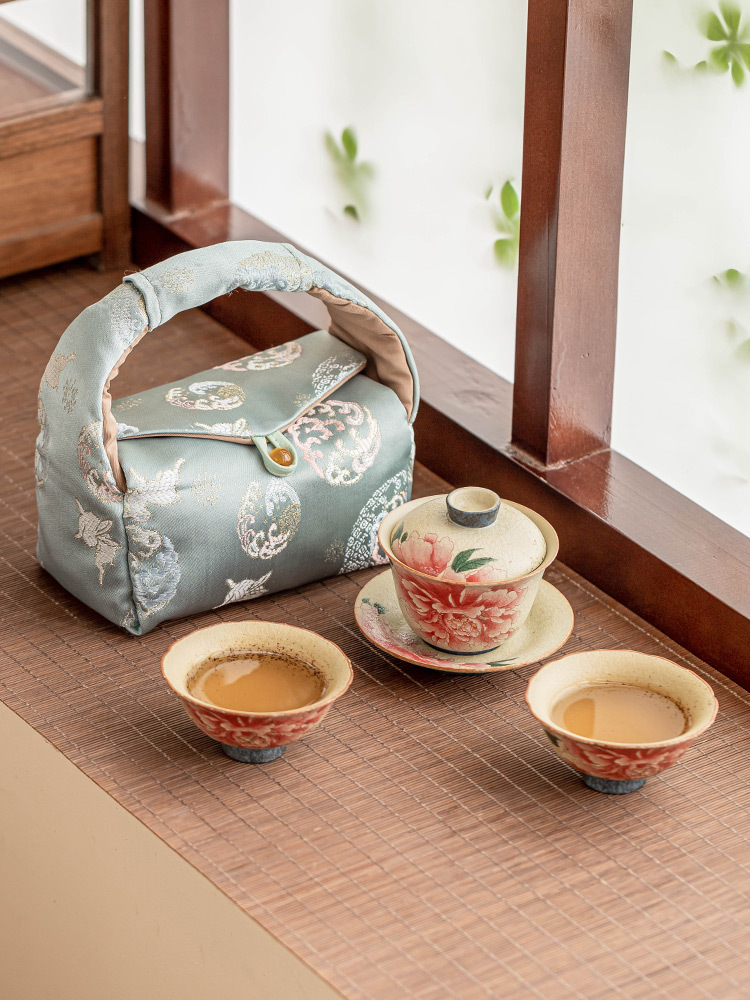 - Bộ trà gốm sứ đỏ đá lửa trắng xanh có nắp bát du lịch ngoài trời bộ nhỏ túi đựng đồ xách tay quốc triều cốc khách nhanh