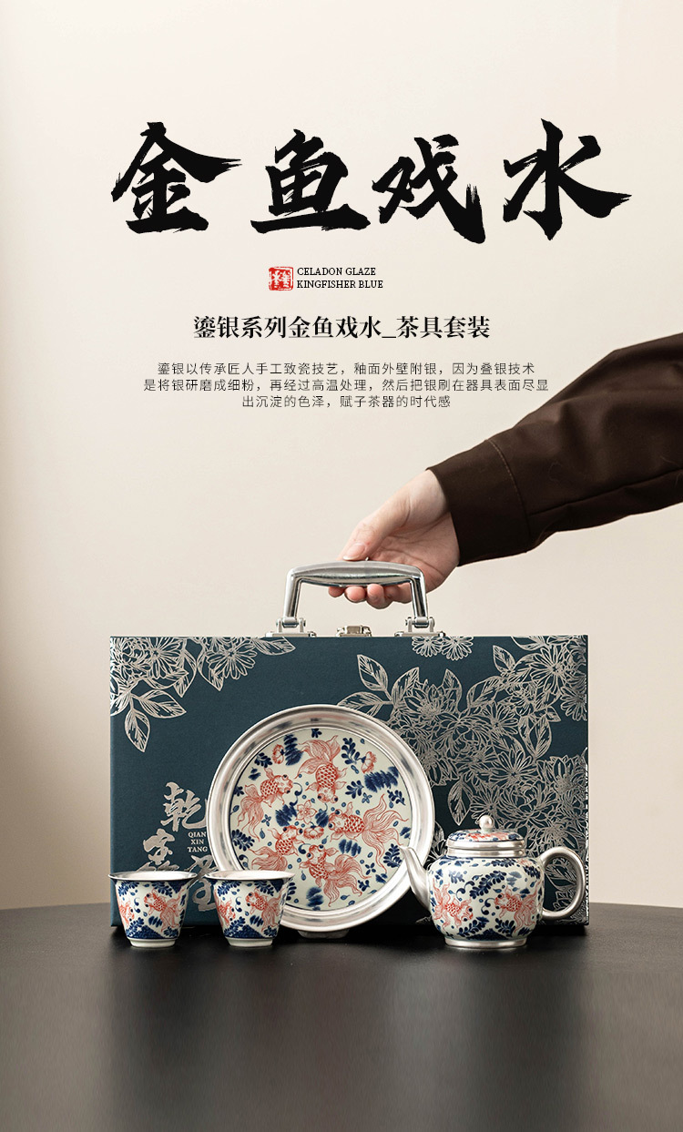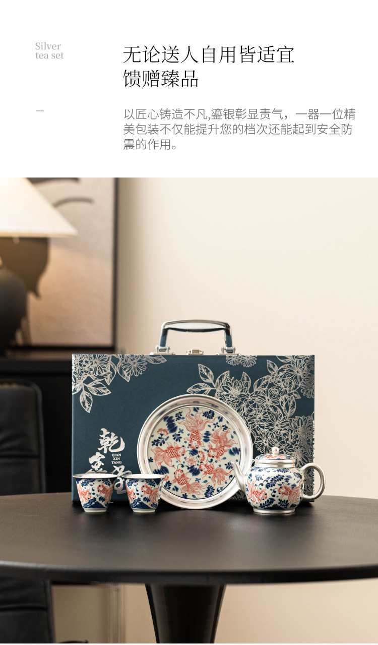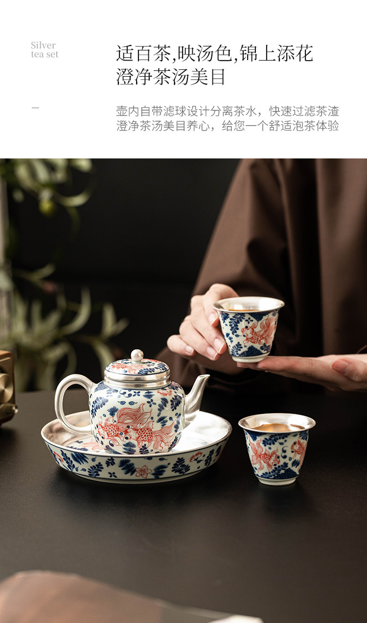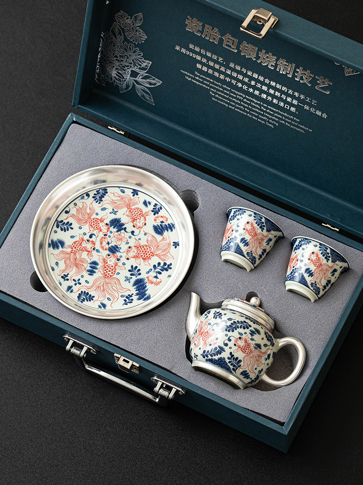 Bộ trà mạ bạc cá vàng chơi nước 999 hộp quà cao cấp một ấm hai chén ấm trà khay trà uống trà dụng cụ pha trà