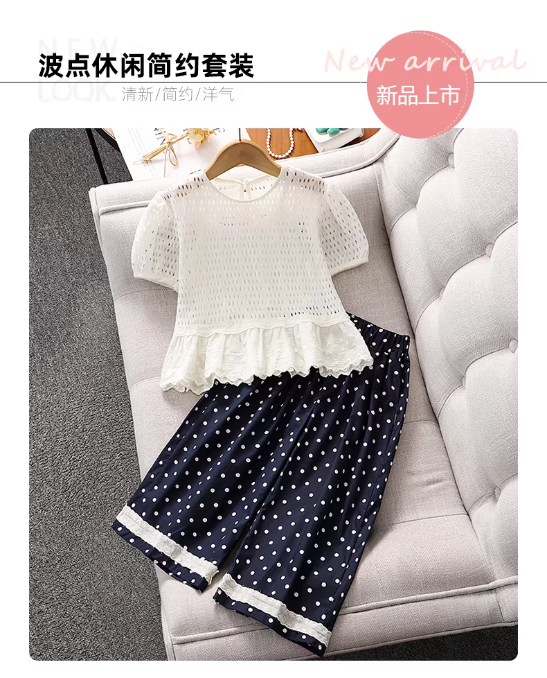- Bộ trang phục hè 2025 cho bé gái: Áo thun ngắn tay khoét lỗ, váy hè, quần ống rộng chấm bi ba món