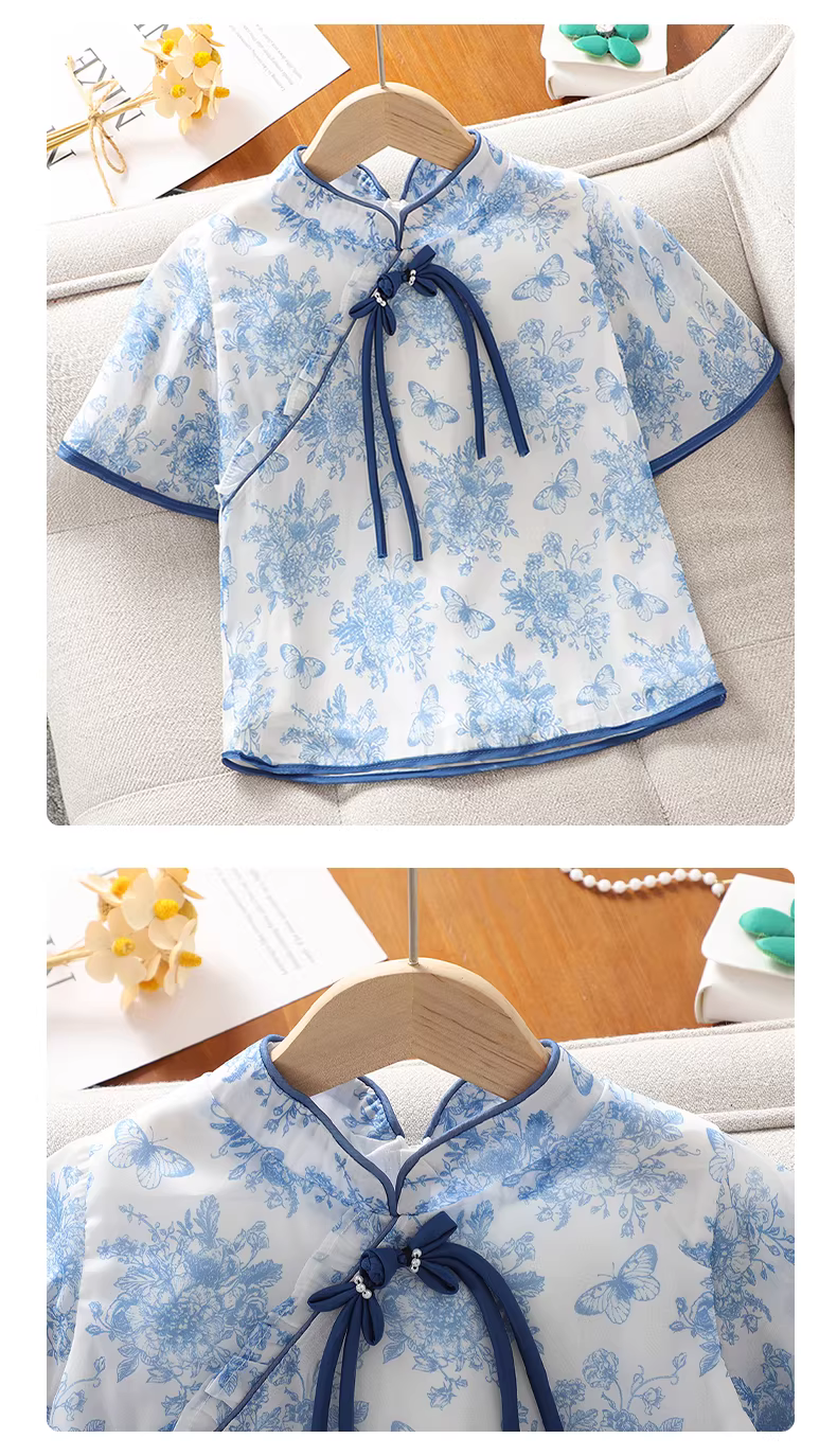 - Bộ trang phục hè cho bé gái 2025 kiểu mới phong cách Trung Hoa, bộ đồ hai mảnh mỏng màu xanh trắng sứ ngọt ngào dành cho trẻ lớn