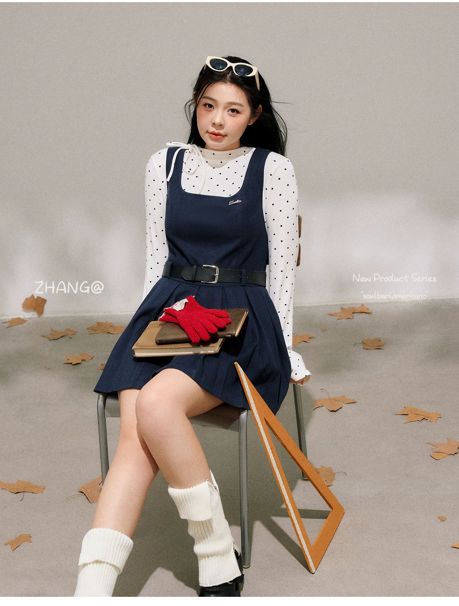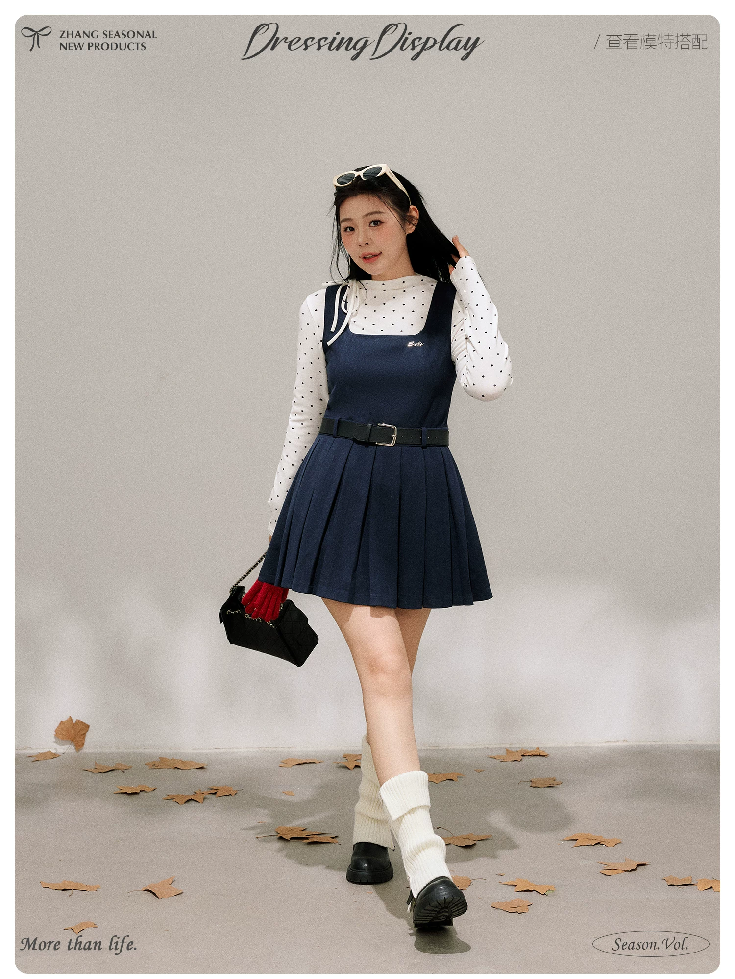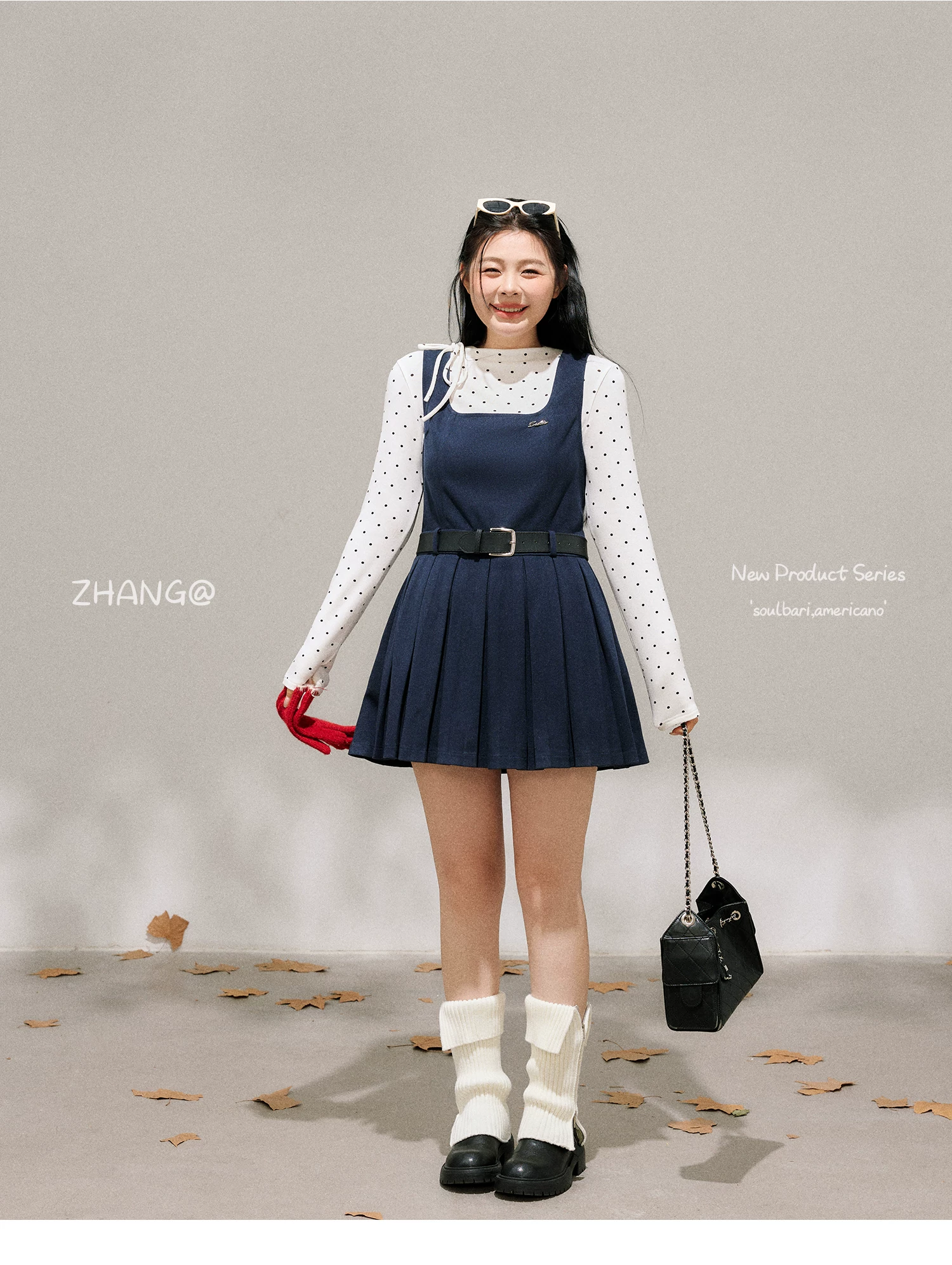 - Bộ trang phục nữ cỡ lớn dành cho người lớn, phong cách Hàn Quốc, mùa đông, kiểu dáng thon gọn, chân váy xếp ly có dây đeo, kèm áo sơ mi chấm bi.