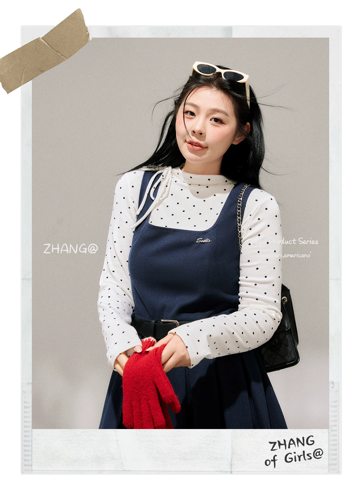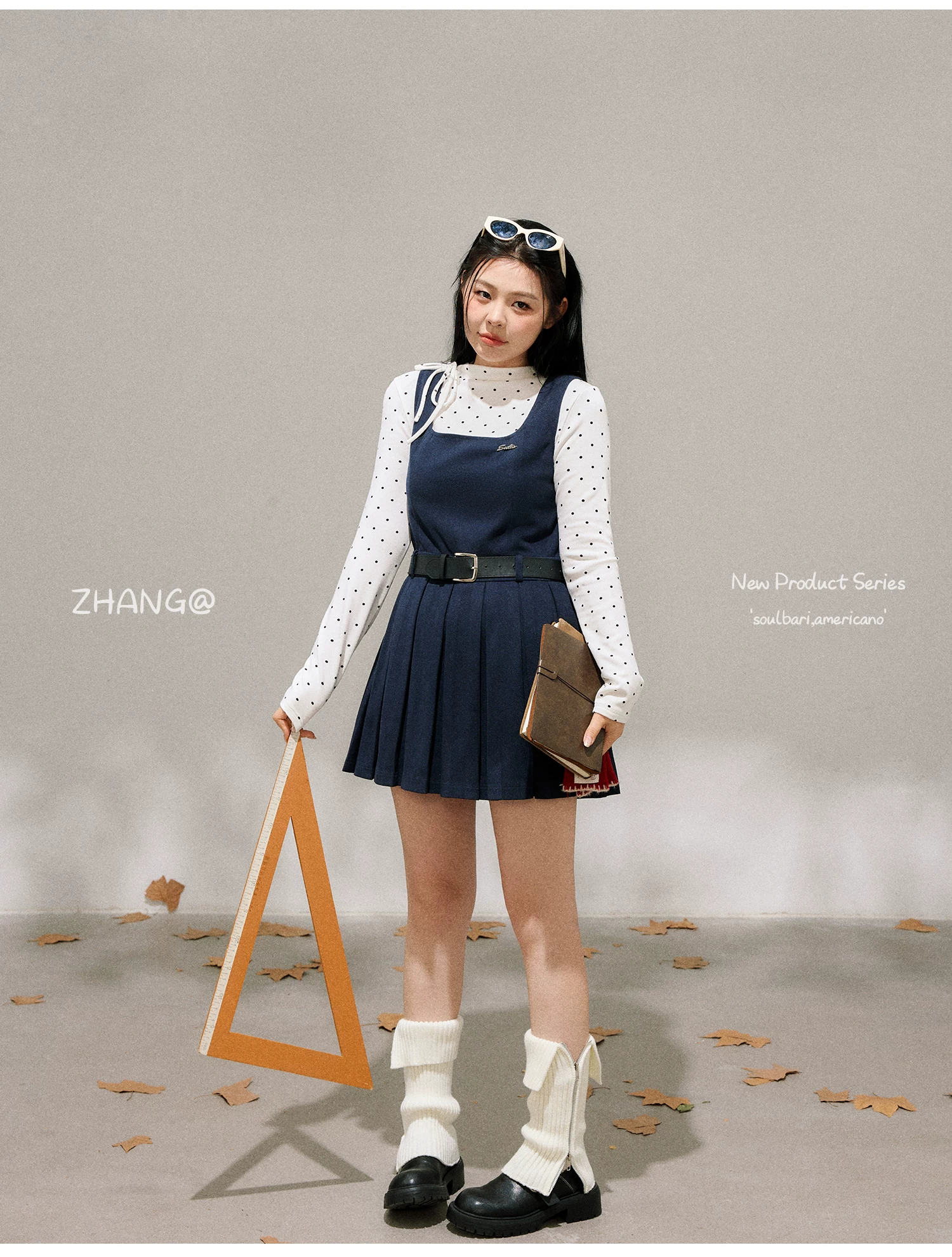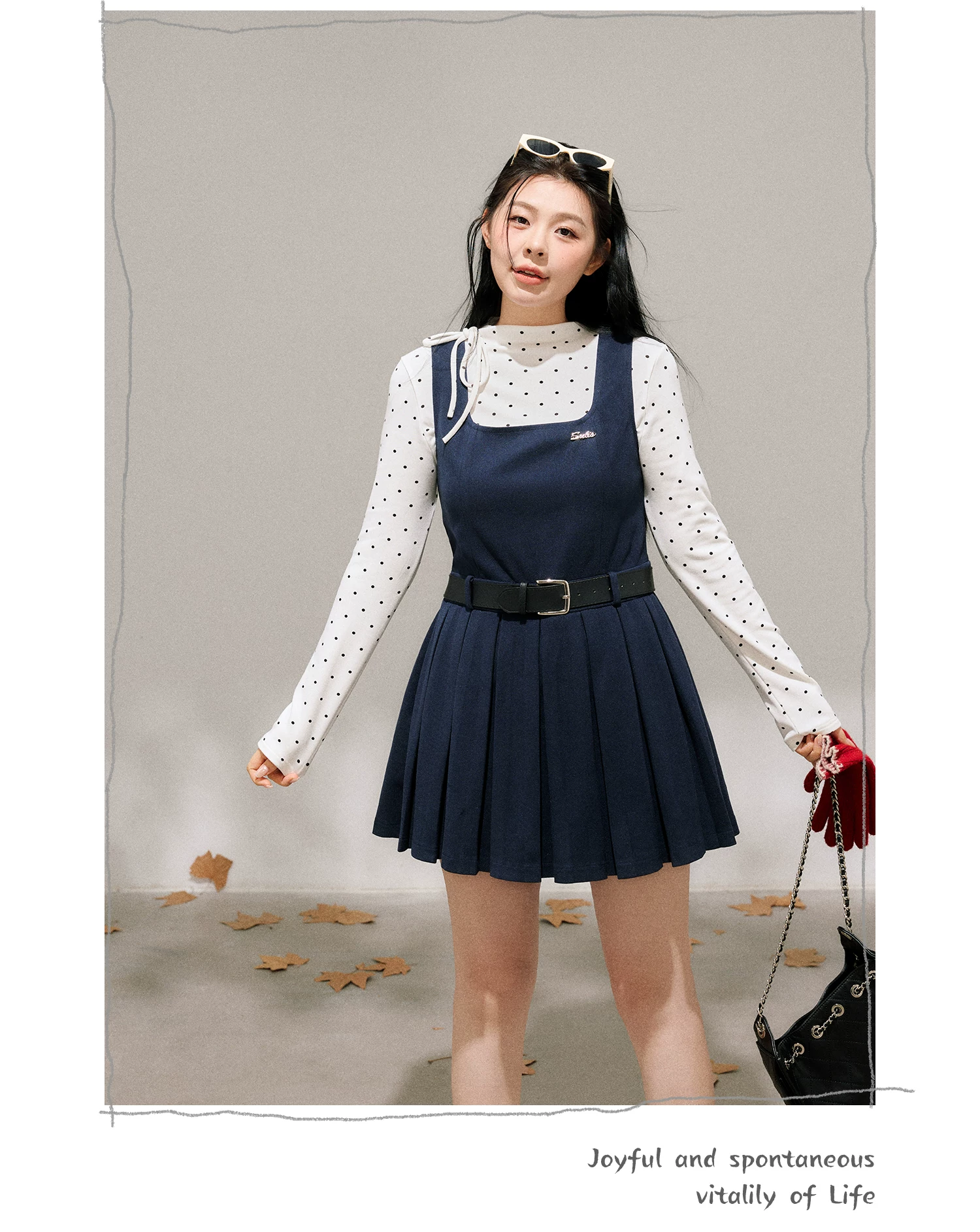 - Bộ trang phục nữ cỡ lớn dành cho người lớn, phong cách Hàn Quốc, mùa đông, kiểu dáng thon gọn, chân váy xếp ly có dây đeo, kèm áo sơ mi chấm bi.
