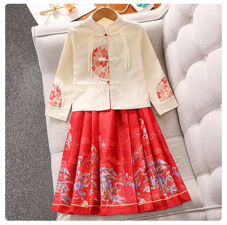 - Bộ váy kiểu mặt ngựa dành cho bé gái, kiểu xuân thu 2025 mới, trang phục phong cách Trung Hoa dành cho bé gái, váy Hanfu kiểu Trung Hoa mới dành cho bé gái lớn hơn.