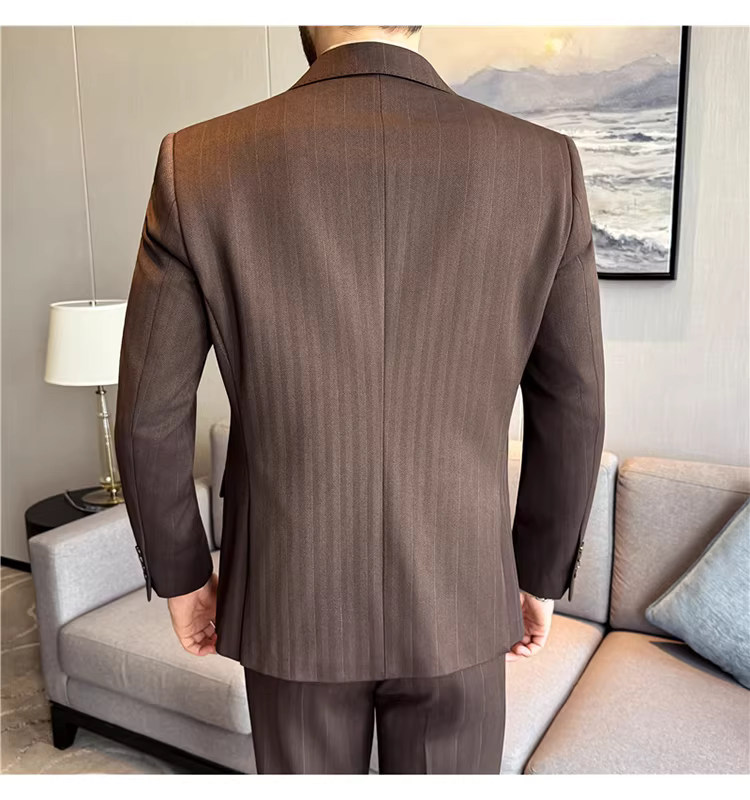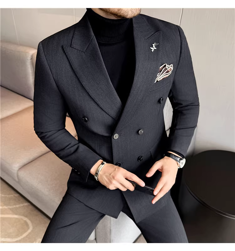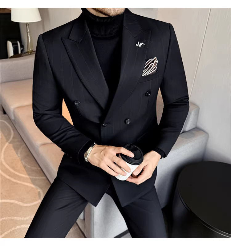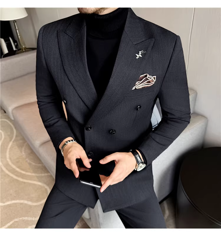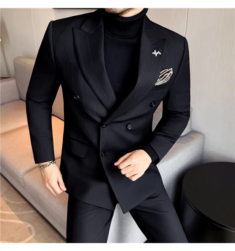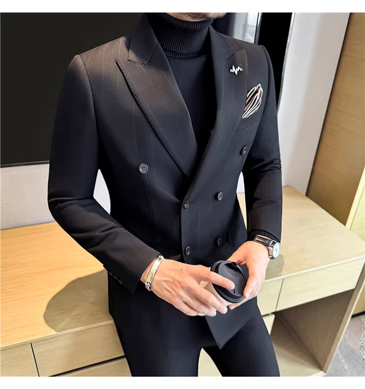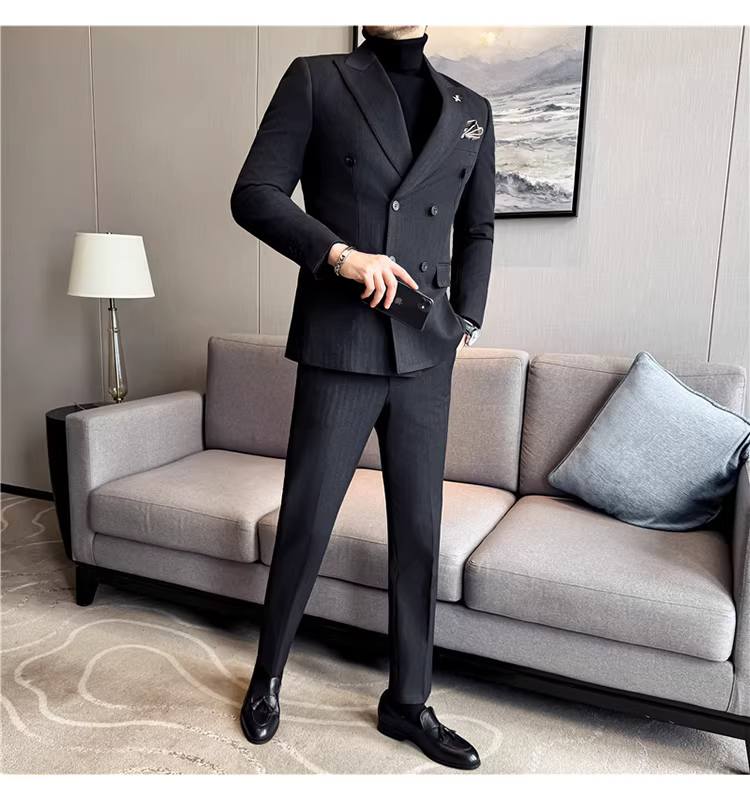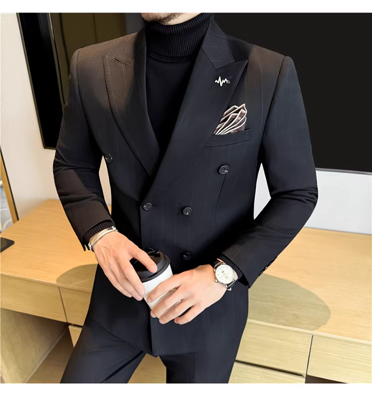 Bộ vest len nam, phối viền đính cườm, cài khuy đôi, kiểu dày dặn, phong cách lịch lãm, đa năng, dáng ôm, kẻ sọc