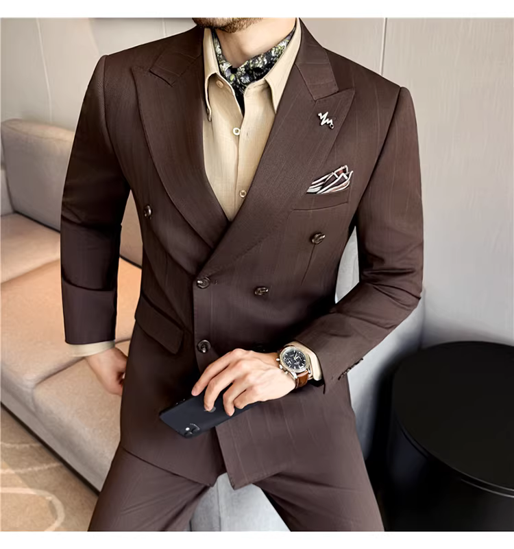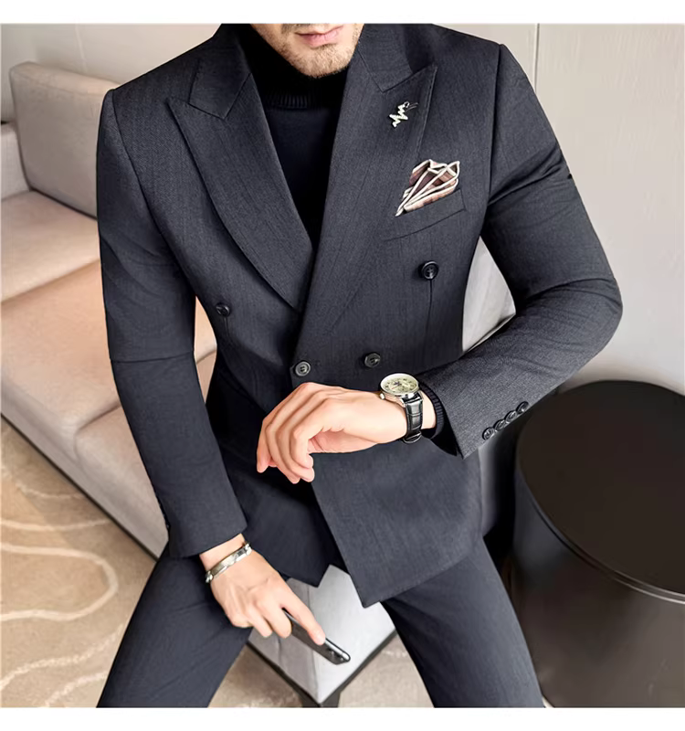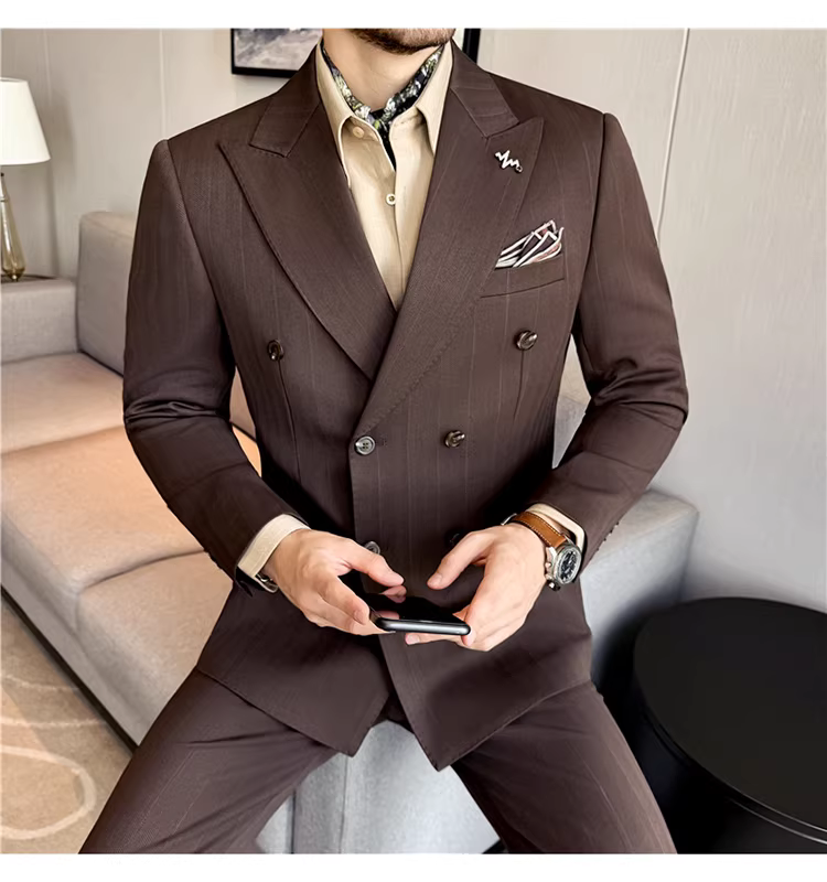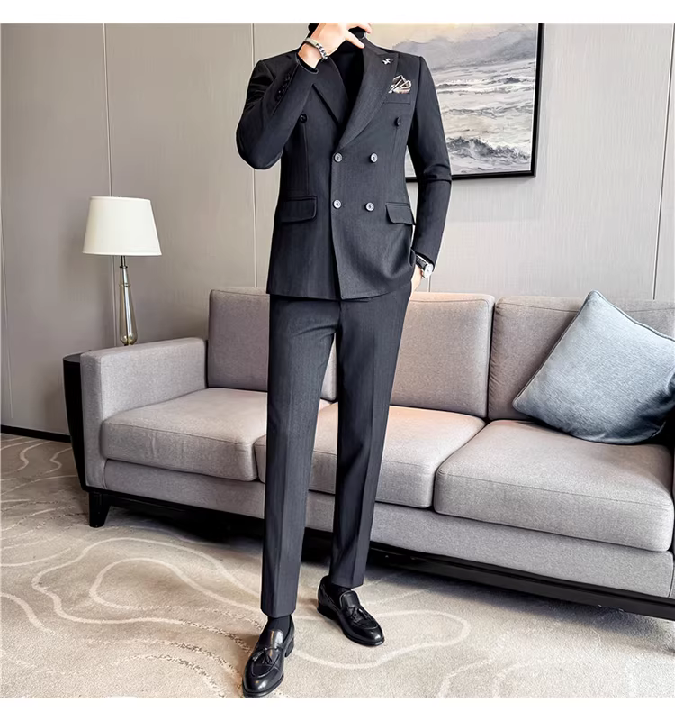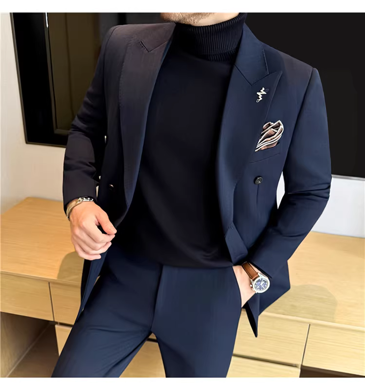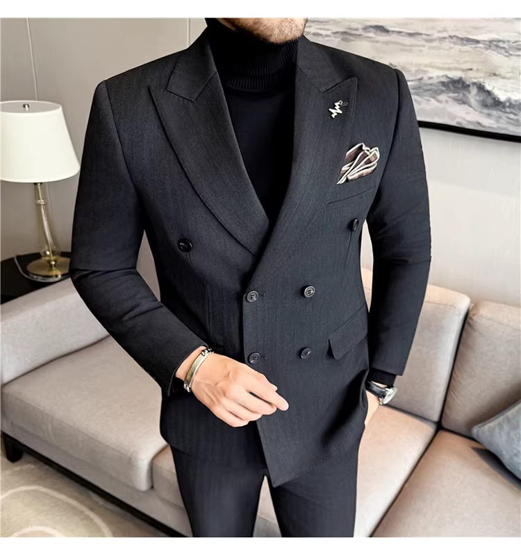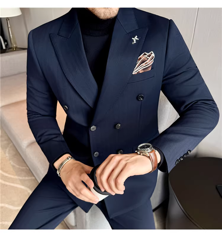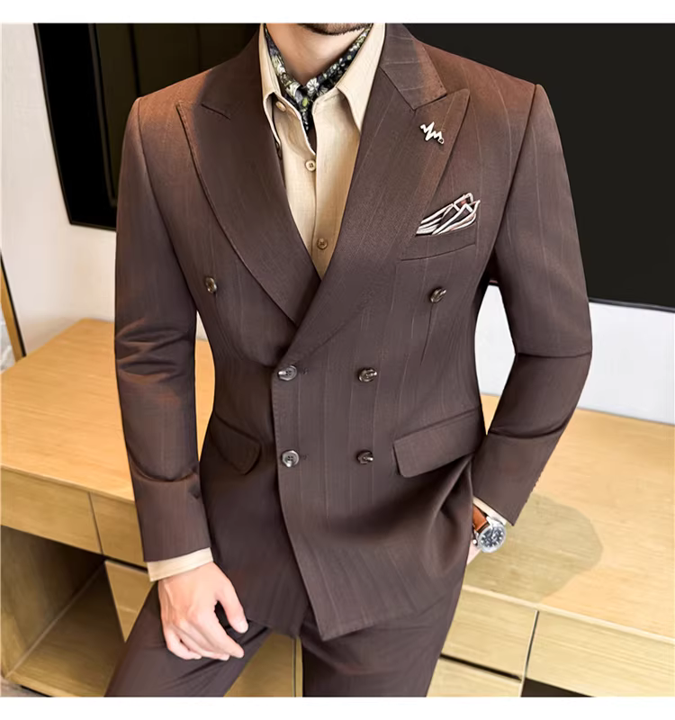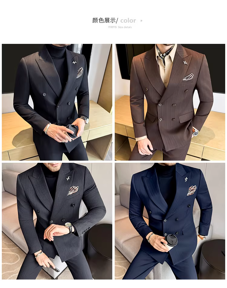 Bộ vest len nam, phối viền đính cườm, cài khuy đôi, kiểu dày dặn, phong cách lịch lãm, đa năng, dáng ôm, kẻ sọc