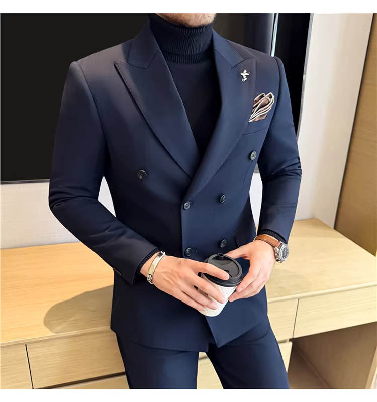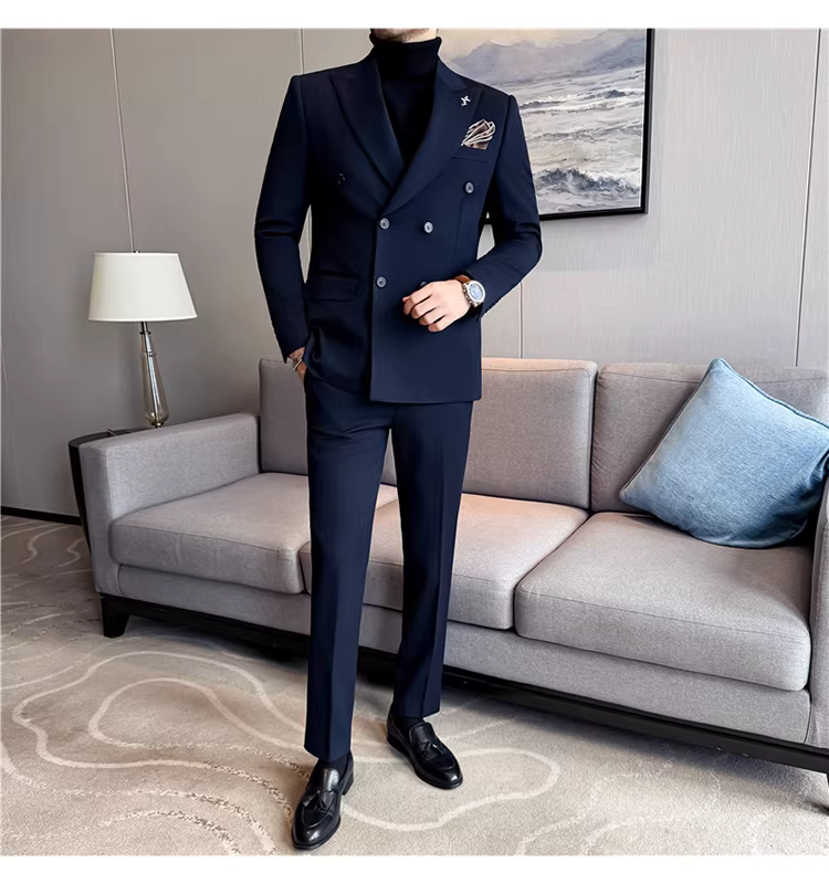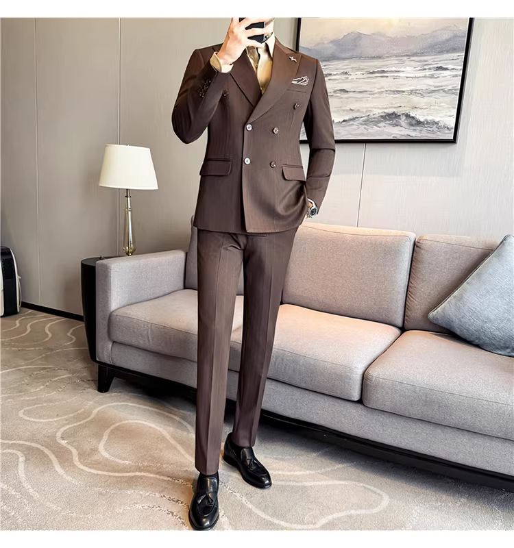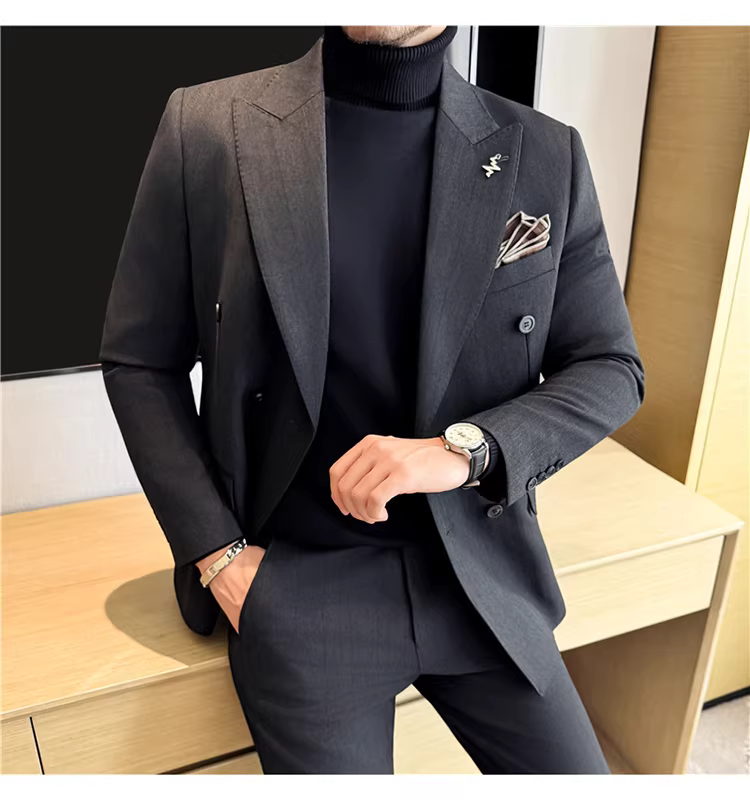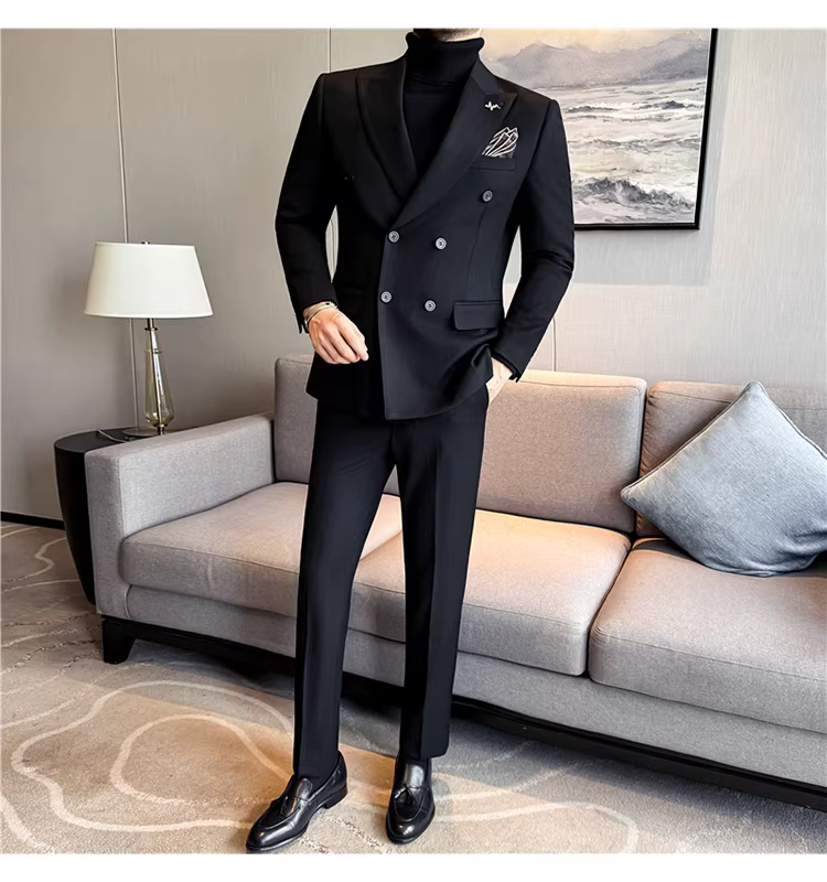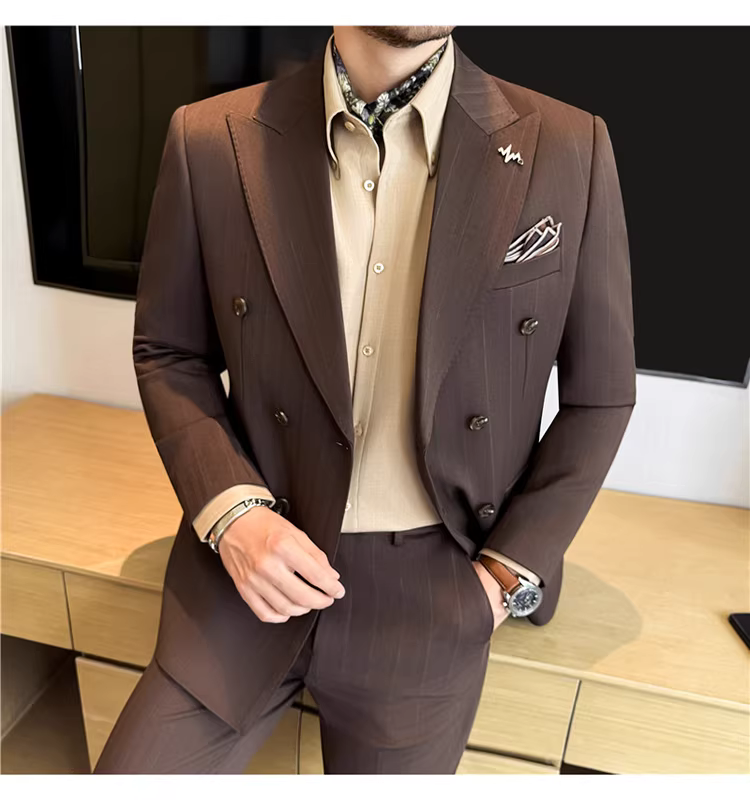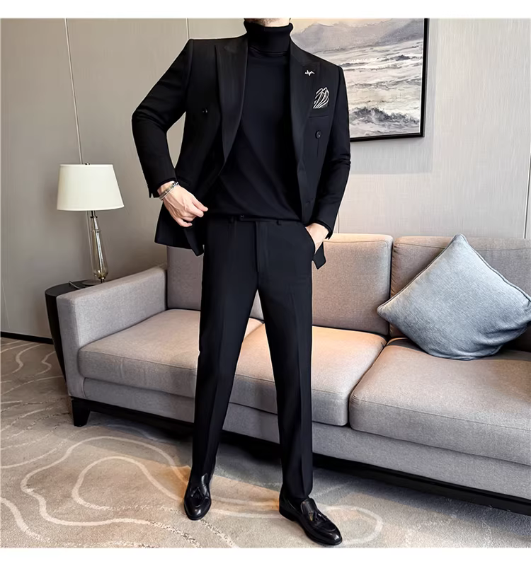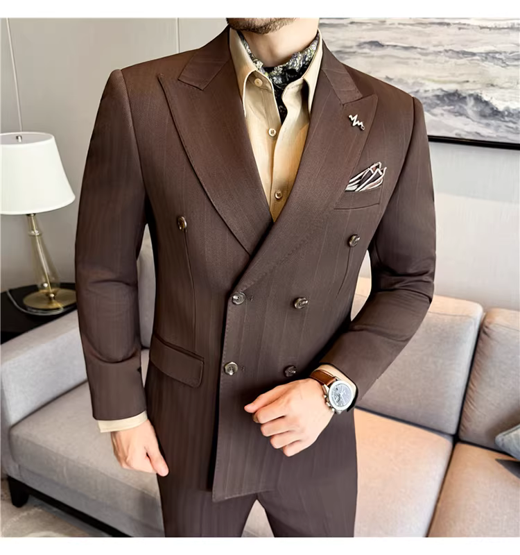 Bộ vest len nam, phối viền đính cườm, cài khuy đôi, kiểu dày dặn, phong cách lịch lãm, đa năng, dáng ôm, kẻ sọc