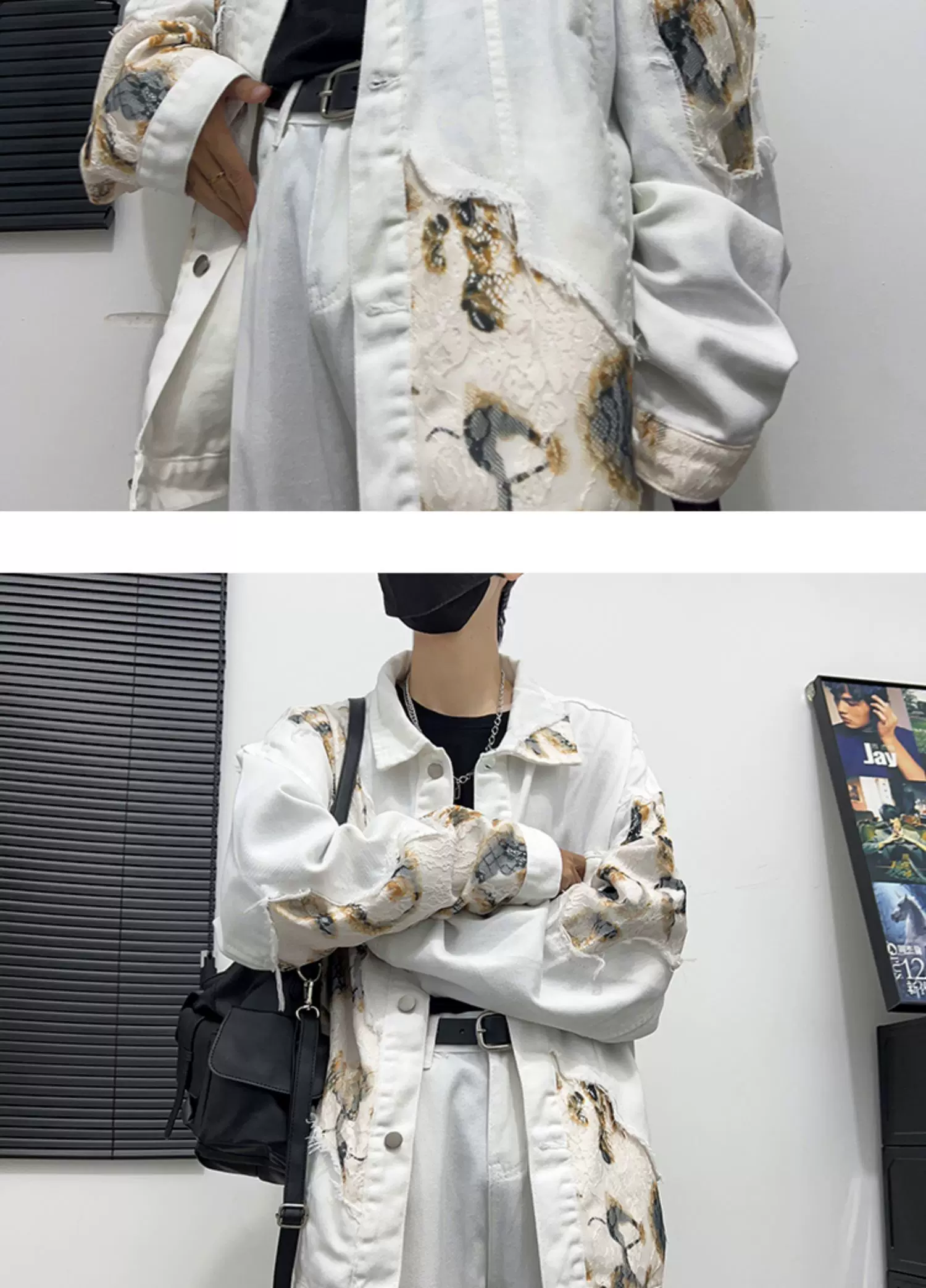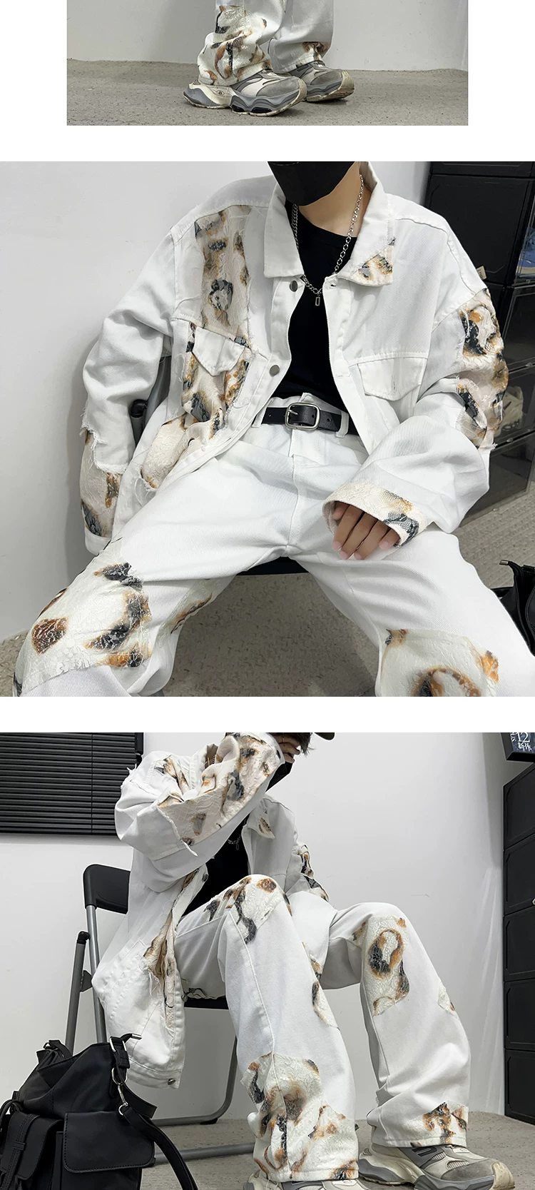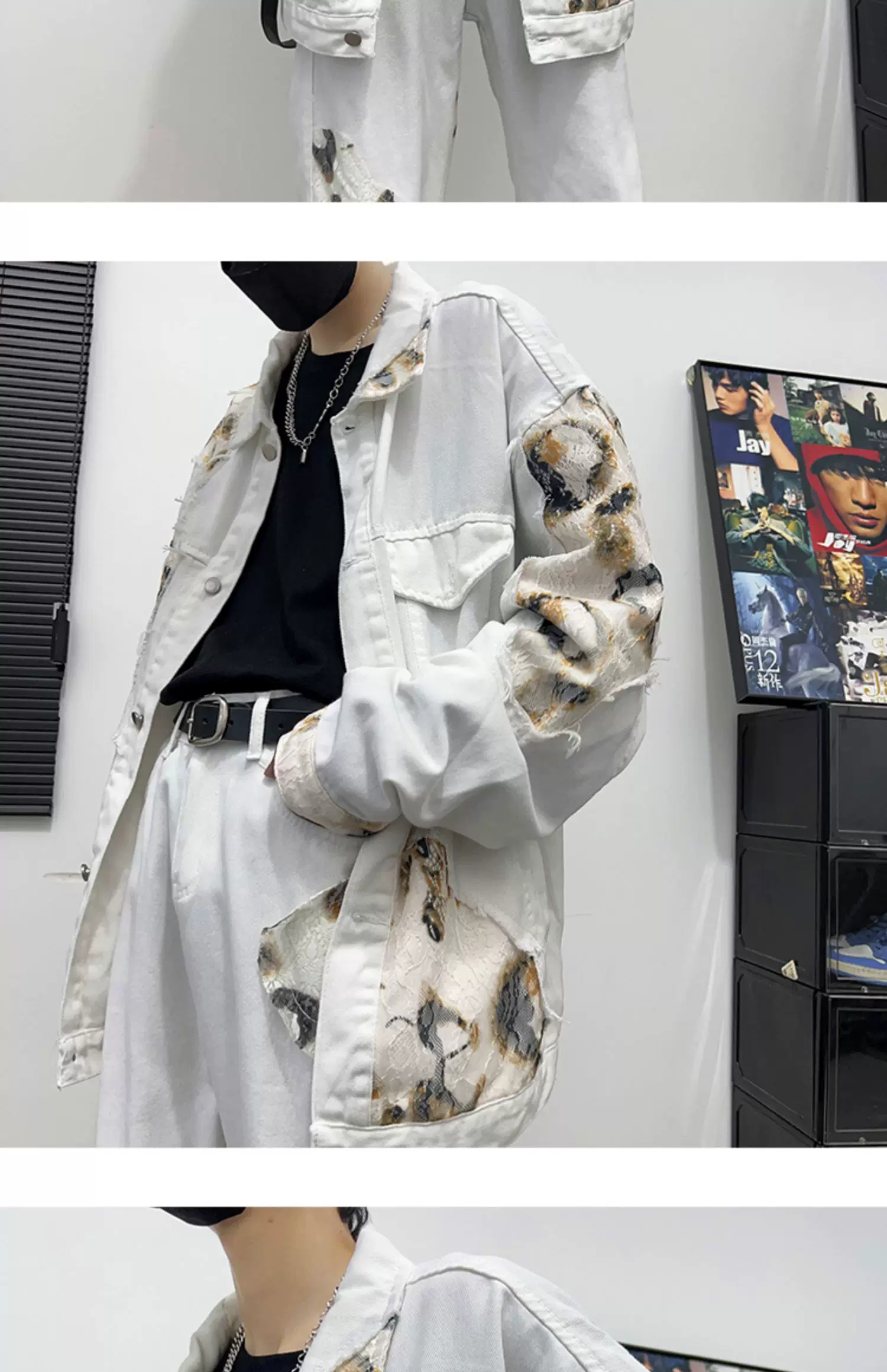 Bộ vest nam phong cách Mỹ thời thượng, mùa xuân thu, dáng rộng, áo khoác denim phối ren và quần.