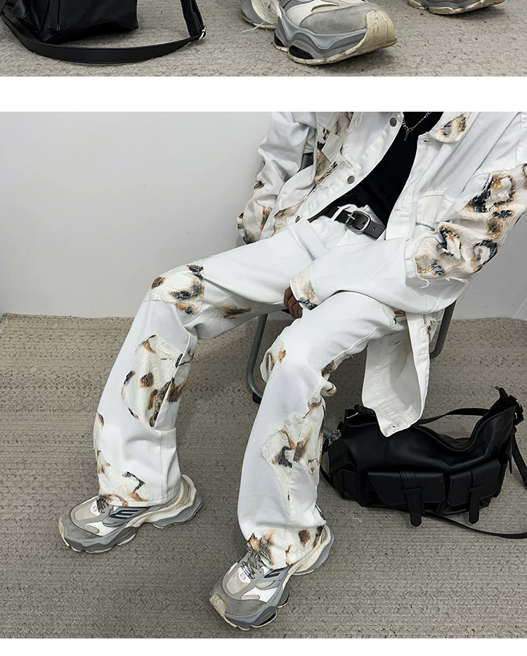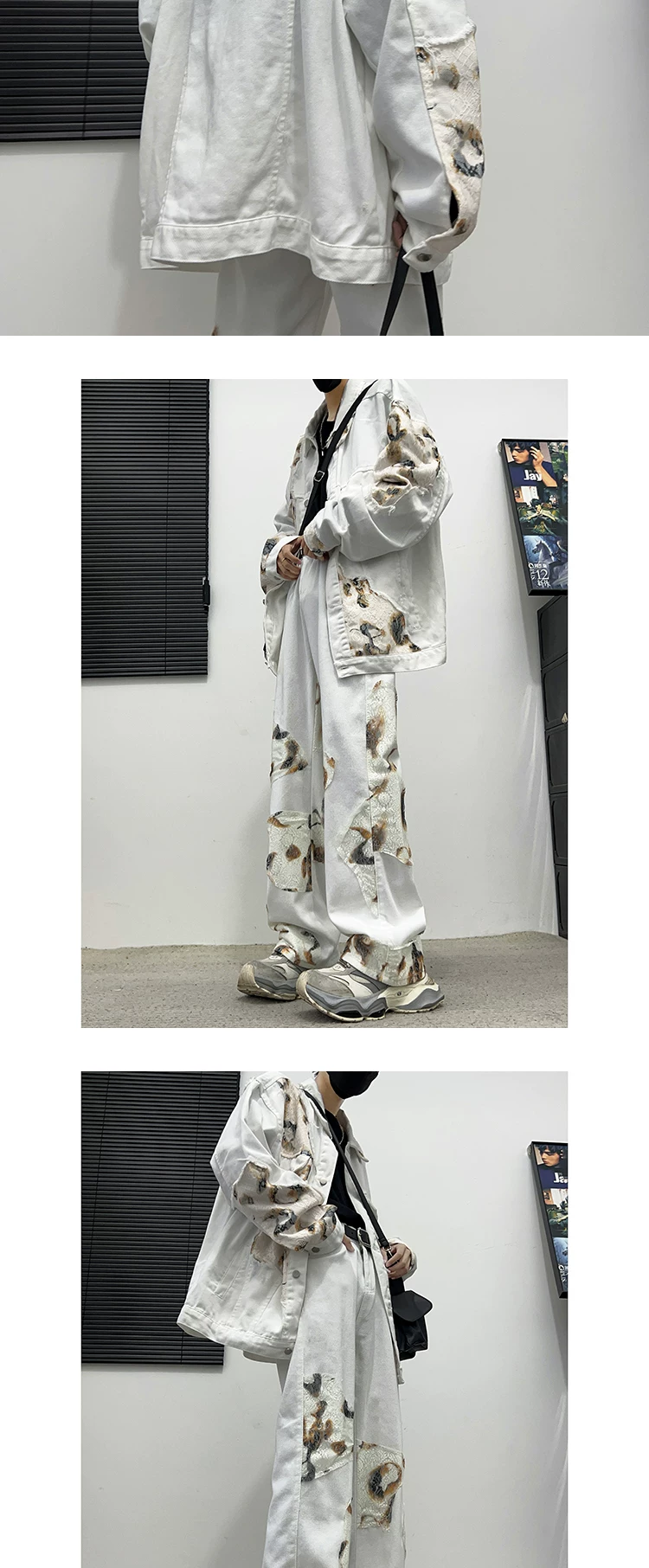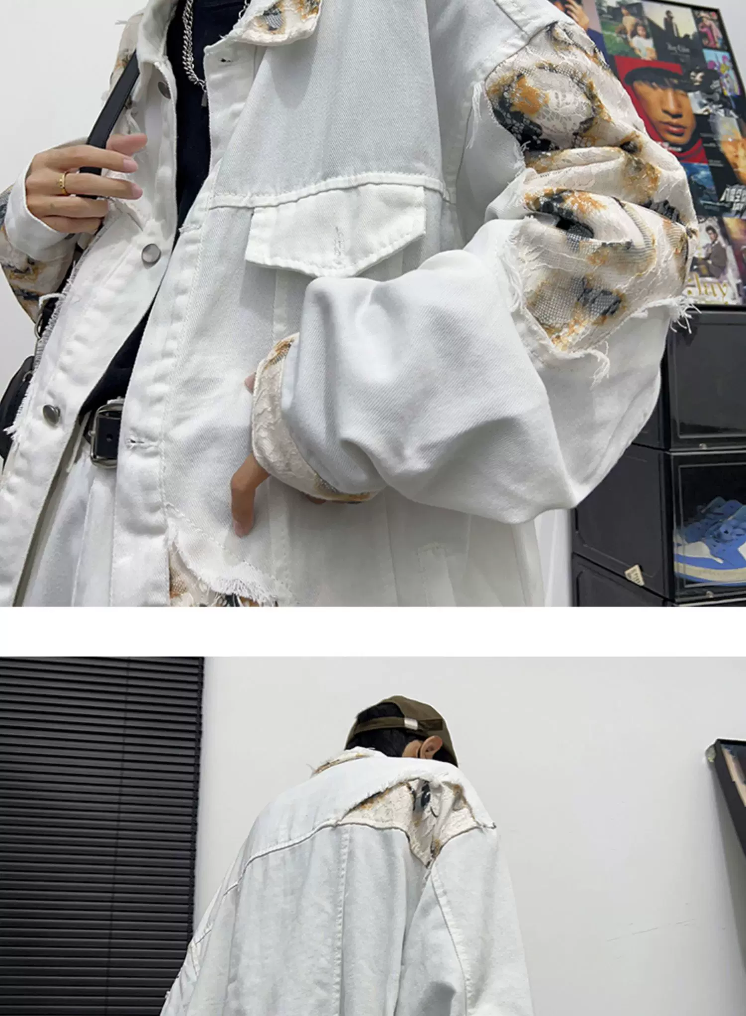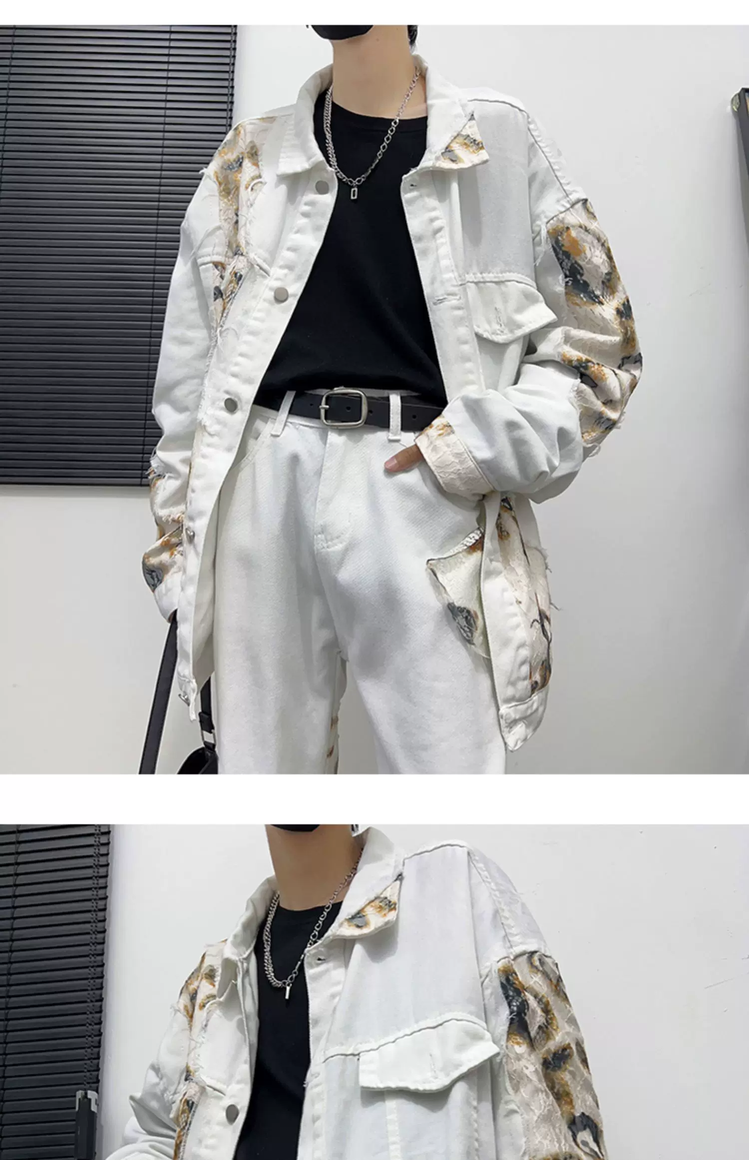 Bộ vest nam phong cách Mỹ thời thượng, mùa xuân thu, dáng rộng, áo khoác denim phối ren và quần.
