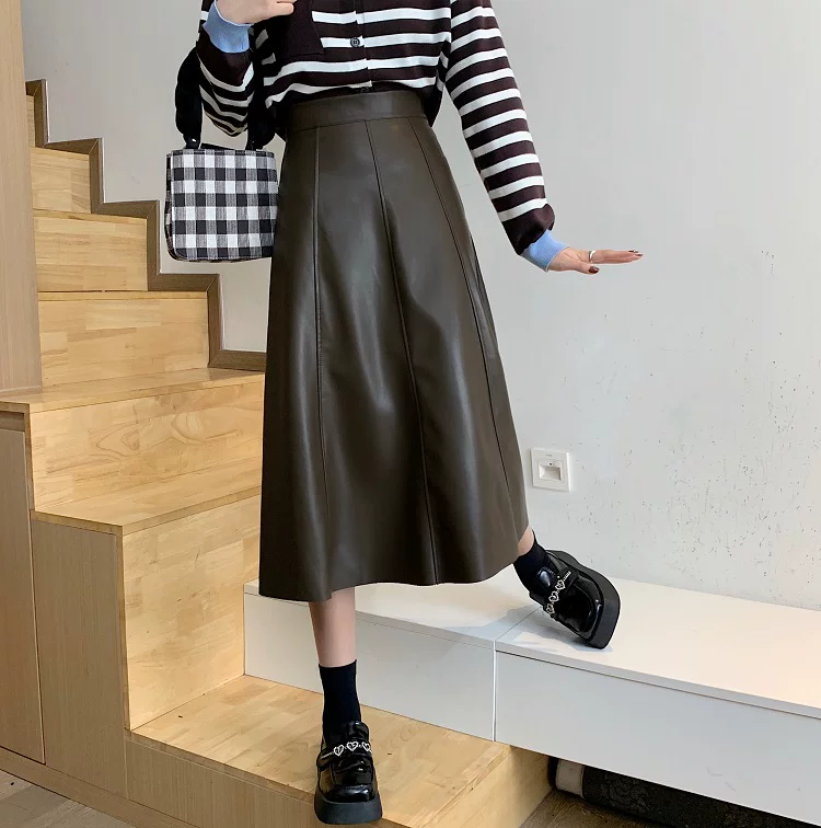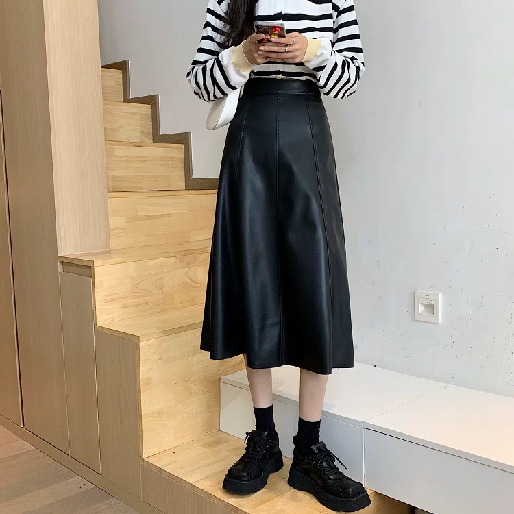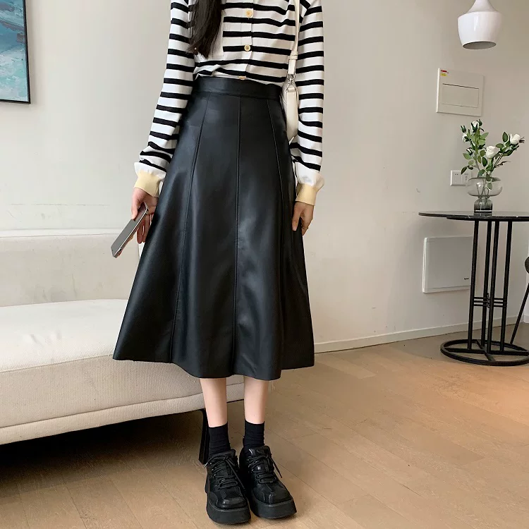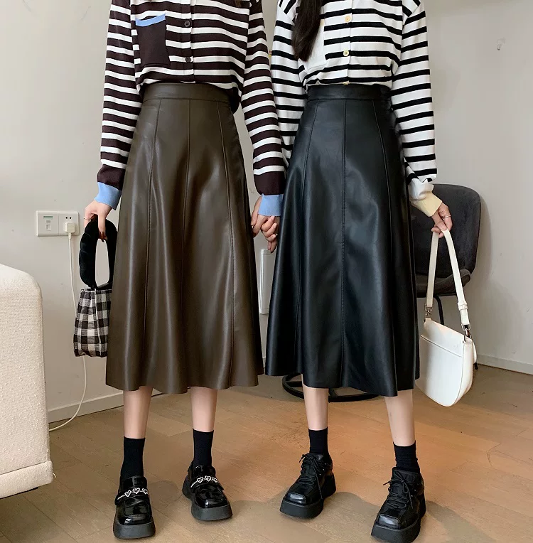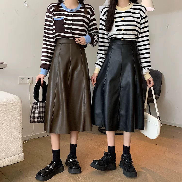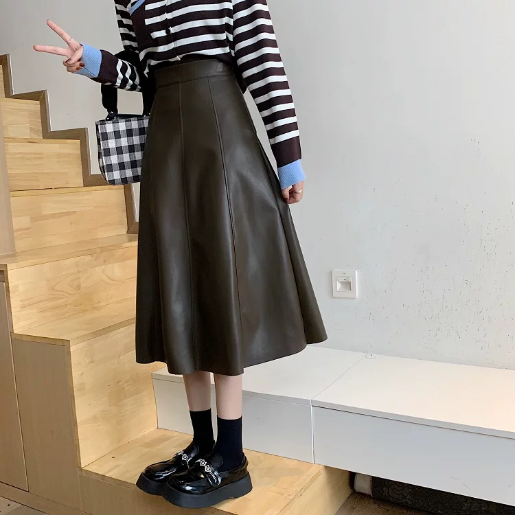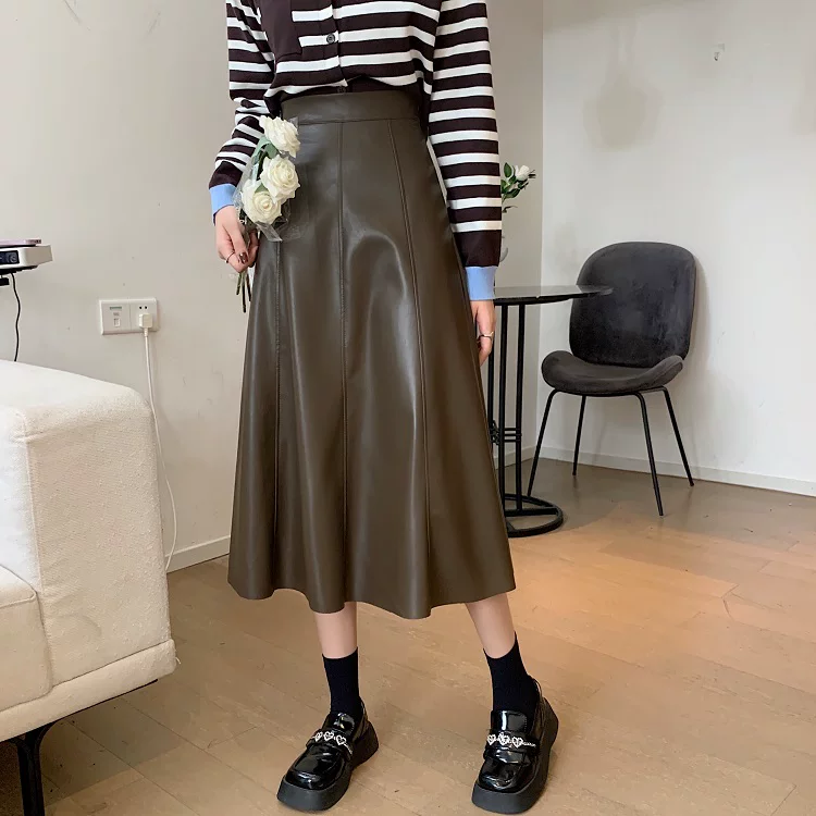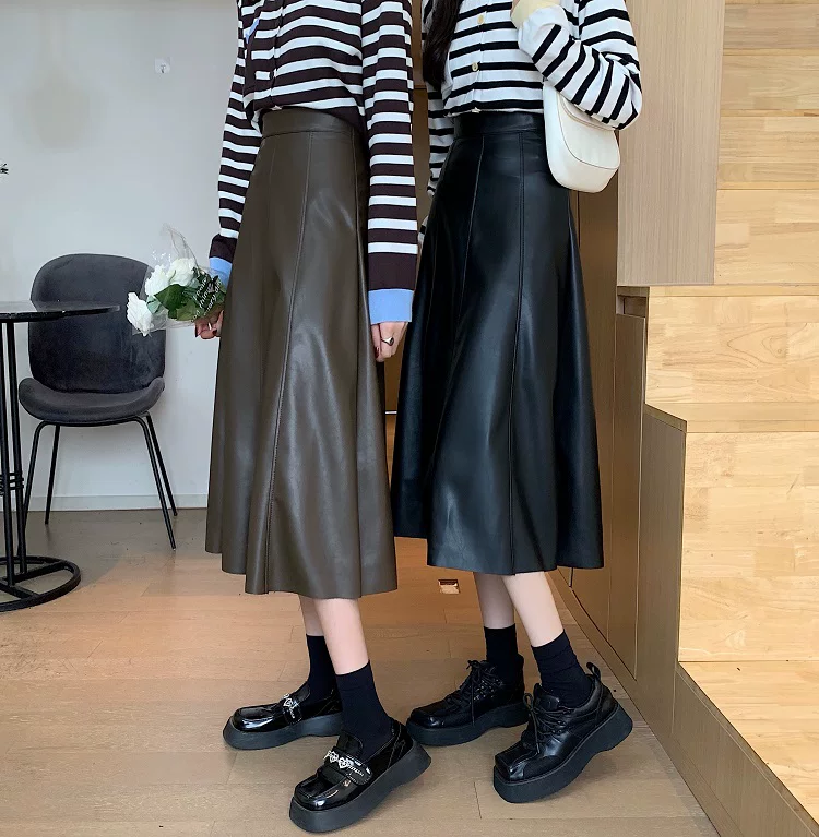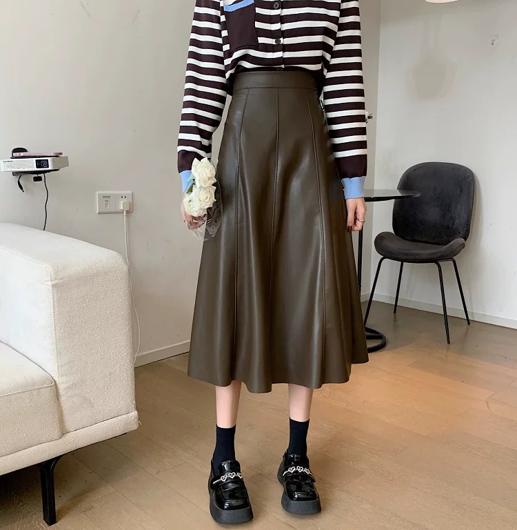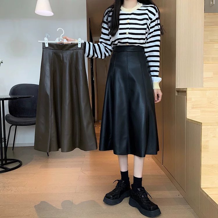 - Chân váy da PU cao cấp dáng chữ A xòe dài trung bình, cạp cao, size lớn, mùa Thu/Đông 2025, có xếp ly và kiểu dáng ô dù