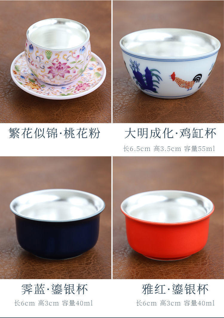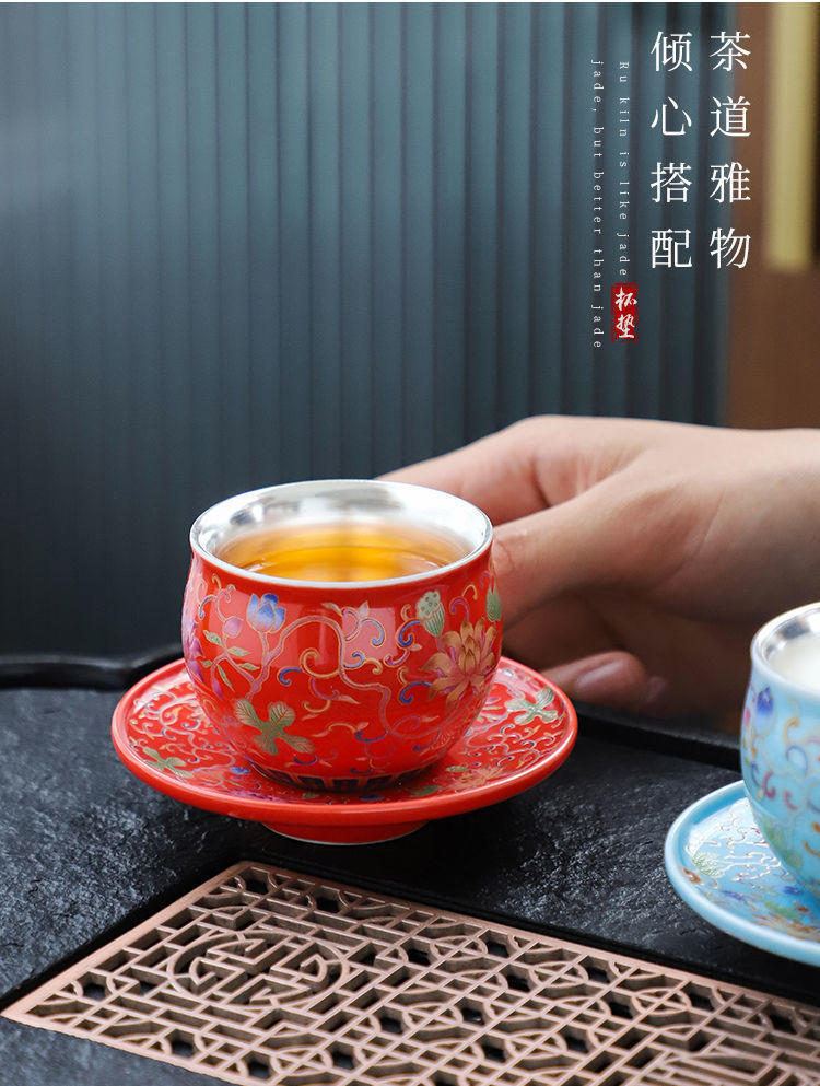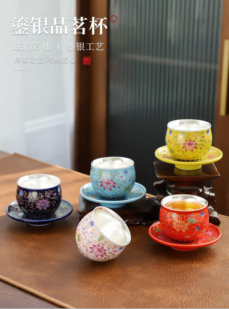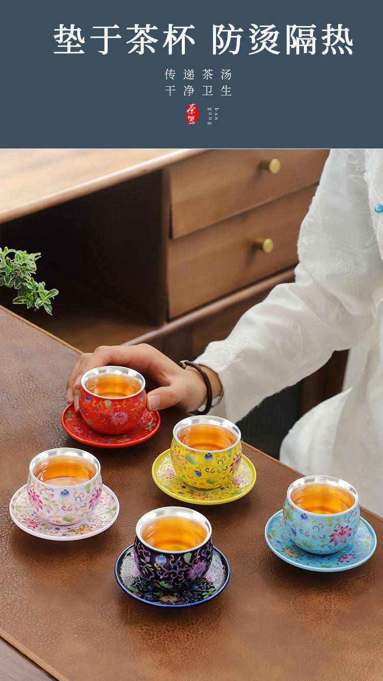 Cốc bạc có đế lót ly 999 cốc trà mạ bạc thủ công bằng bạc nguyên chất men màu Kung Fu tách trà bát trà cốc chủ nhân
