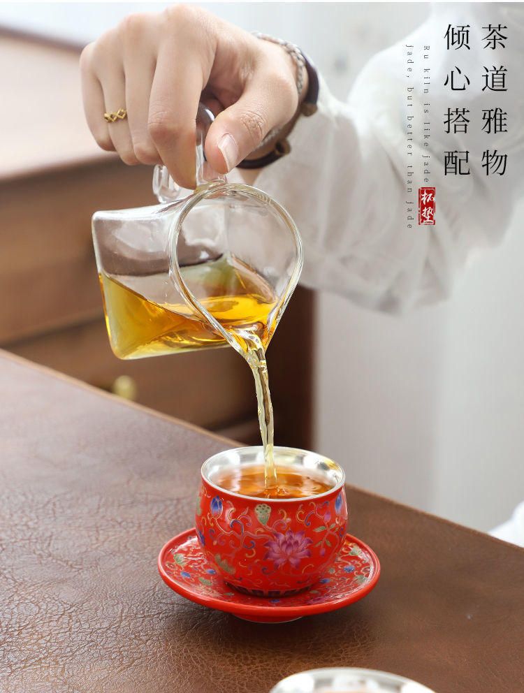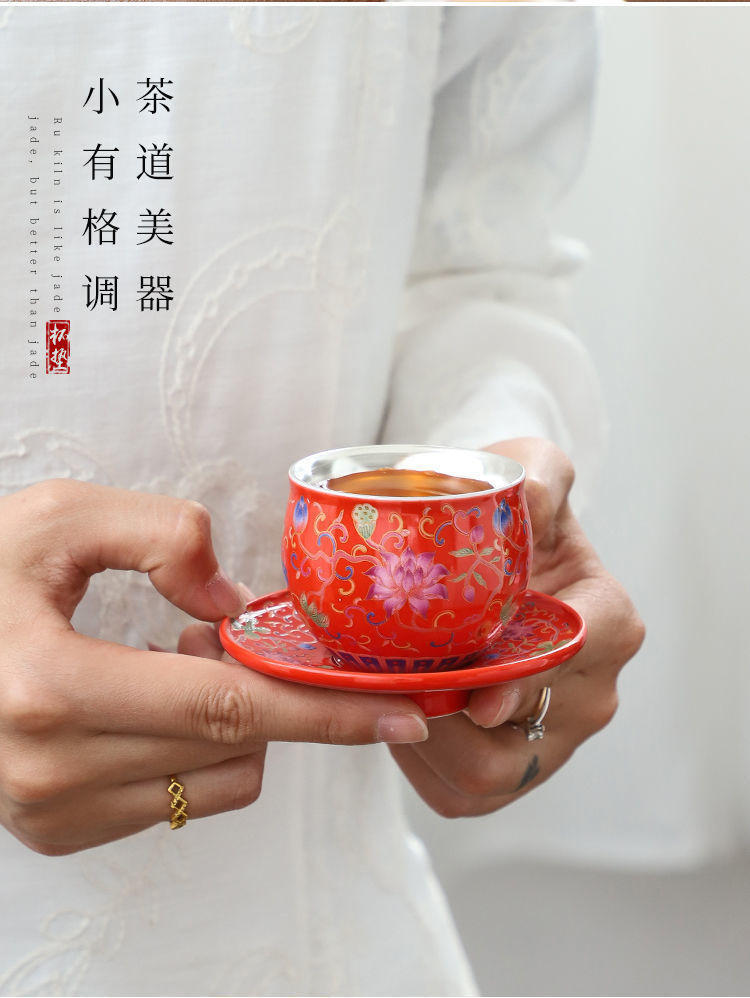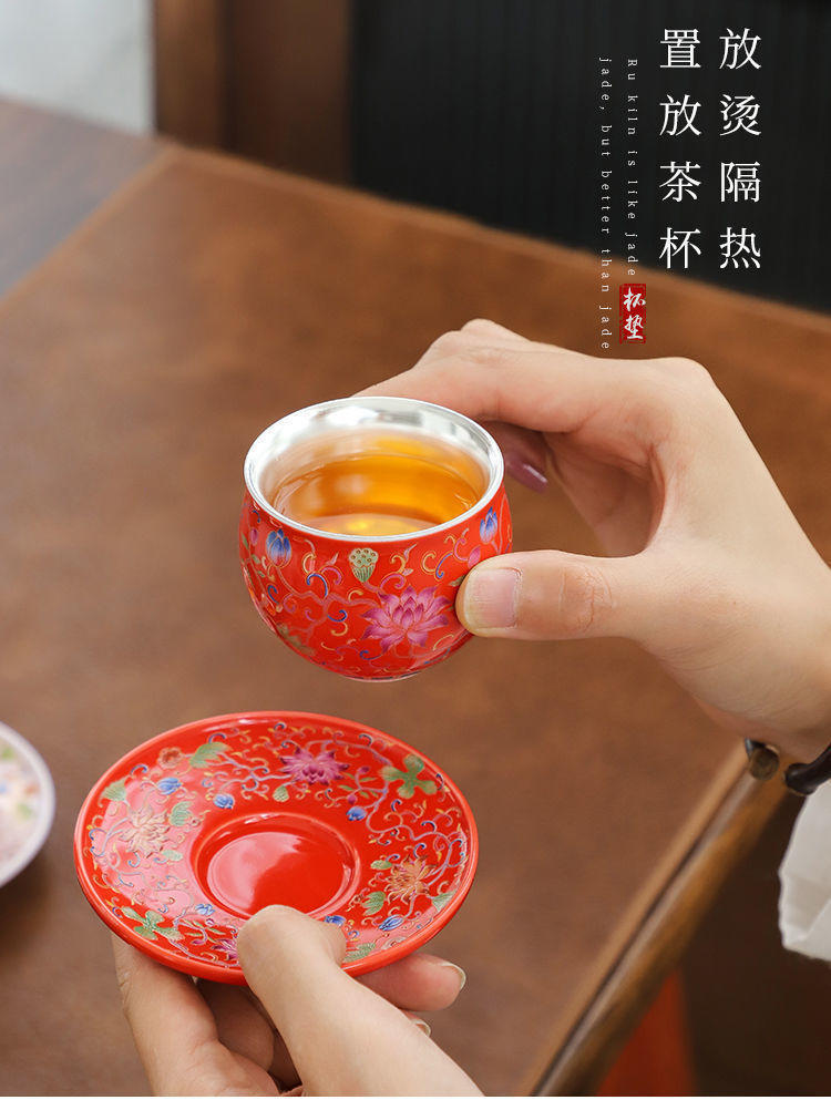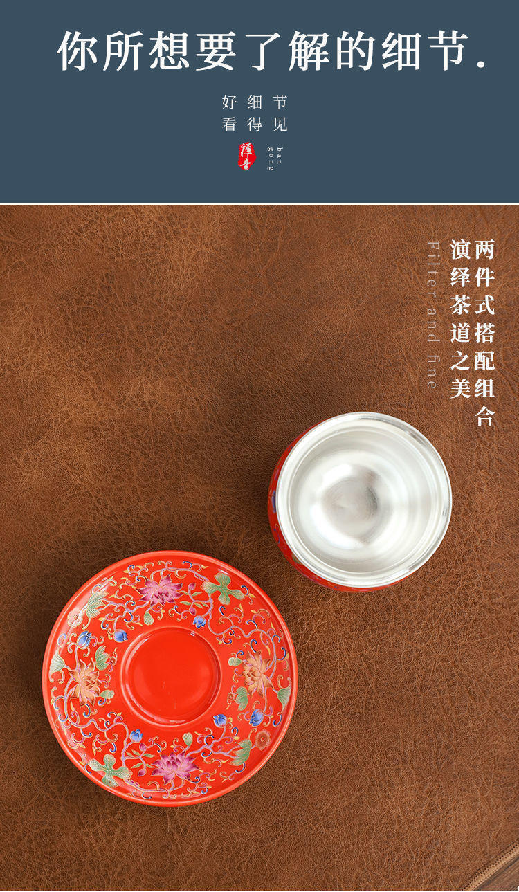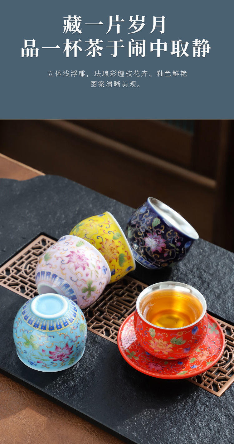 Cốc bạc có đế lót ly 999 cốc trà mạ bạc thủ công bằng bạc nguyên chất men màu Kung Fu tách trà bát trà cốc chủ nhân