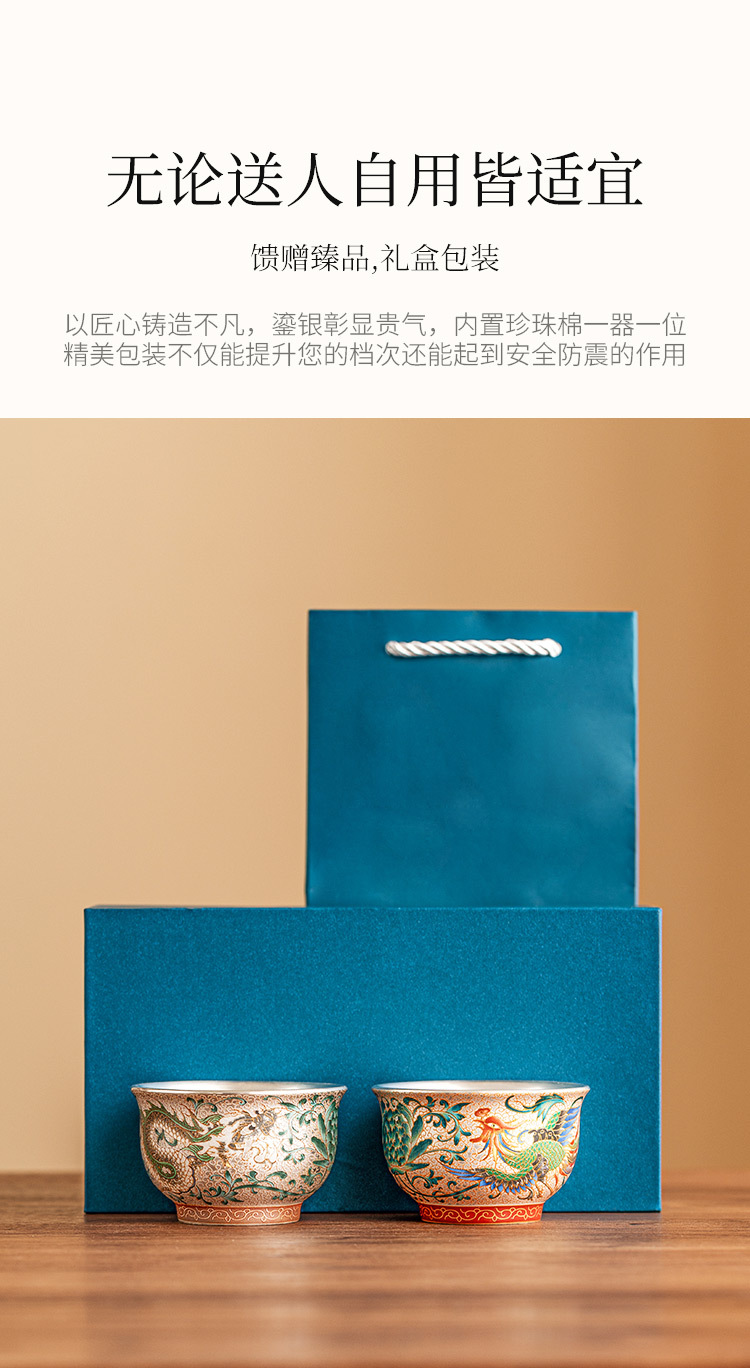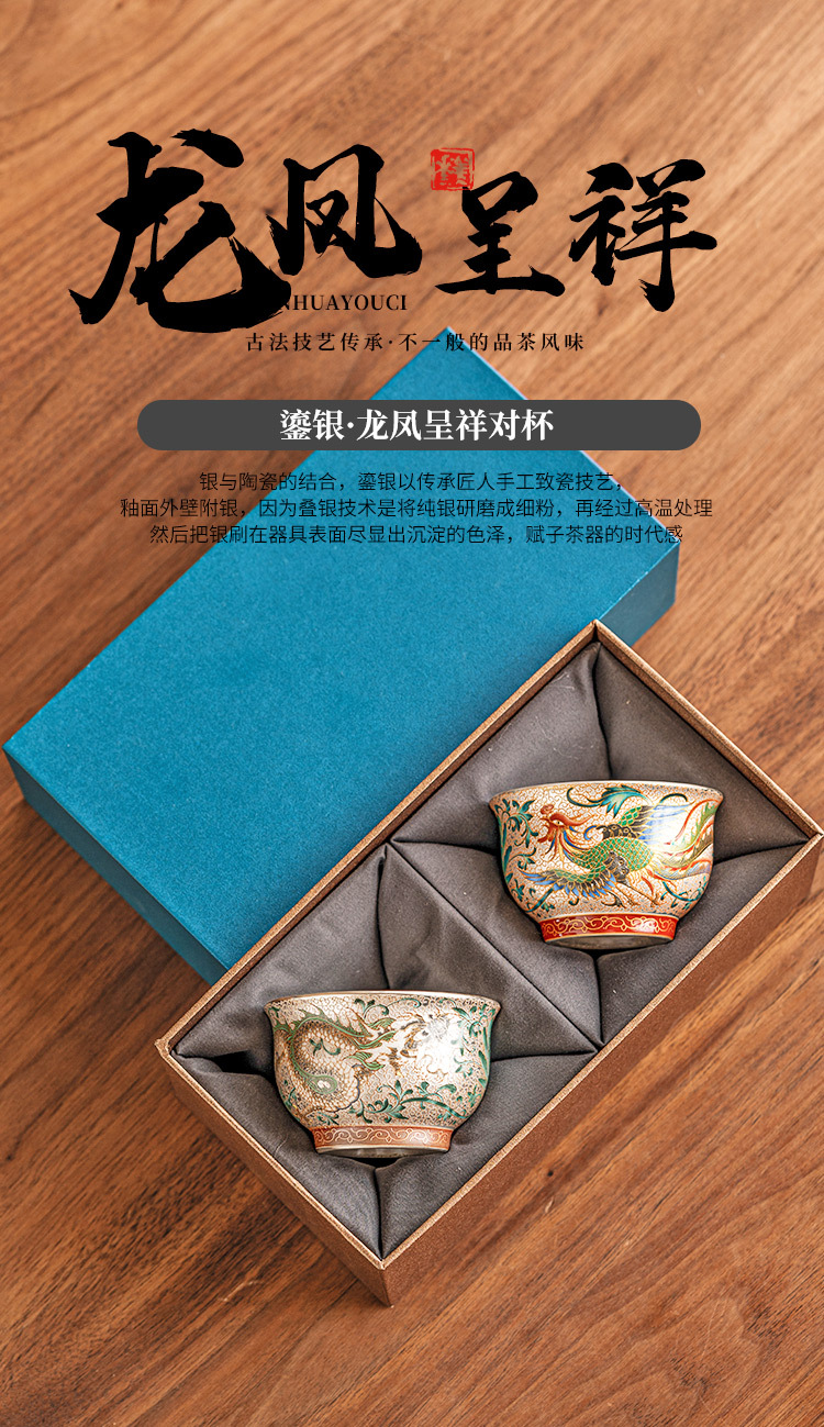 Cốc cặp đôi rồng và phượng hoàng, cốc trà mạ bạc 999, cốc chủ nhân, cốc trà cao cấp sang trọng nhẹ, hộp quà Bộ trà