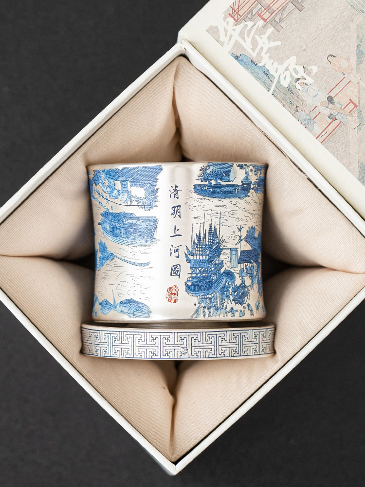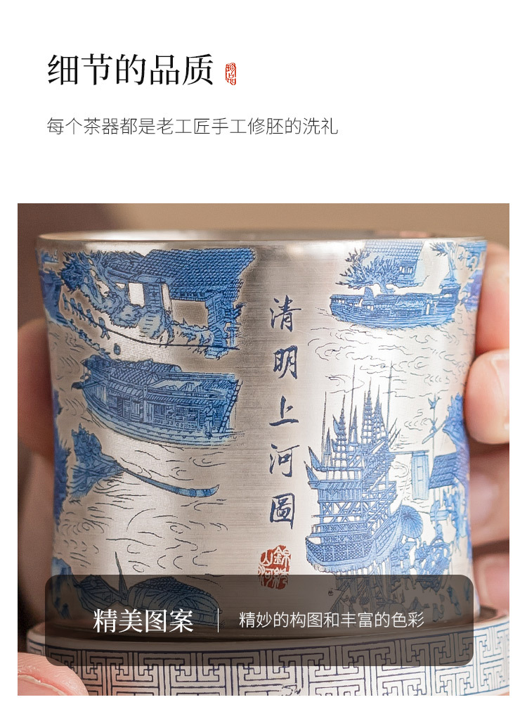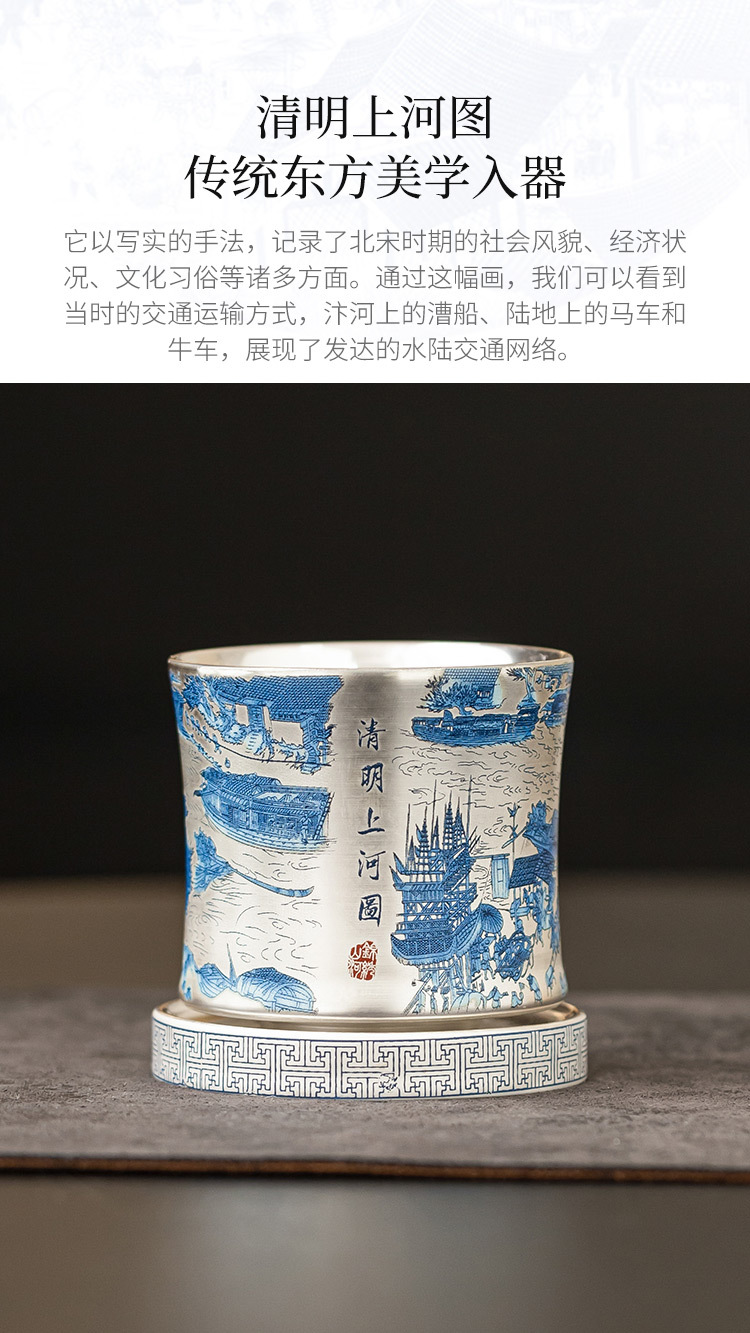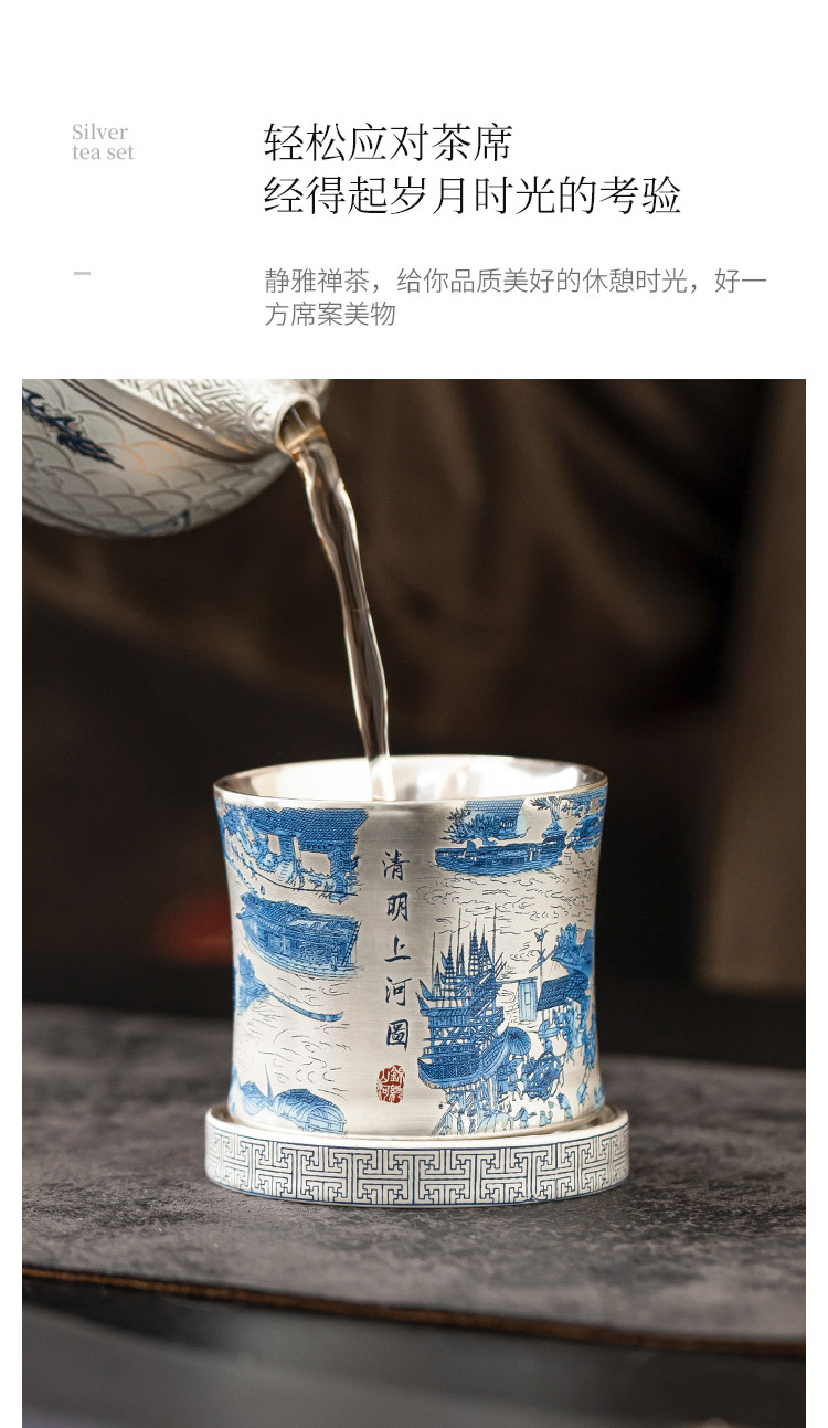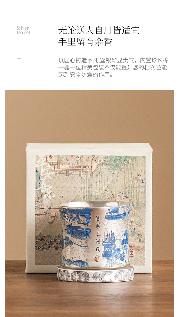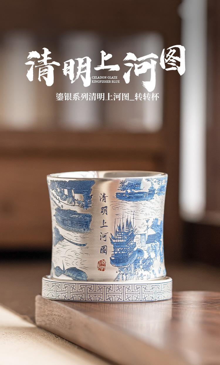 Cốc chủ nhân mạ bạc 999, cốc quay Qingming Shanghetu, bộ trà sang trọng nhẹ, cốc trà Kung Fu gia dụng, quà tặng tay