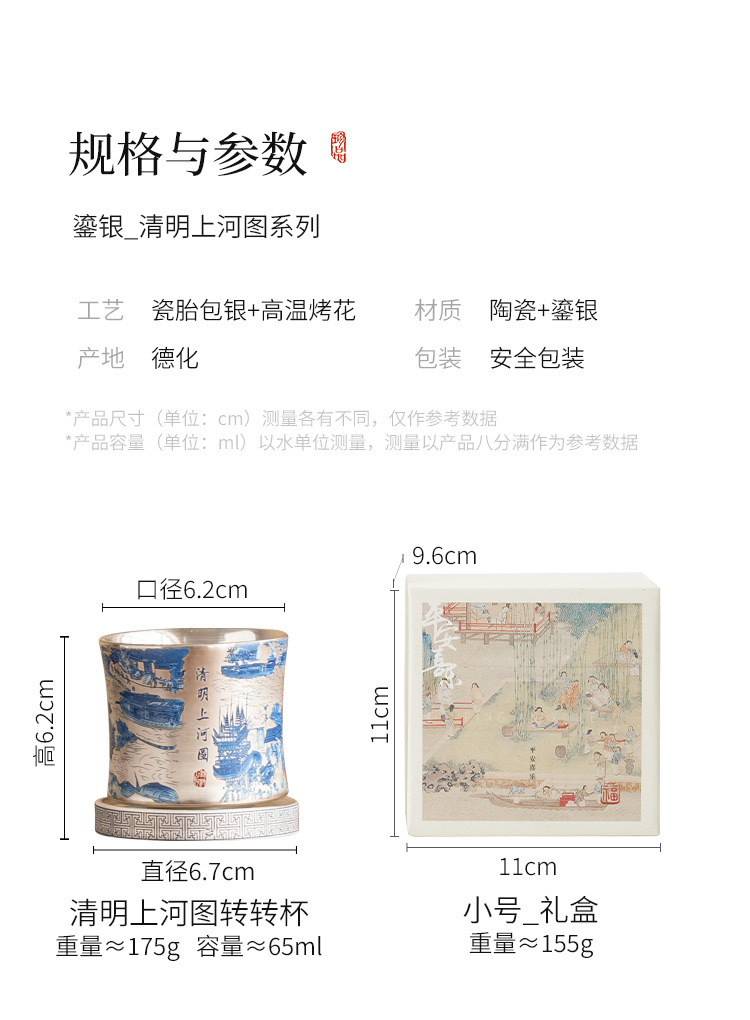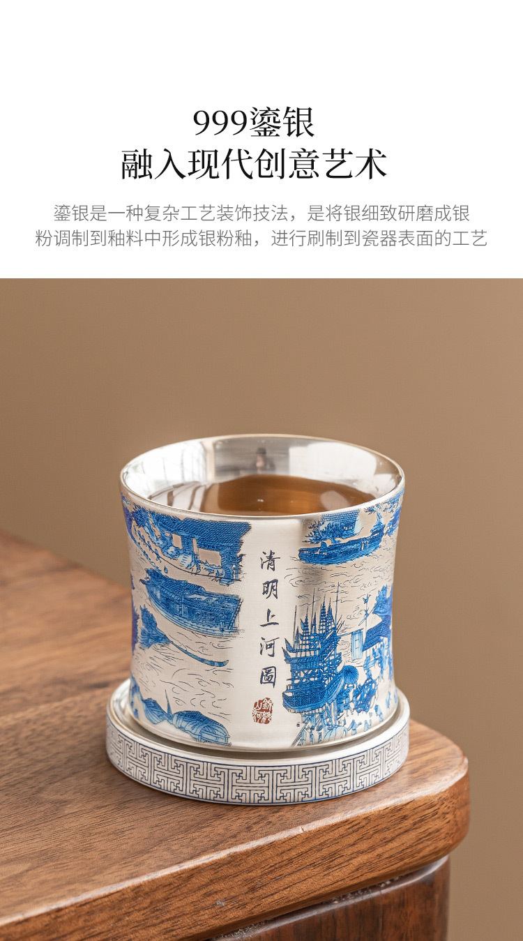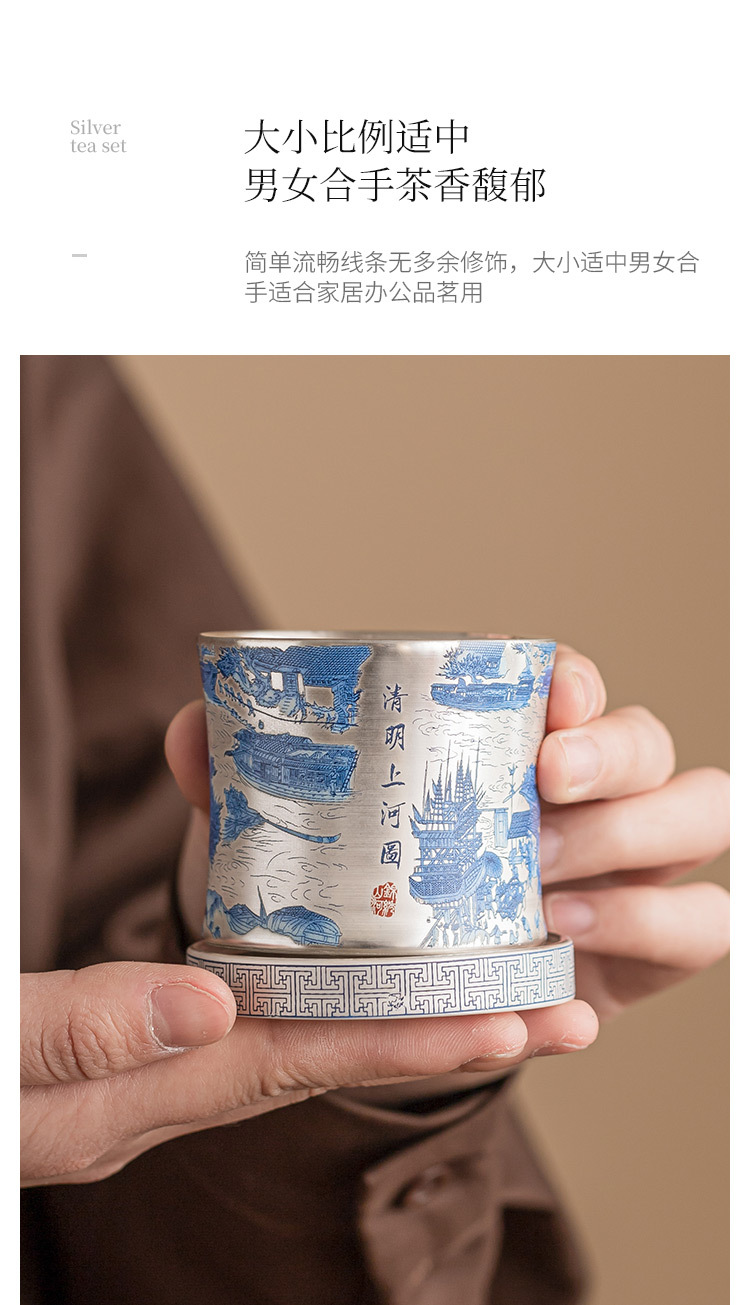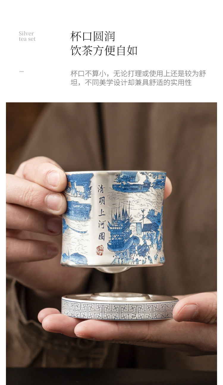 - Cốc chủ nhân mạ bạc 999, cốc quay Qingming Shanghetu, bộ trà sang trọng nhẹ, cốc trà Kung Fu gia dụng, quà tặng tay