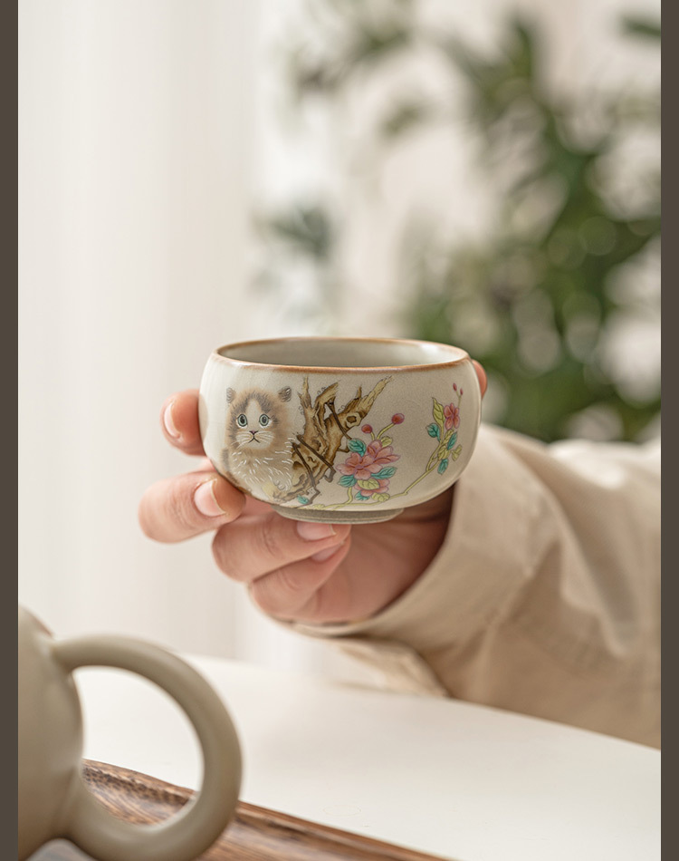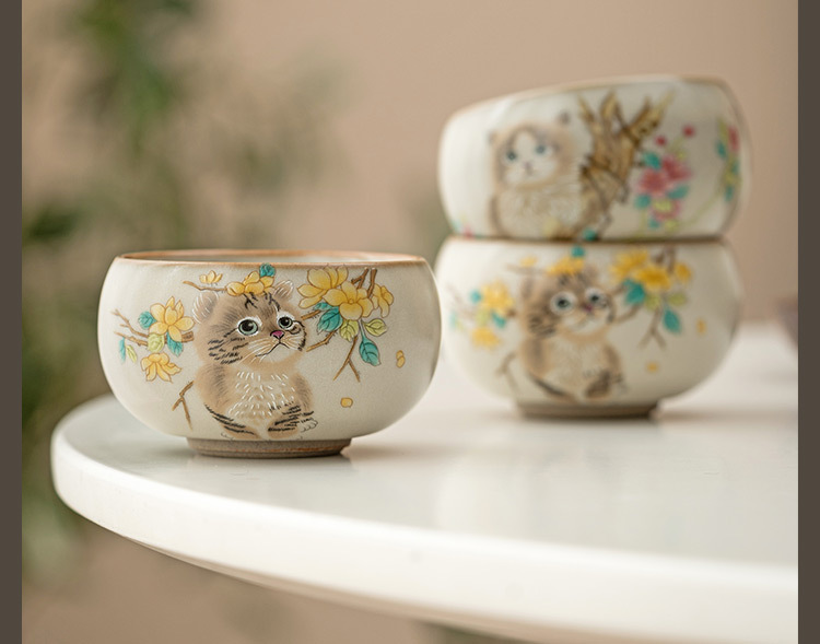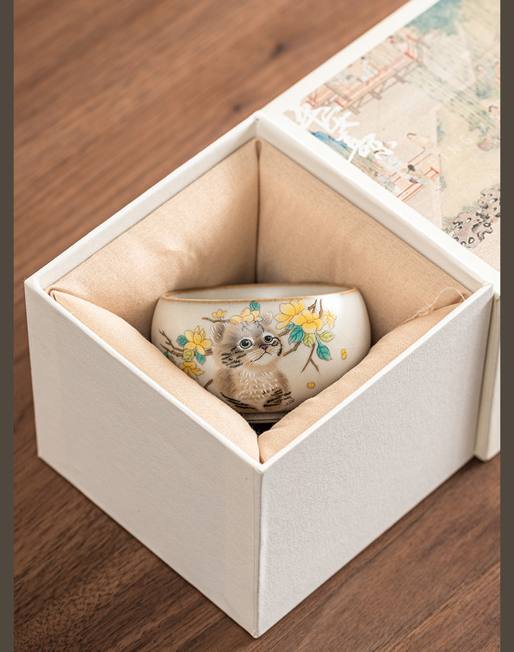 Cốc chủ nhân mèo dễ thương hoa vàng Ru Kiln cốc đơn gia dụng có thể mở cốc uống trà cốc gốm sứ dễ thương cao cấp cốc trà