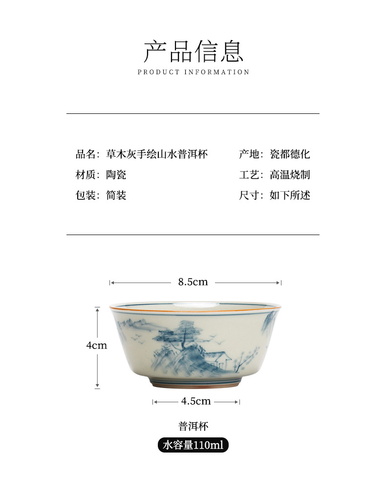 草木灰茶杯手绘主人杯单杯个人专用大号品茗杯普洱杯功夫茶具茶盏
