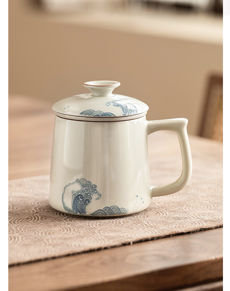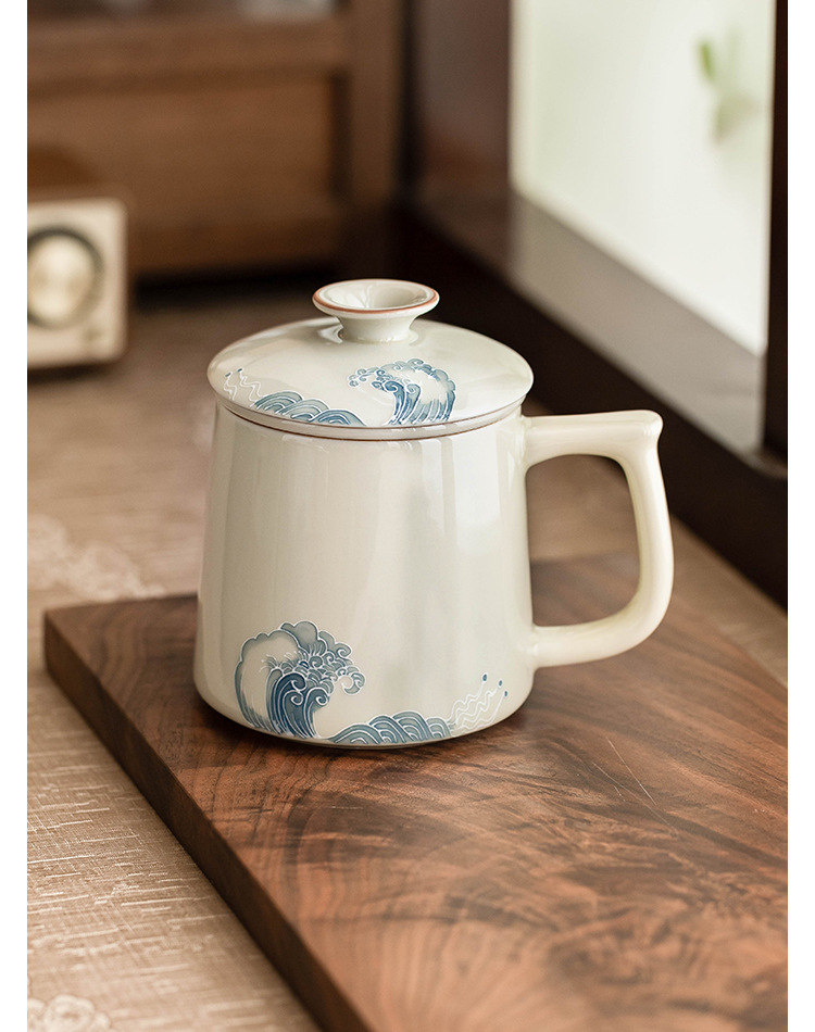Cốc nước chạm khắc sóng biển vẽ tay cốc gốm sứ gia dụng có nắp cốc trà tách trà lớn cốc văn phòng cốc nước