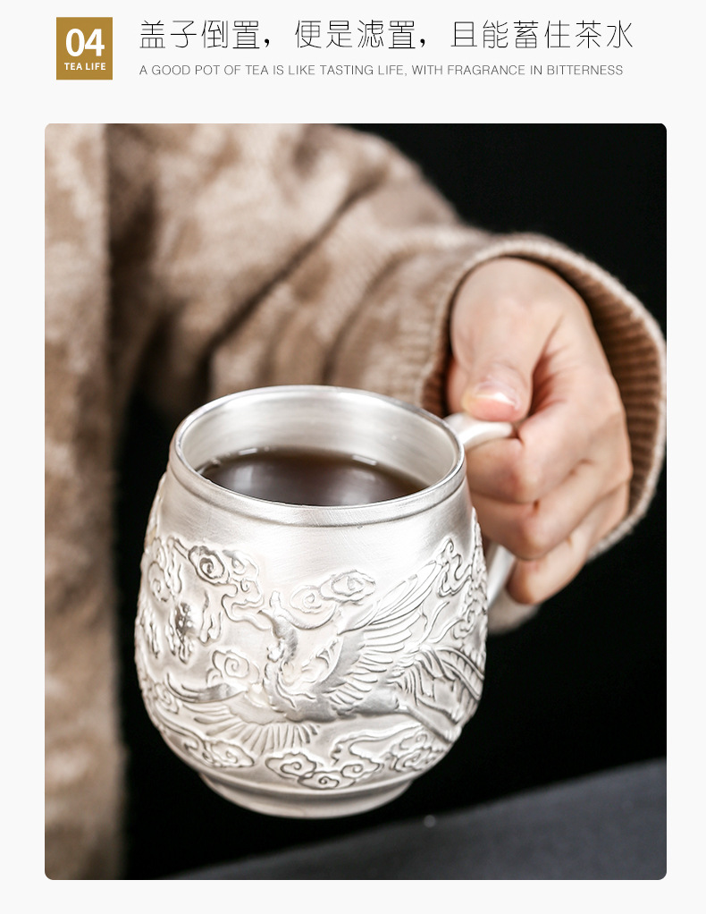 - Cốc nước rồng phượng bạc thủ công cao cấp có nắp lọc trà tách sứ mạ bạc cá nhân trà văn phòng gia dụng