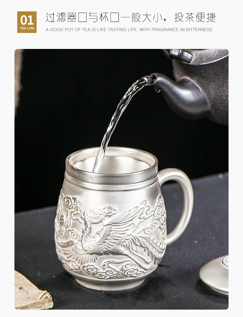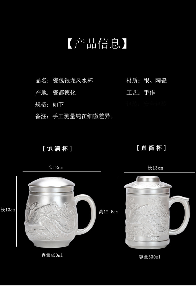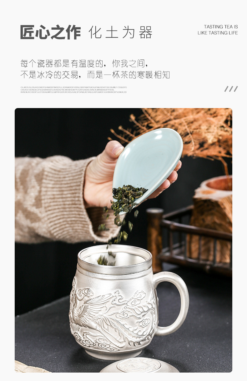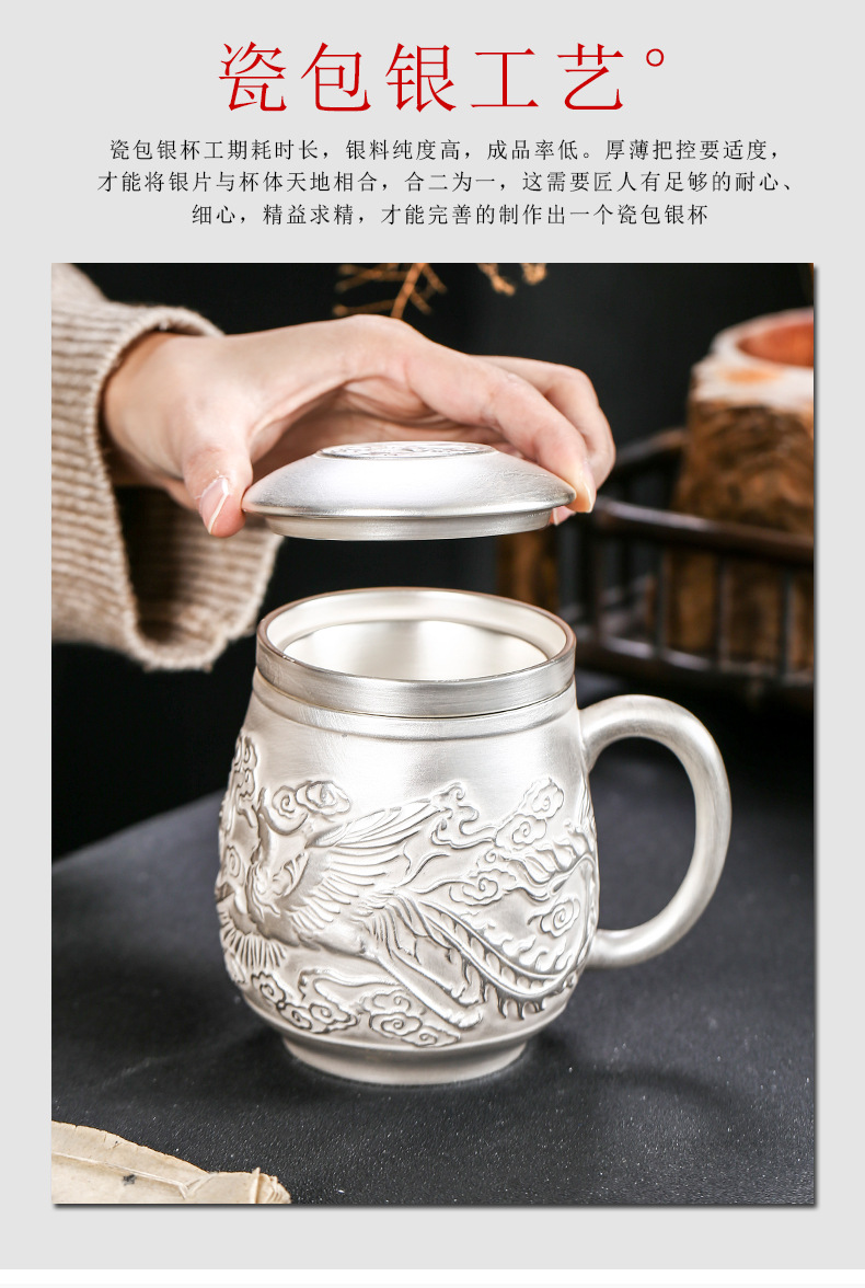 Cốc nước rồng phượng bạc thủ công cao cấp có nắp lọc trà tách sứ mạ bạc cá nhân trà văn phòng gia dụng