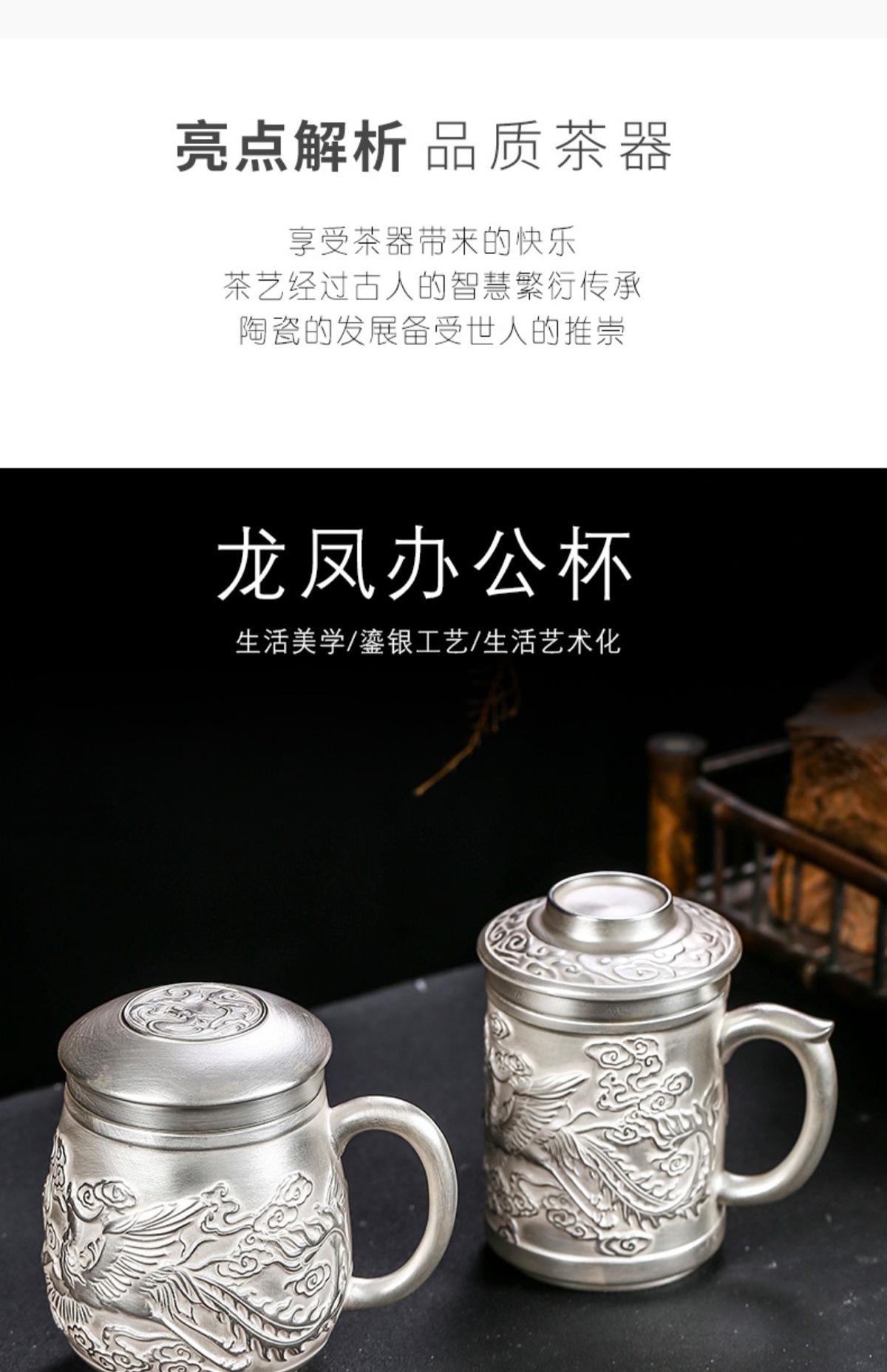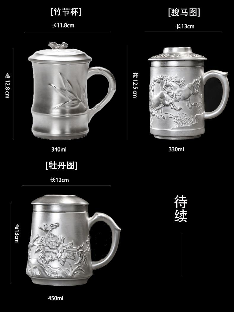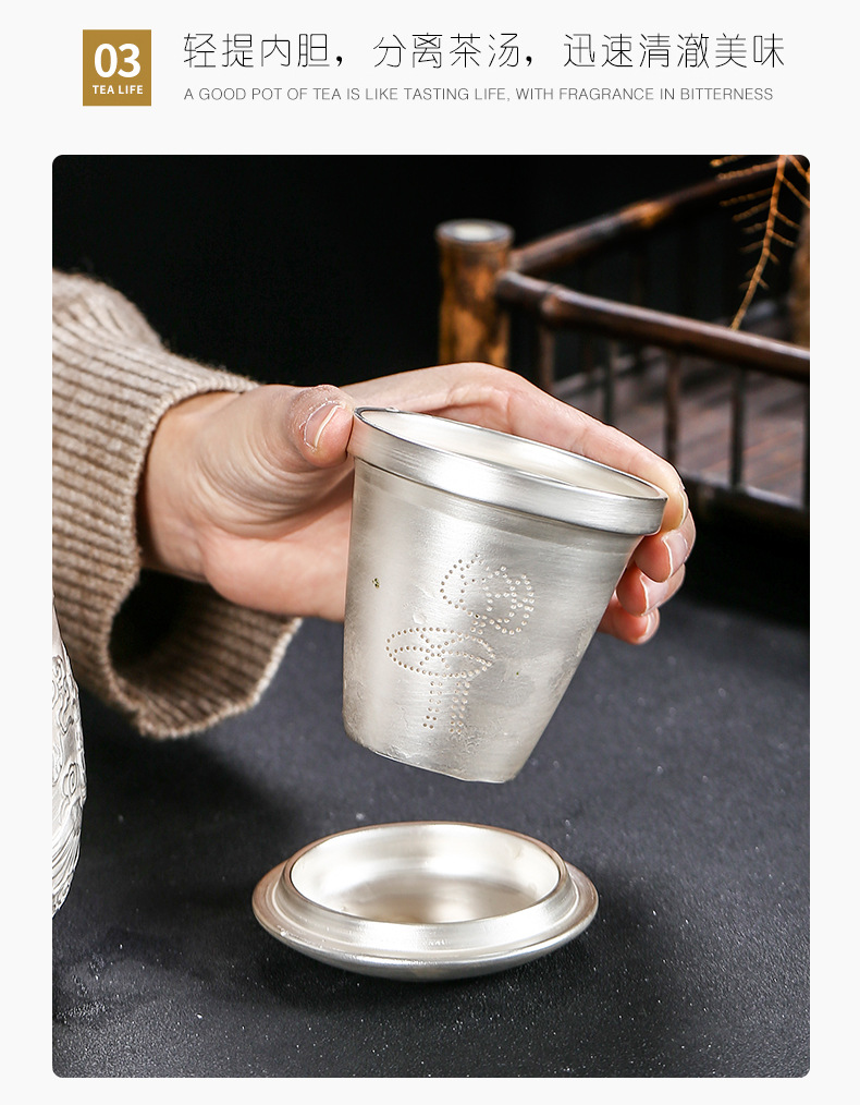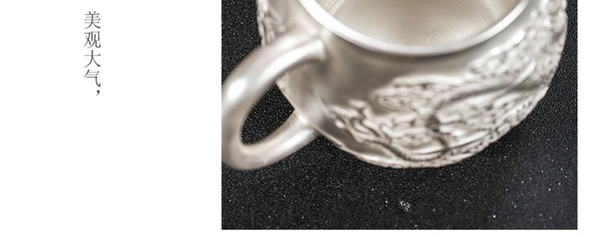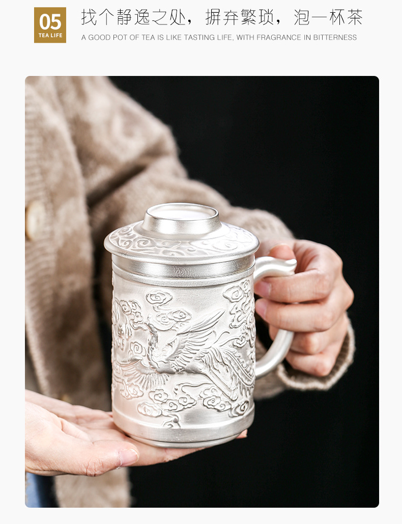 Cốc nước rồng phượng bạc thủ công cao cấp có nắp lọc trà tách sứ mạ bạc cá nhân trà văn phòng gia dụng