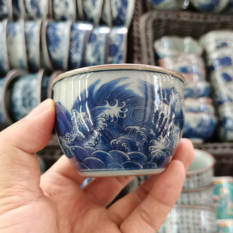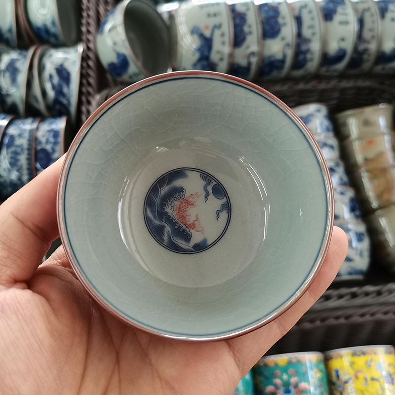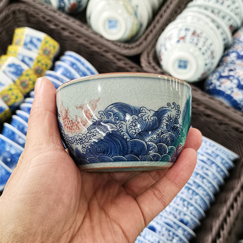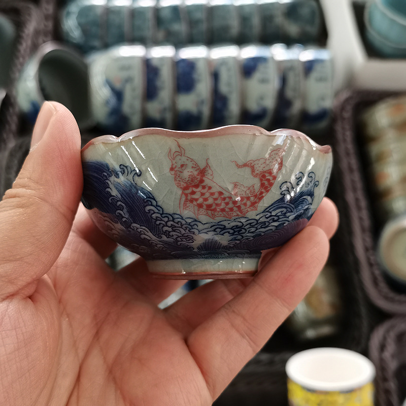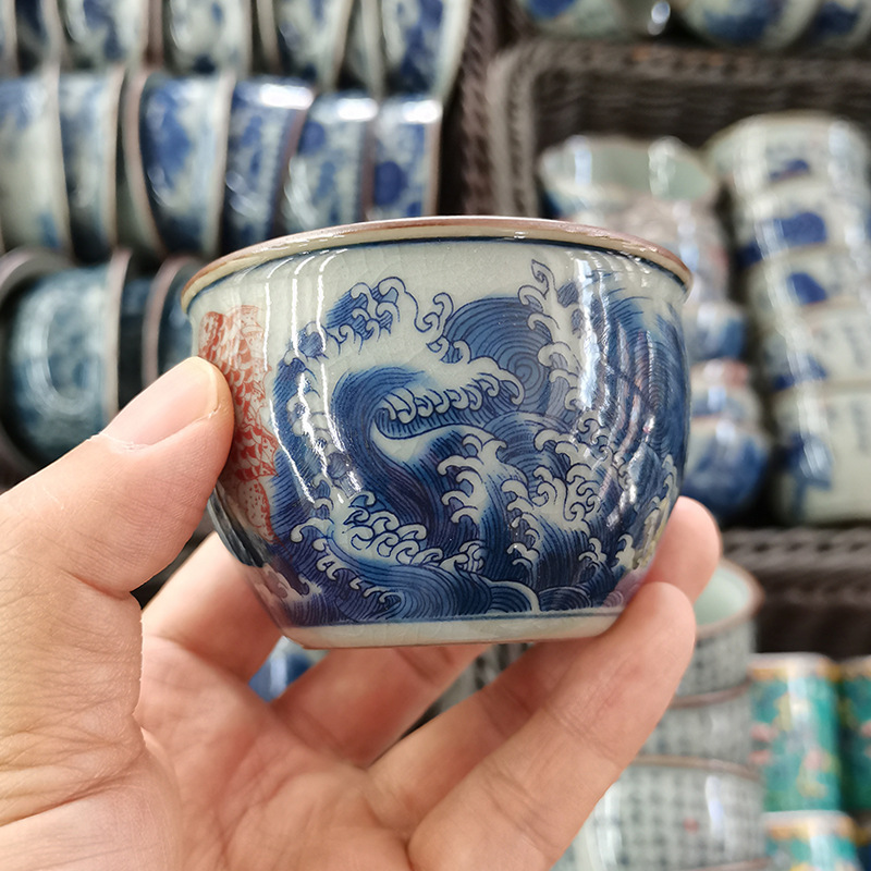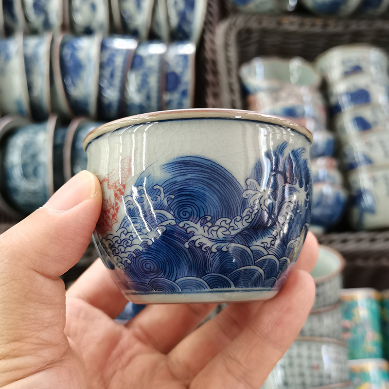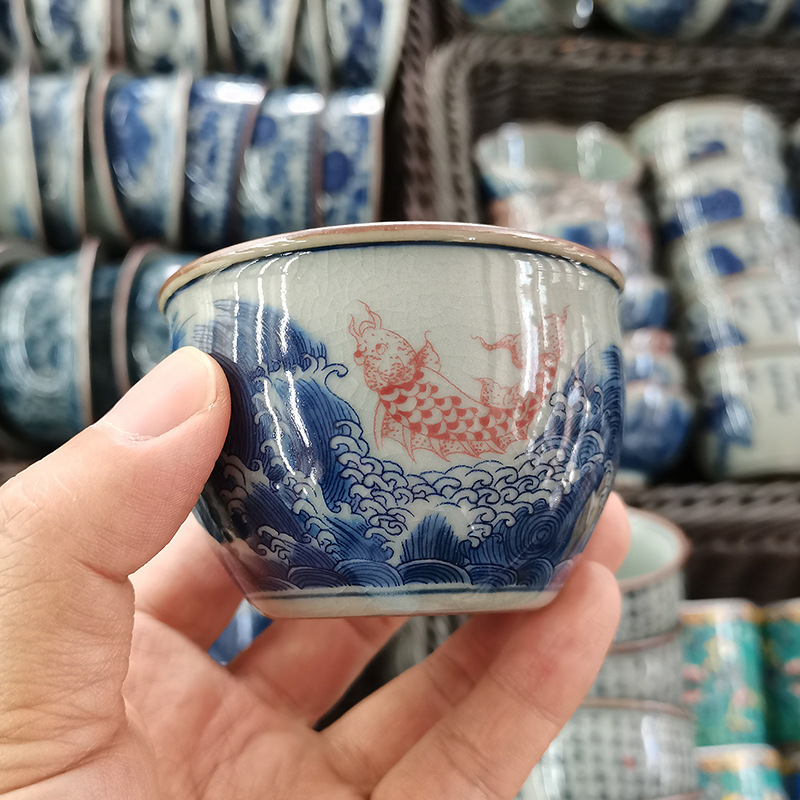 - Cốc sứ cổ điển cao cấp họa tiết cá Koi, men xanh trắng, vẽ tay, chất liệu gốm Jingdezhen, kiểu dáng Kungfu.