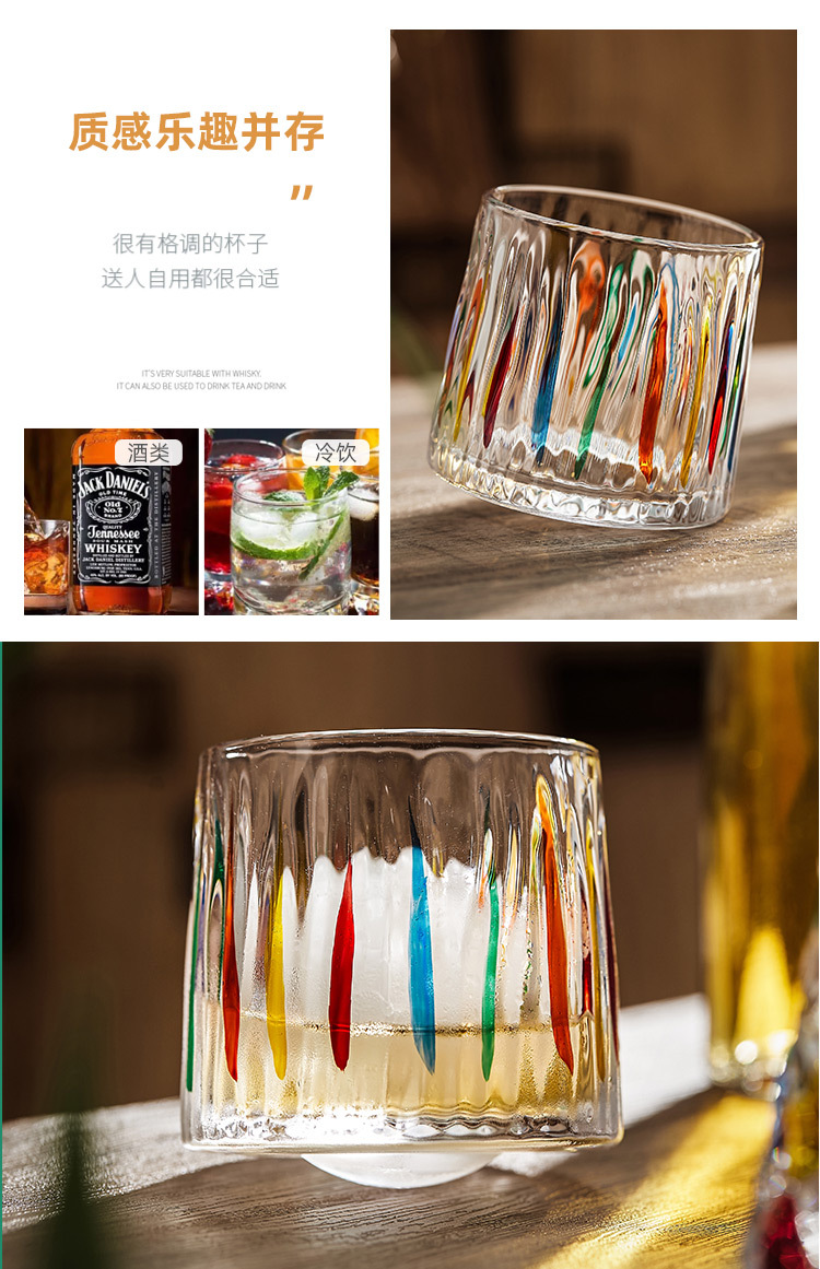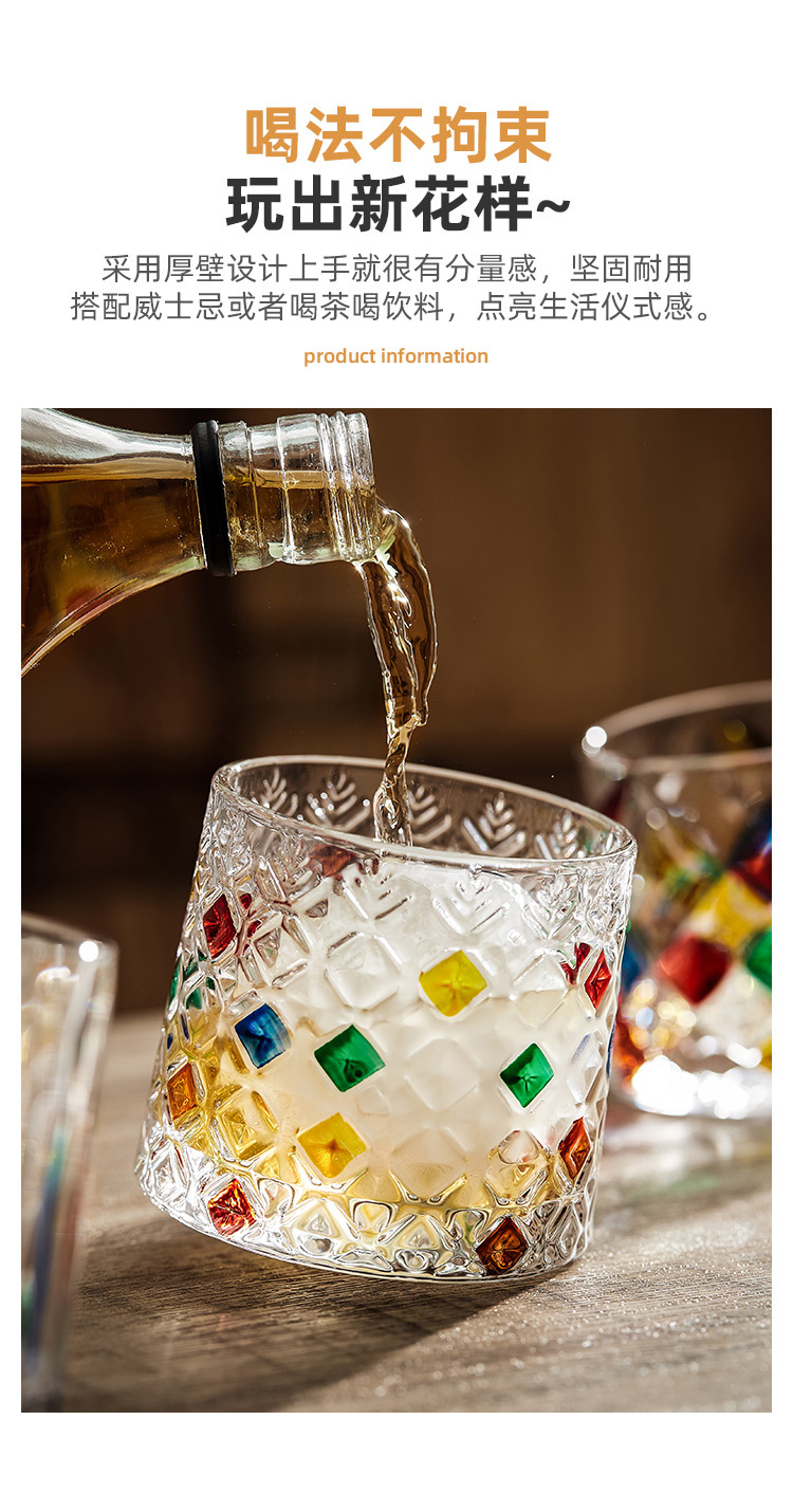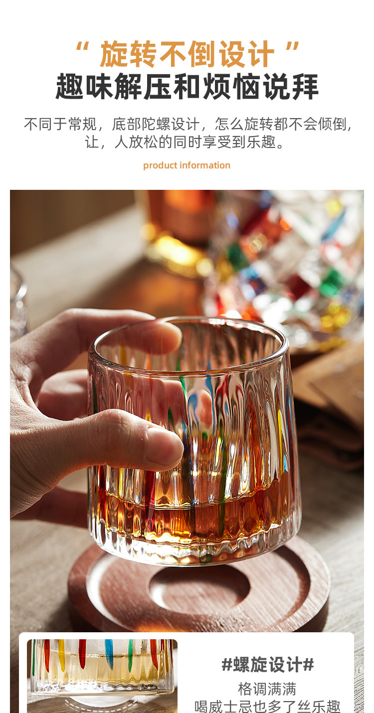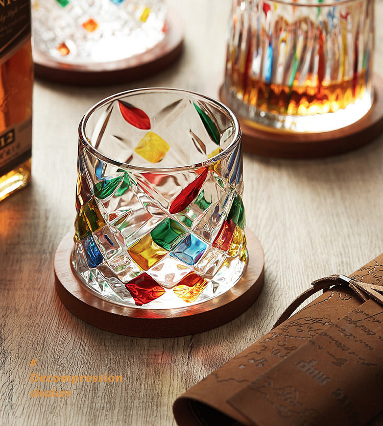 Cốc thủy tinh màu có giá trị cao, ly rượu Whisky phong cách ins, ly rượu ngoại có khay gỗ, ly giải nén xoay nước uống