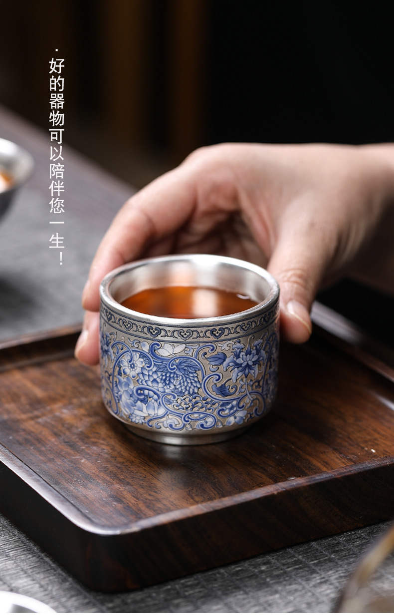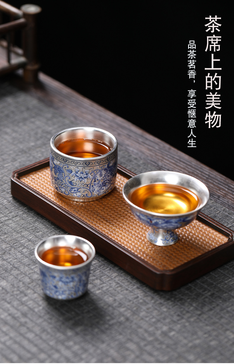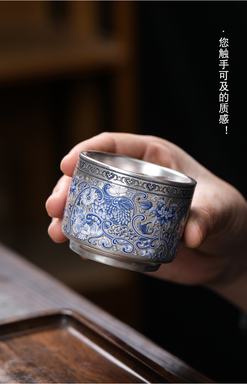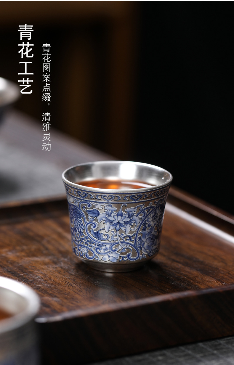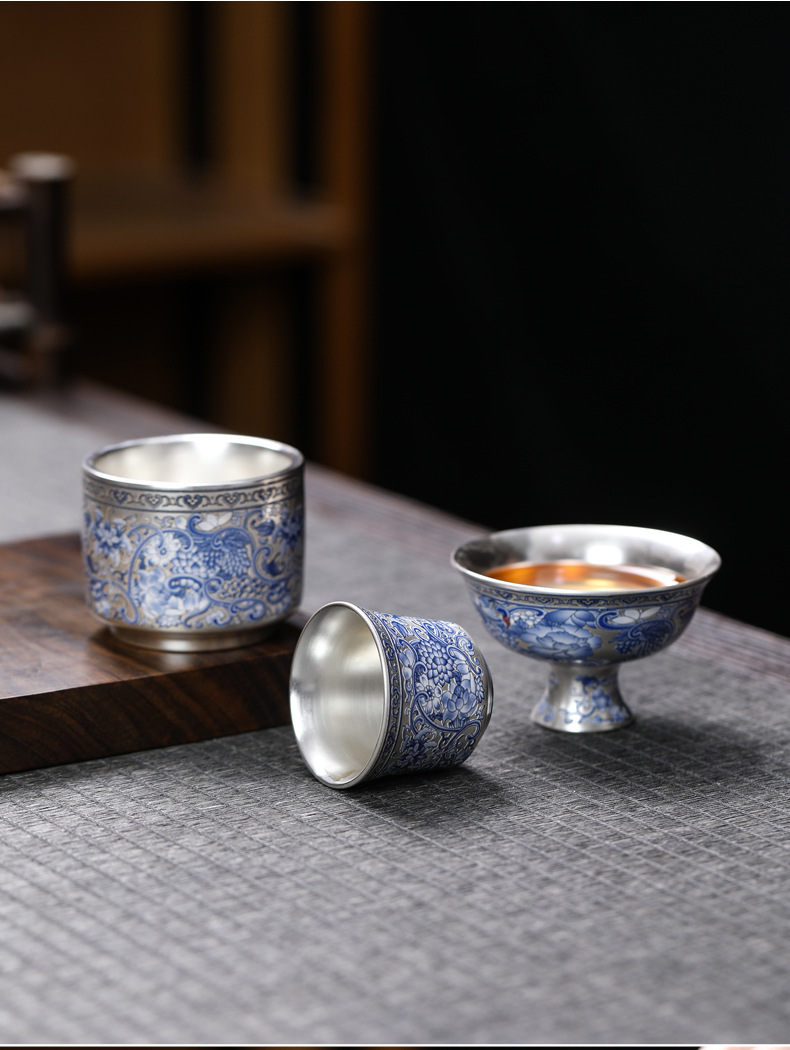 - Cốc trà 999 màu xanh và trắng cổ điển mới cốc trà bạc mạ gốm sứ gia dụng đơn tách trà bộ trà Kung Fu cốc trà