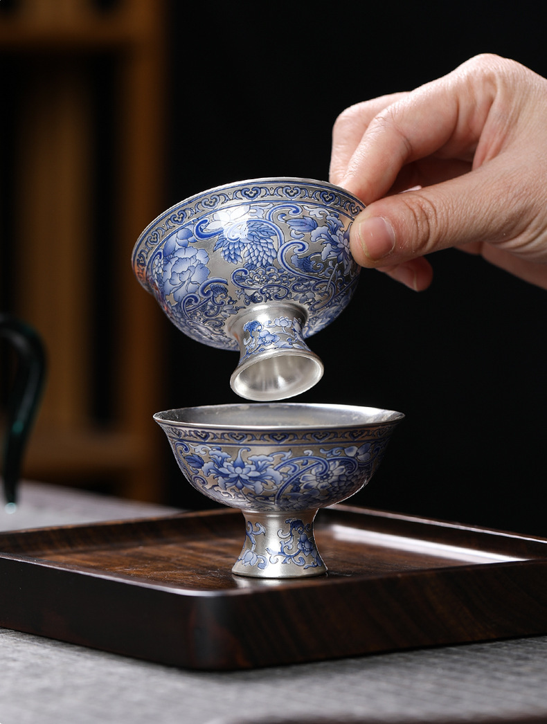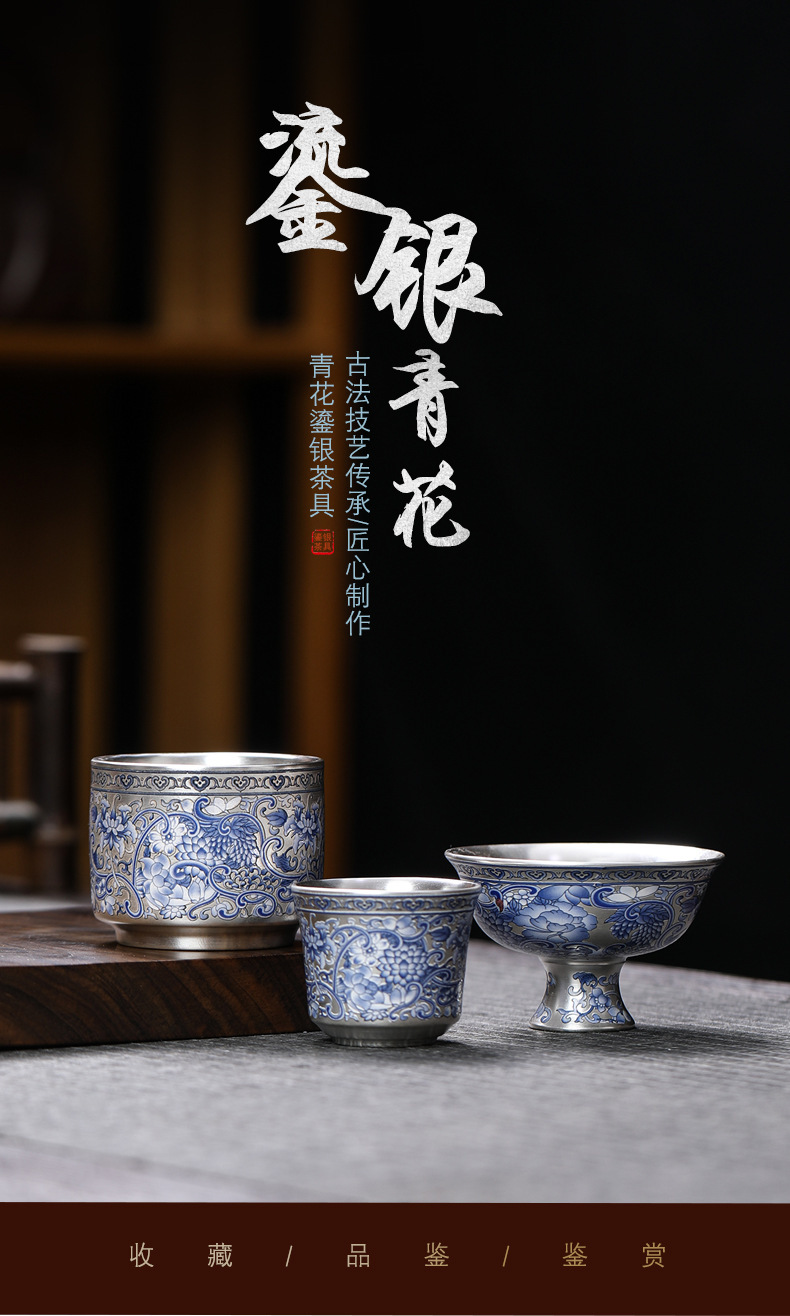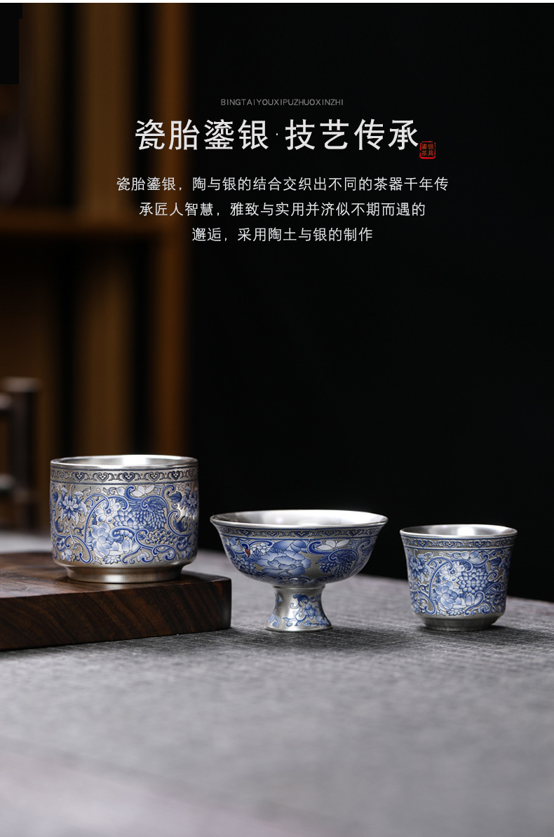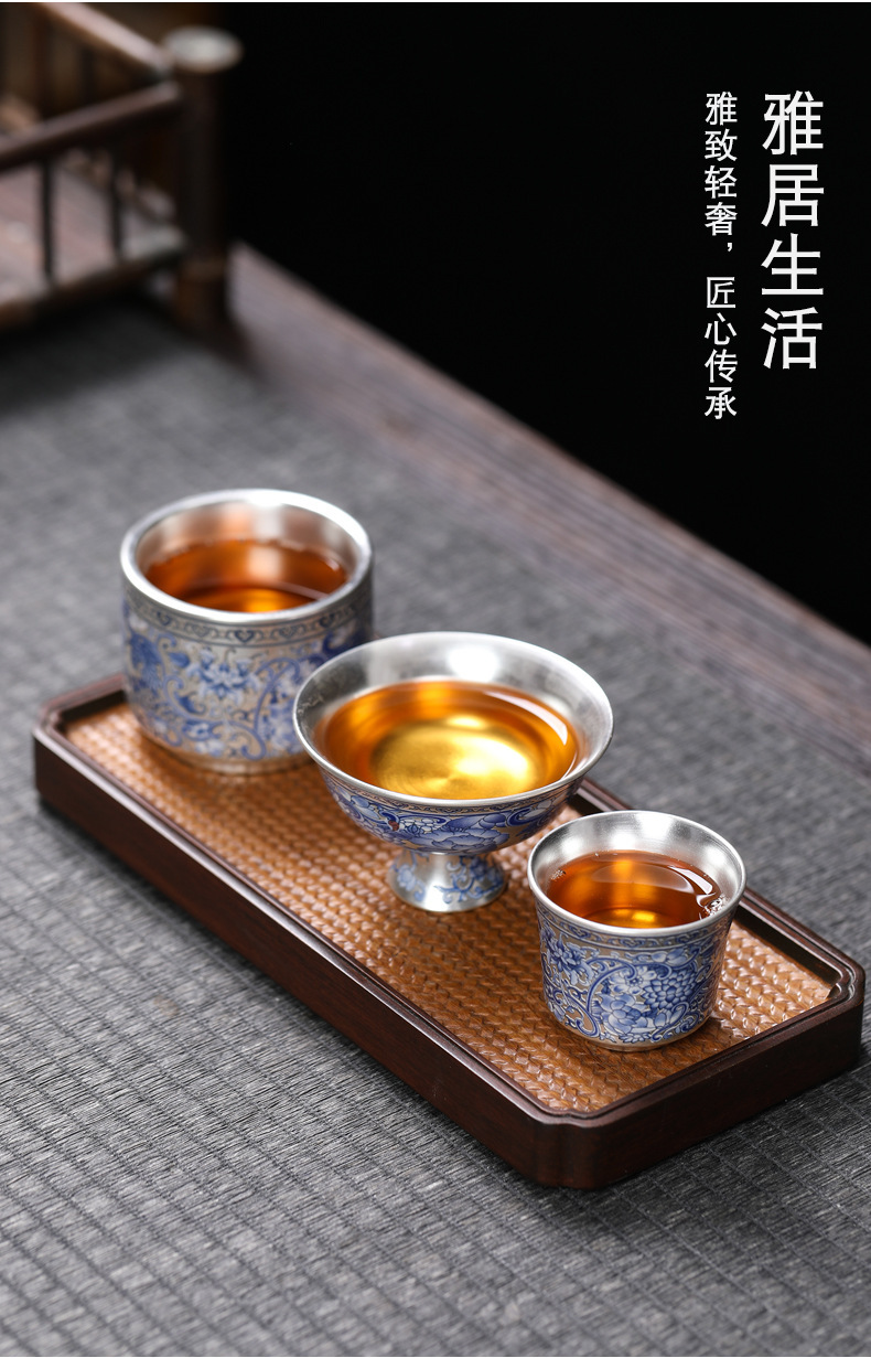 - Cốc trà 999 màu xanh và trắng cổ điển mới cốc trà bạc mạ gốm sứ gia dụng đơn tách trà bộ trà Kung Fu cốc trà