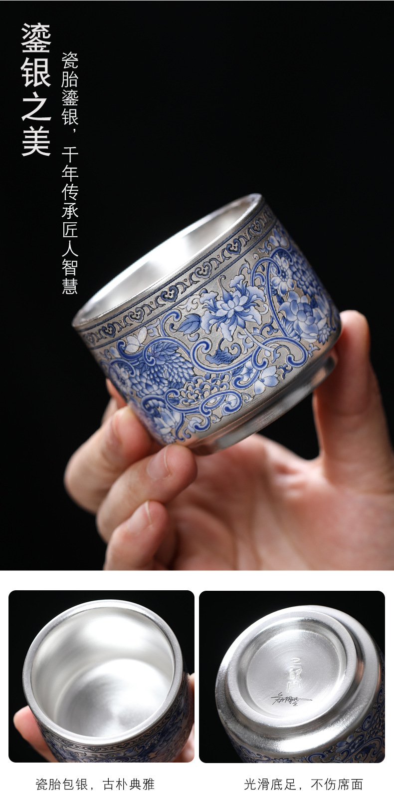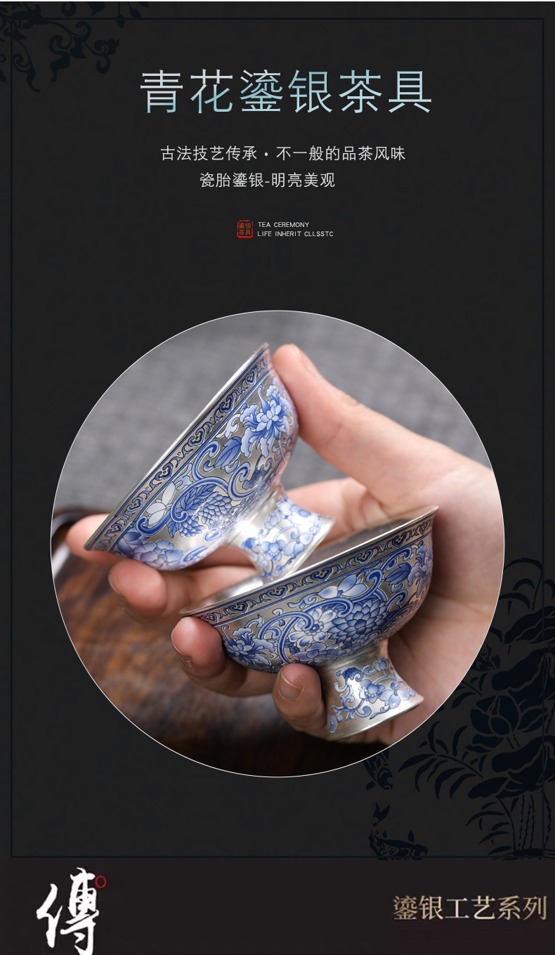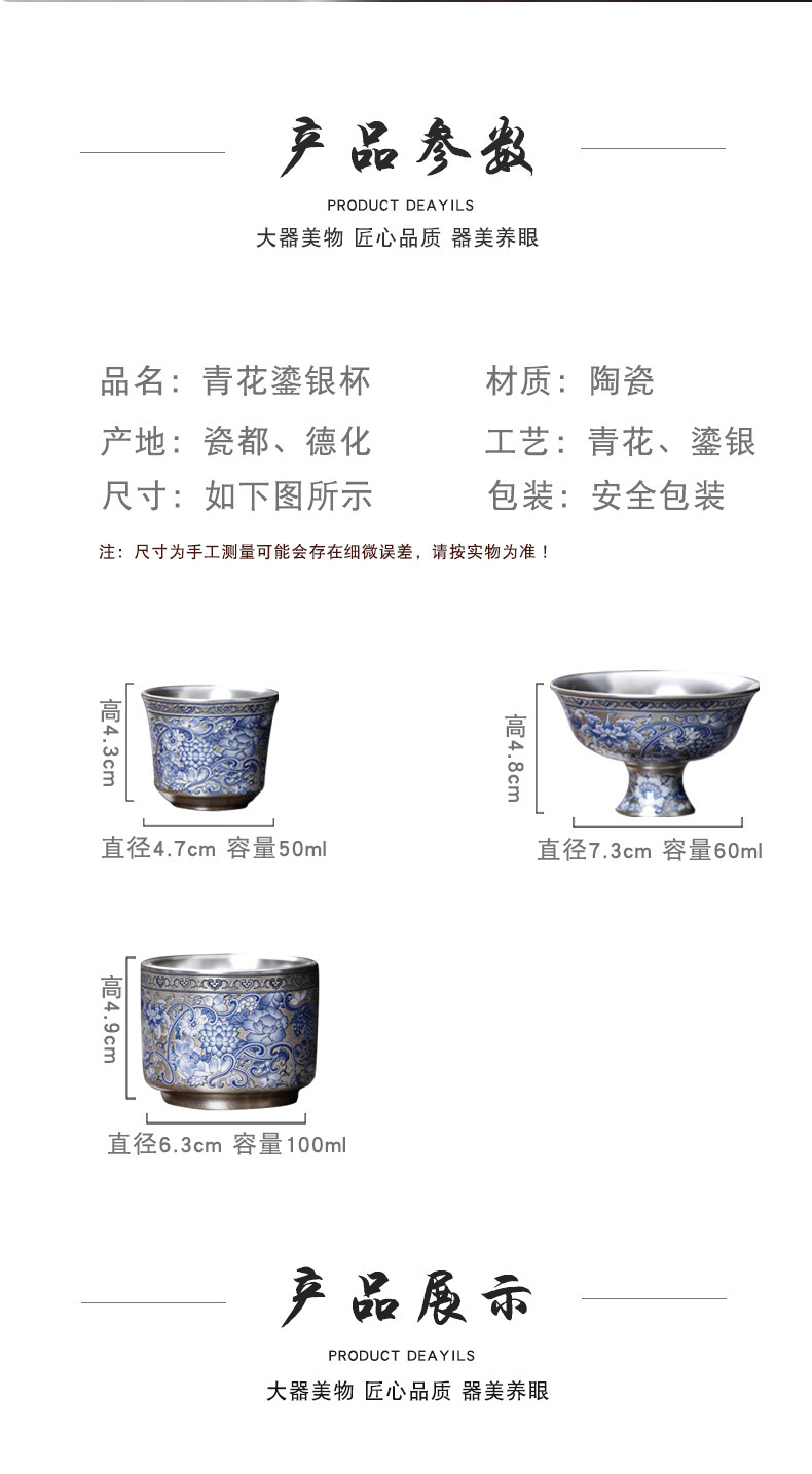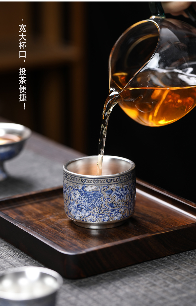 - Cốc trà 999 màu xanh và trắng cổ điển mới cốc trà bạc mạ gốm sứ gia dụng đơn tách trà bộ trà Kung Fu cốc trà
