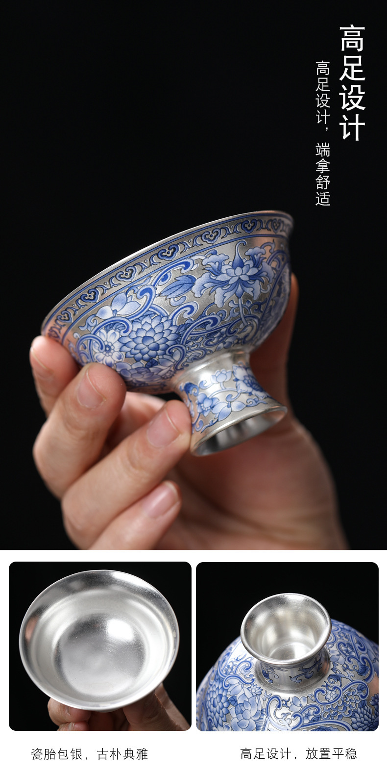 Cốc trà 999 màu xanh và trắng cổ điển mới cốc trà bạc mạ gốm sứ gia dụng đơn tách trà bộ trà Kung Fu cốc trà